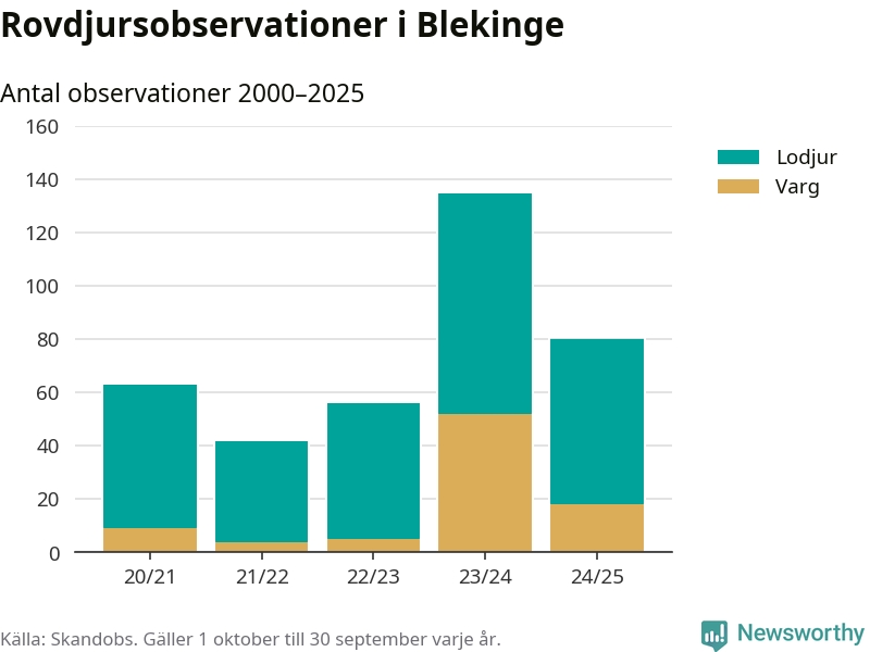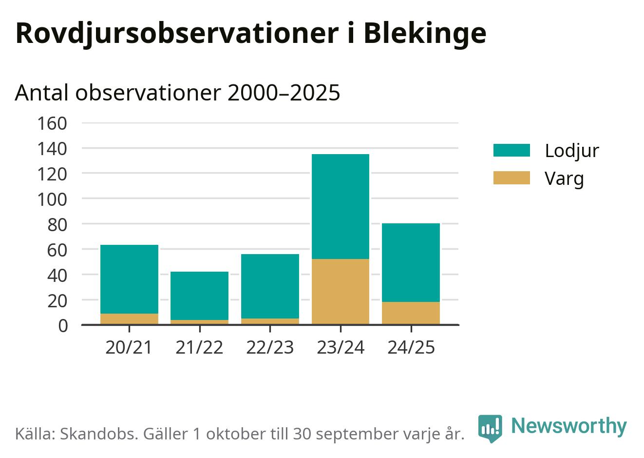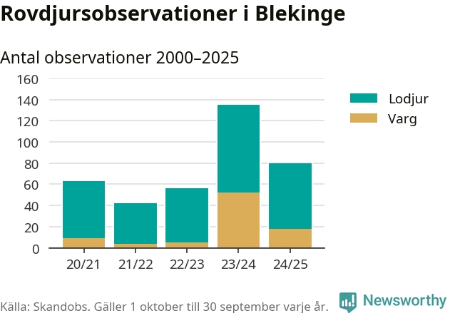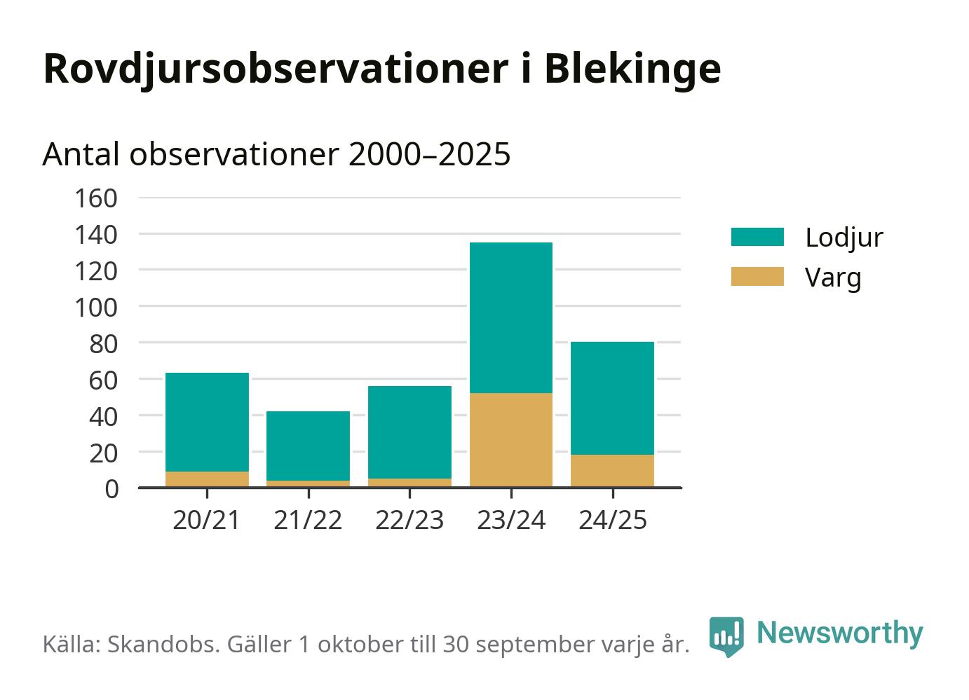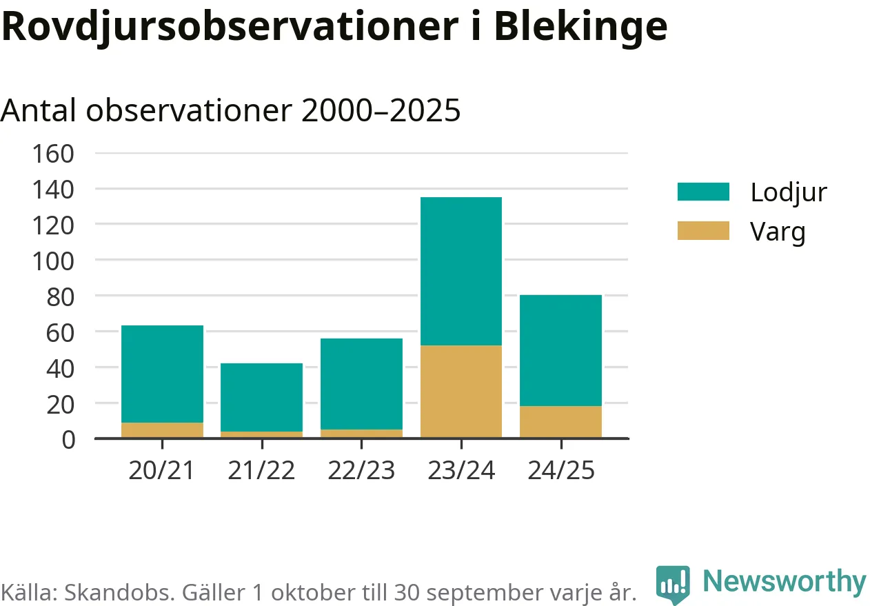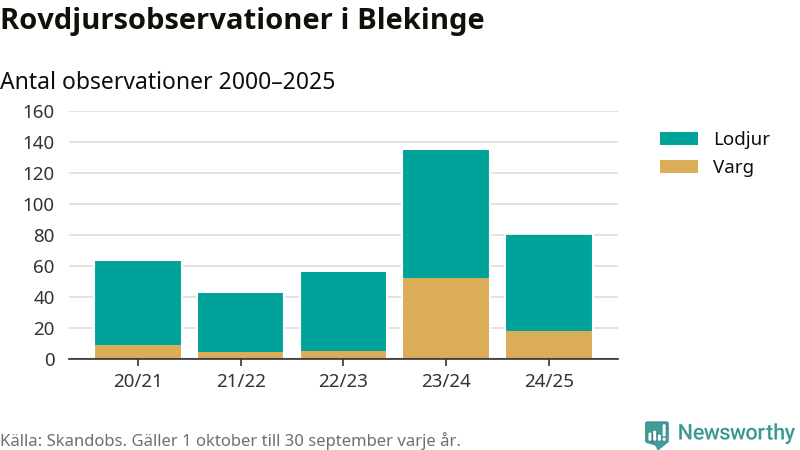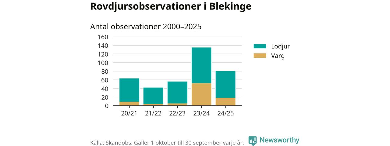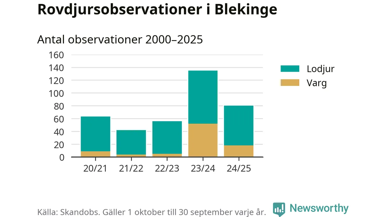 Där kan vem som helst rapportera sina observationer av de stora rovdjuren björn, varg, lodjur och järv. Mellan 1 oktober 2024 och 30 september i år har knappt 10 000 observationer registrerats i landet. Det kan vara synobservationer, foton, spår, spillning, döda bytesdjur eller andra tecken på rovdjursförekomst. I Blekinge handlar det om totalt 80 observationer av lodjur eller varg.
