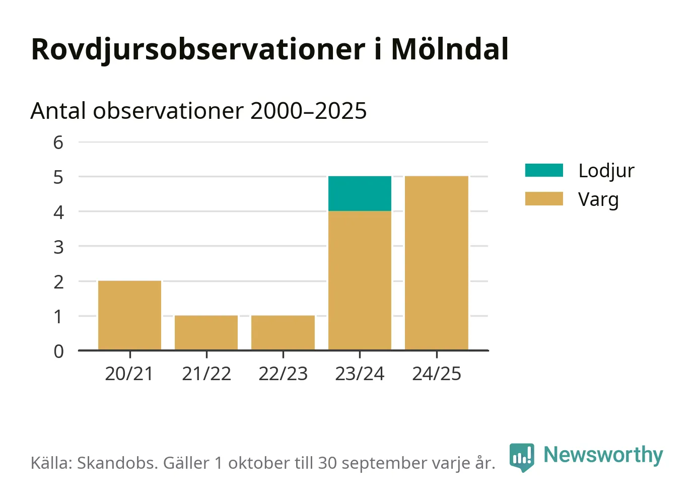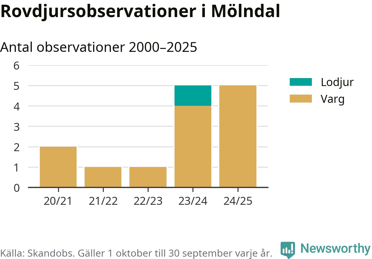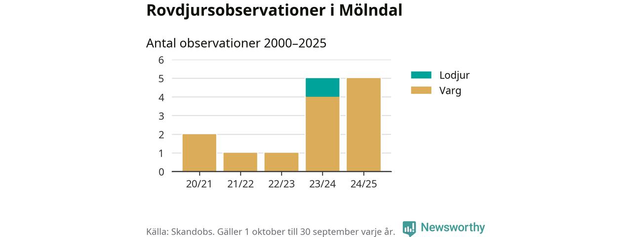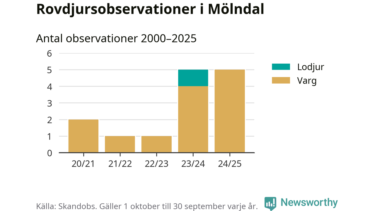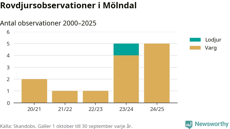 Där kan vem som helst rapportera sina observationer av de stora rovdjuren björn, varg, lodjur och järv. Mellan 1 oktober 2024 och 30 september i år har knappt 10 000 observationer registrerats i landet. Det kan vara synobservationer, foton, spår, spillning, döda bytesdjur eller andra tecken på rovdjursförekomst. I Mölndal handlar det om totalt fem observationer av varg.