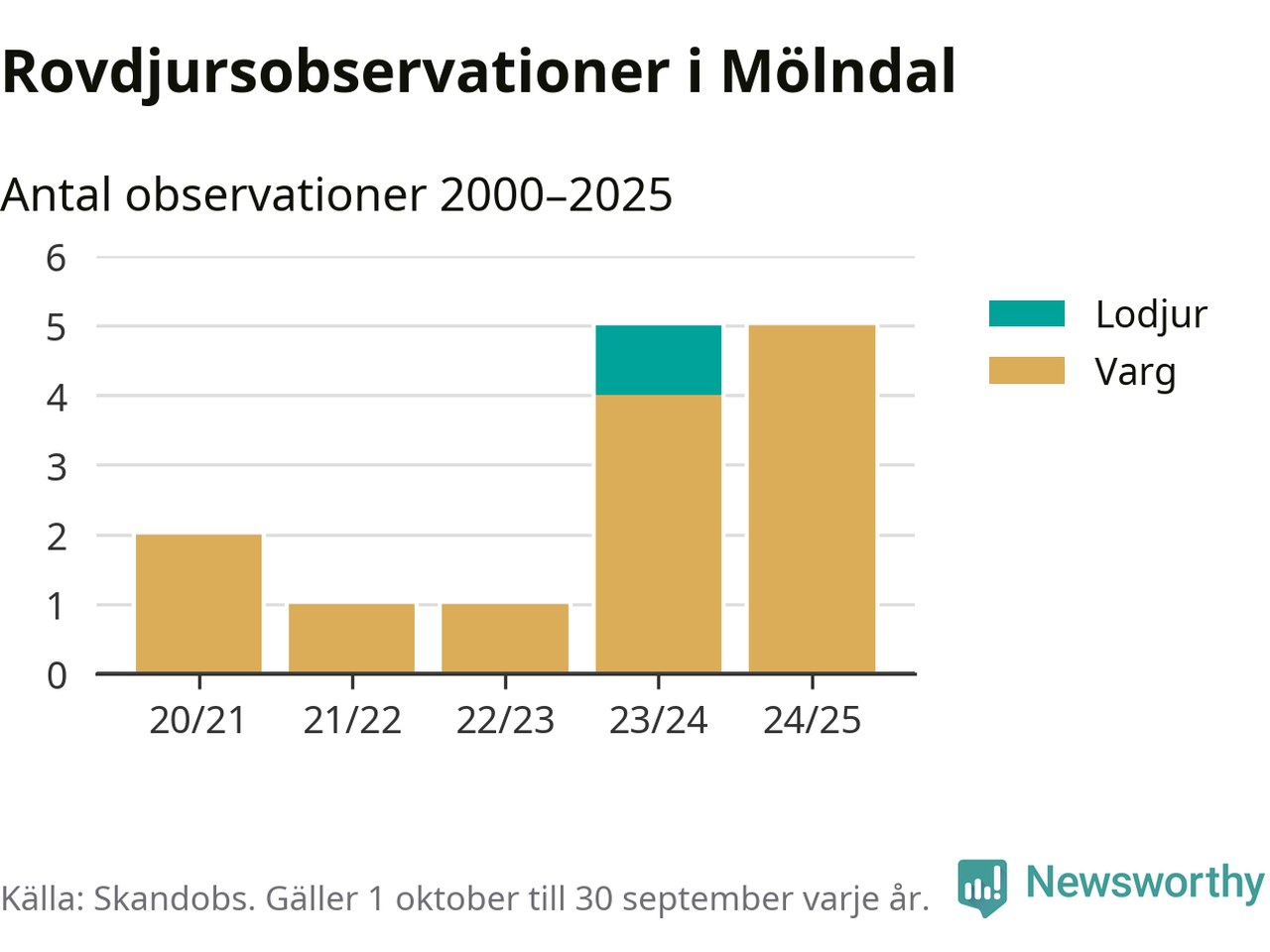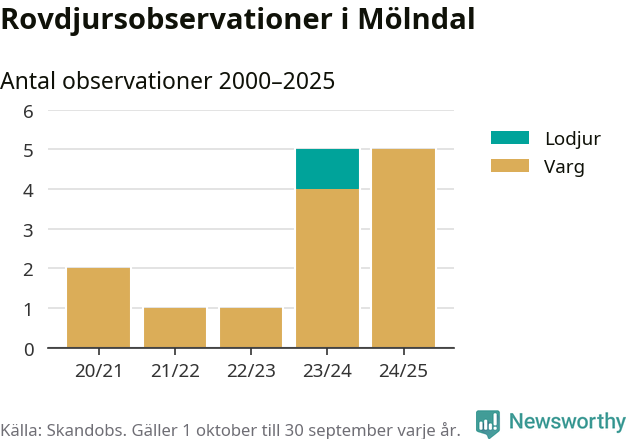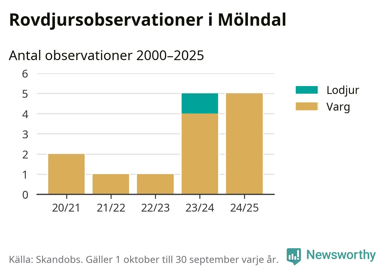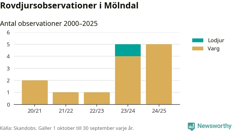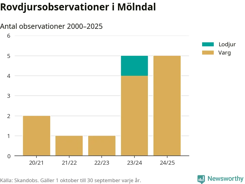 Där kan vem som helst rapportera sina observationer av de stora rovdjuren björn, varg, lodjur och järv. Mellan 1 oktober 2024 och 30 september i år har knappt 10 000 observationer registrerats i landet. Det kan vara synobservationer, foton, spår, spillning, döda bytesdjur eller andra tecken på rovdjursförekomst. I Mölndal handlar det om totalt fem observationer av varg.