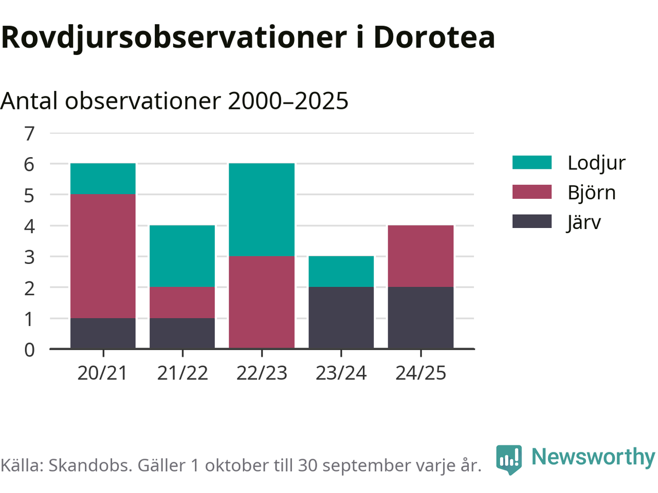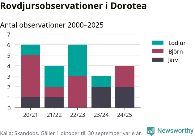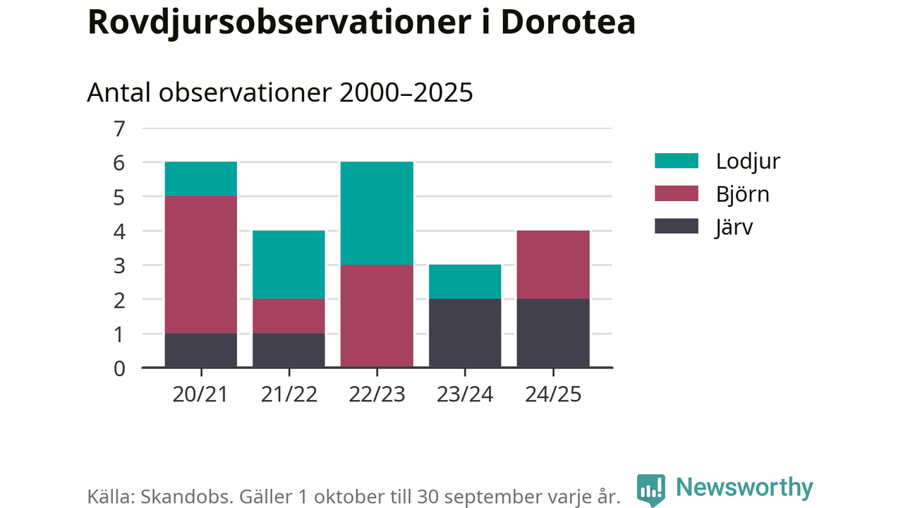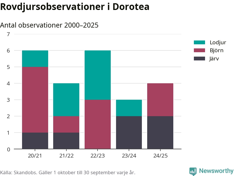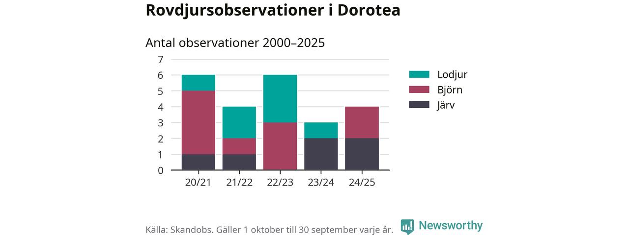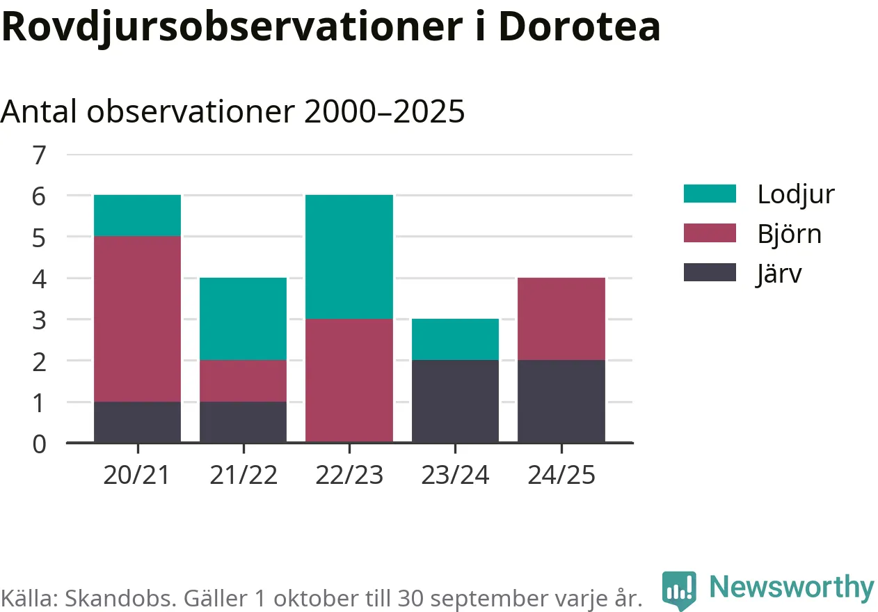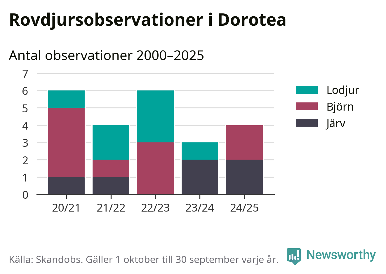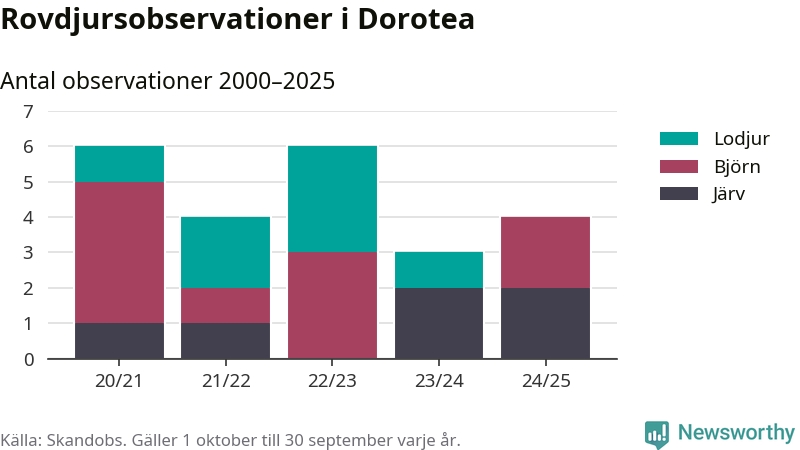 Där kan vem som helst rapportera sina observationer av de stora rovdjuren björn, varg, lodjur och järv. Mellan 1 oktober 2024 och 30 september i år har knappt 10 000 observationer registrerats i landet. Det kan vara synobservationer, foton, spår, spillning, döda bytesdjur eller andra tecken på rovdjursförekomst. I Dorotea handlar det om totalt fyra observationer av björn eller järv.
