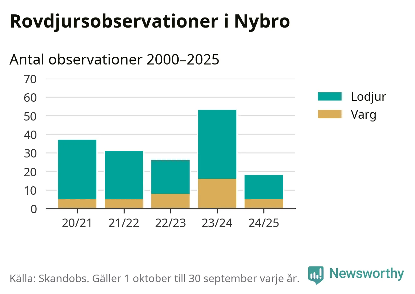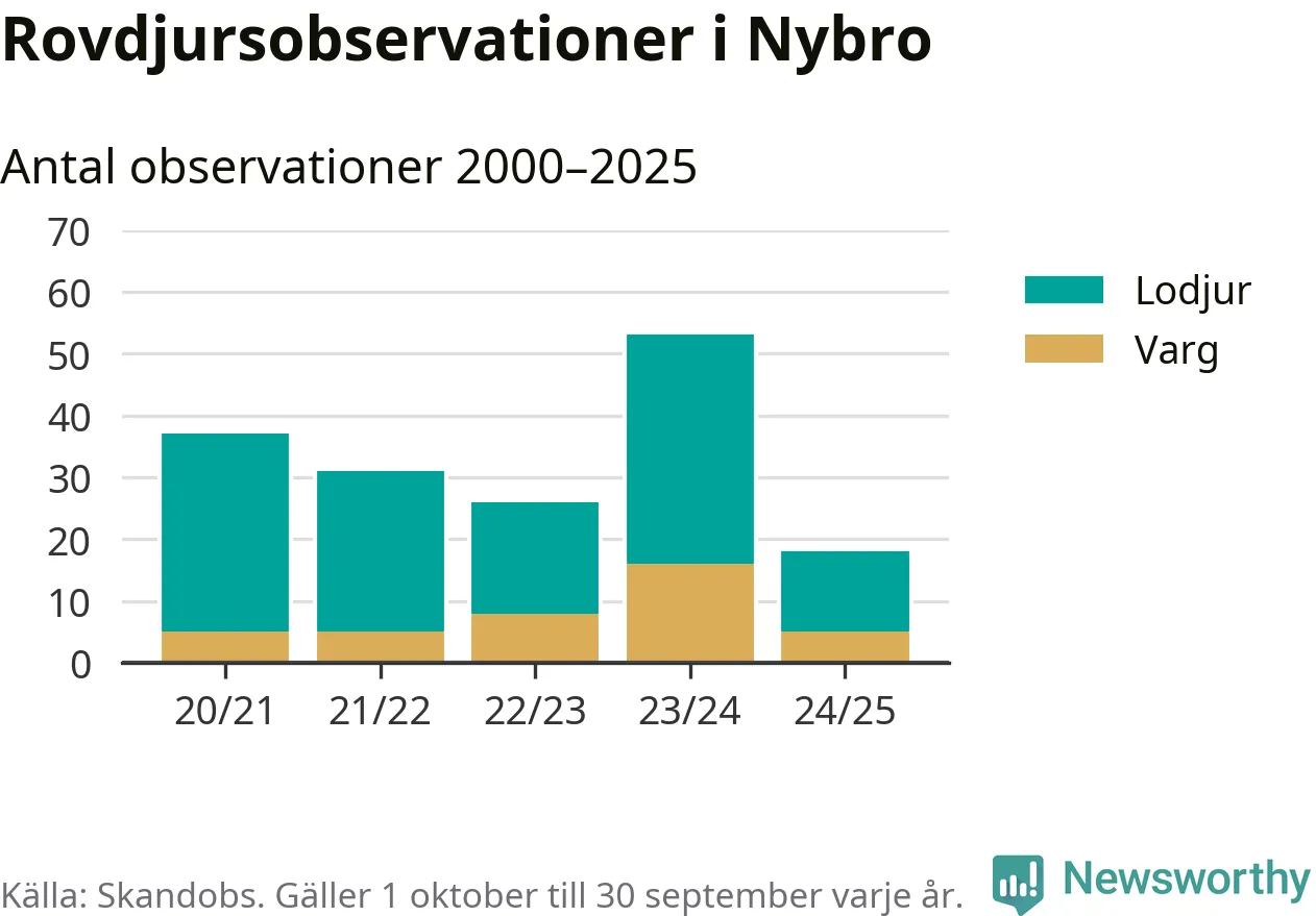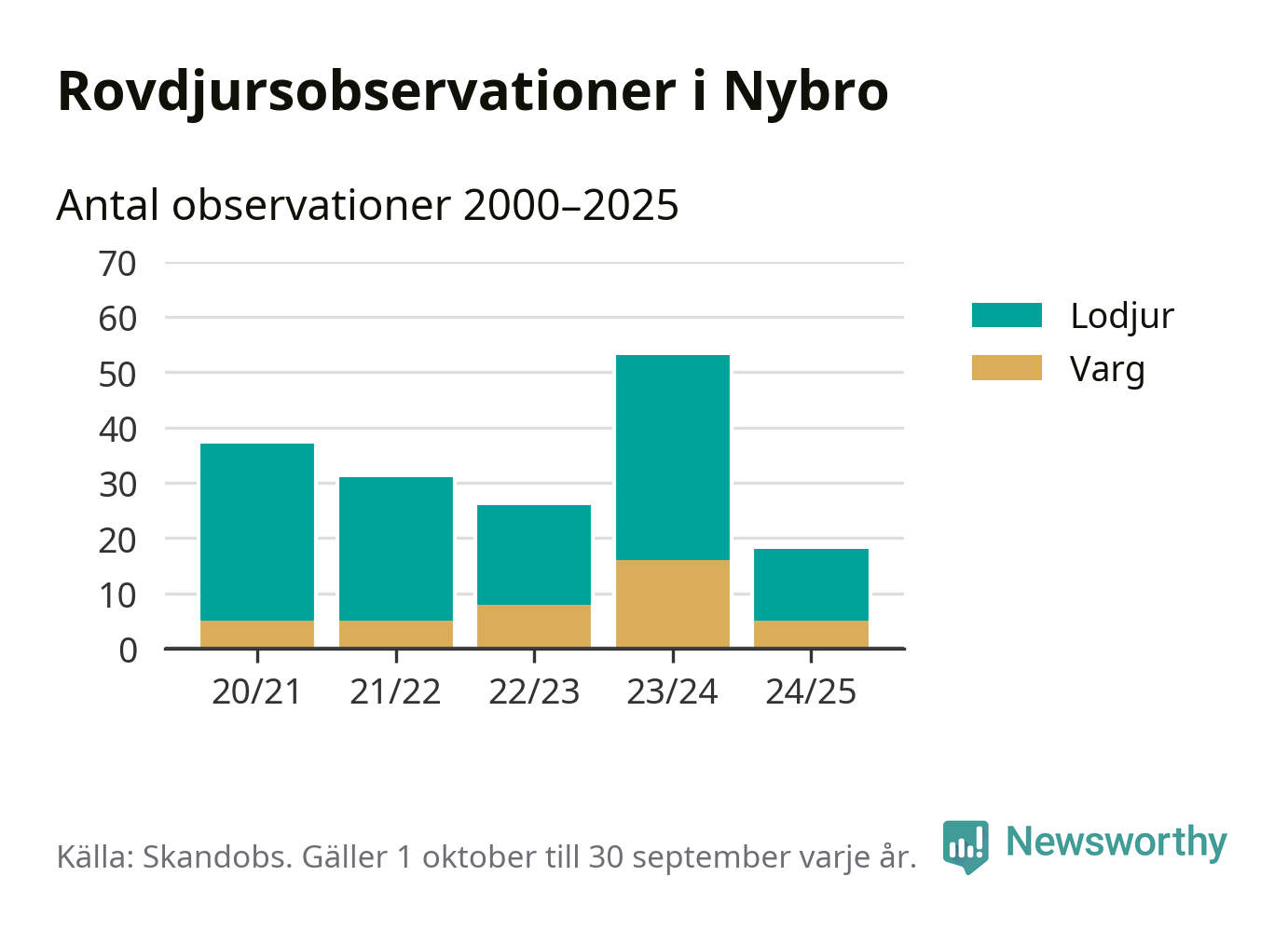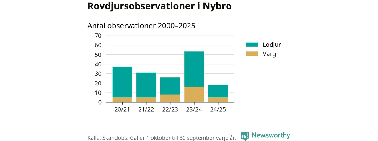 Där kan vem som helst rapportera sina observationer av de stora rovdjuren björn, varg, lodjur och järv. Mellan 1 oktober 2024 och 30 september i år har knappt 10 000 observationer registrerats i landet. Det kan vara synobservationer, foton, spår, spillning, döda bytesdjur eller andra tecken på rovdjursförekomst. I Nybro handlar det om totalt 18 observationer av lodjur eller varg.