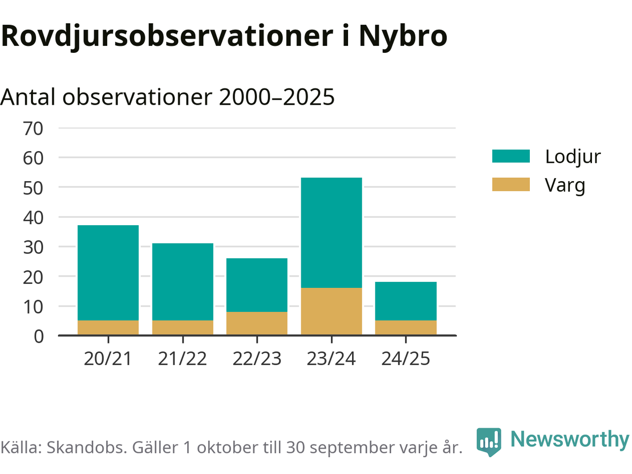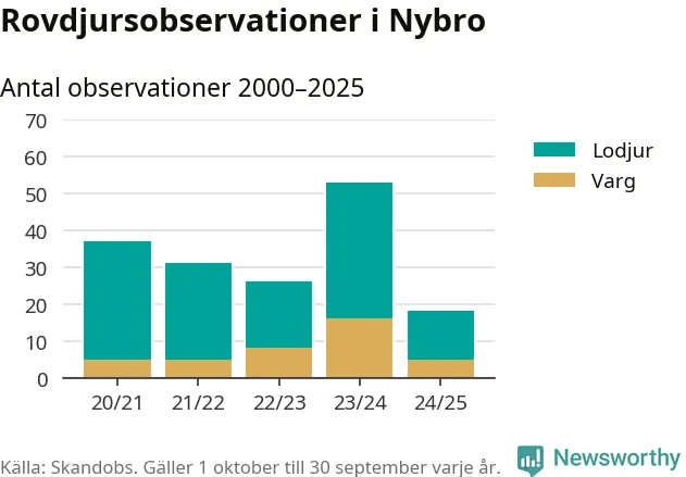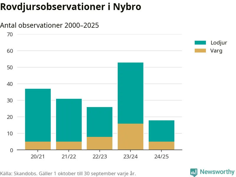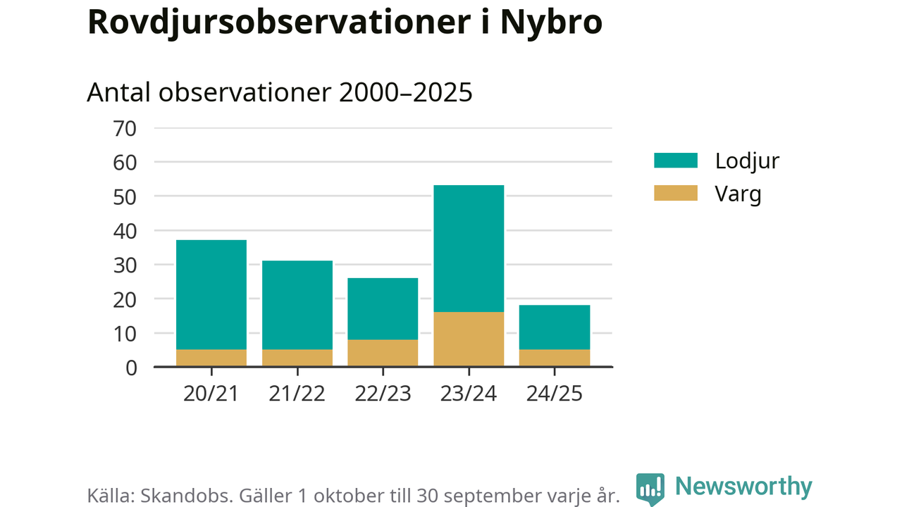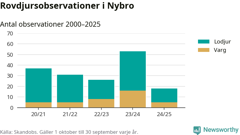 Där kan vem som helst rapportera sina observationer av de stora rovdjuren björn, varg, lodjur och järv. Mellan 1 oktober 2024 och 30 september i år har knappt 10 000 observationer registrerats i landet. Det kan vara synobservationer, foton, spår, spillning, döda bytesdjur eller andra tecken på rovdjursförekomst. I Nybro handlar det om totalt 18 observationer av lodjur eller varg.