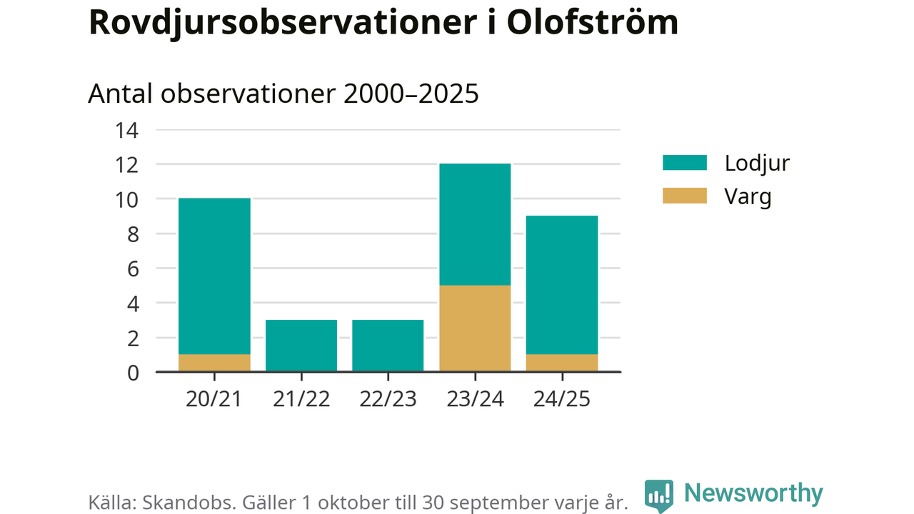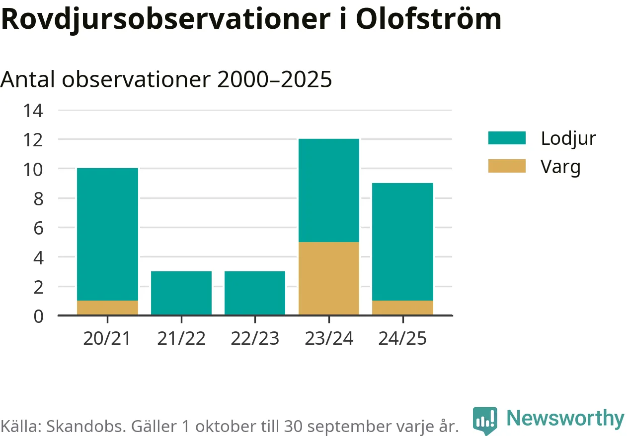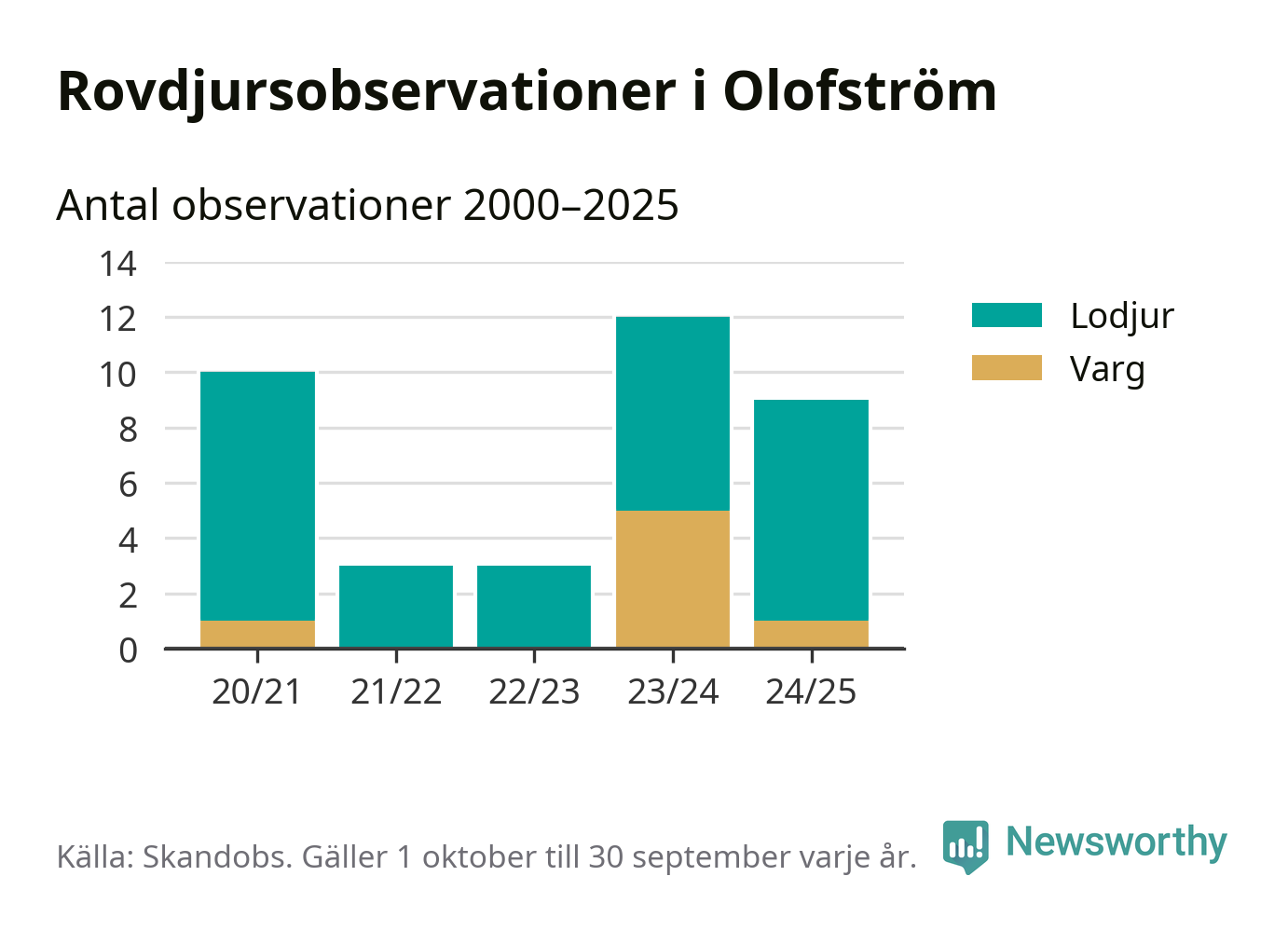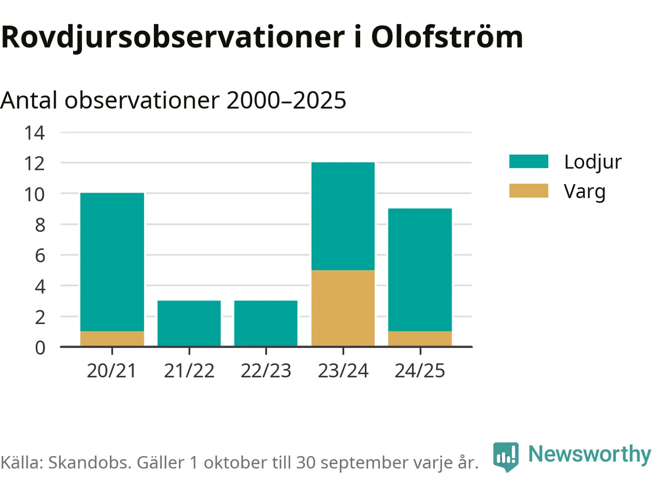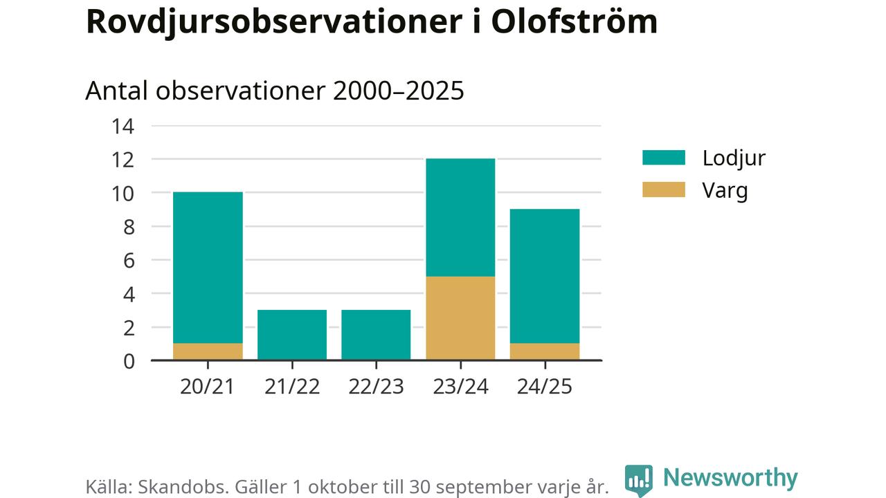 Där kan vem som helst rapportera sina observationer av de stora rovdjuren björn, varg, lodjur och järv. Mellan 1 oktober 2024 och 30 september i år har knappt 10 000 observationer registrerats i landet. Det kan vara synobservationer, foton, spår, spillning, döda bytesdjur eller andra tecken på rovdjursförekomst. I Olofström handlar det om totalt nio observationer av lodjur eller varg.