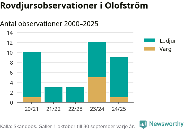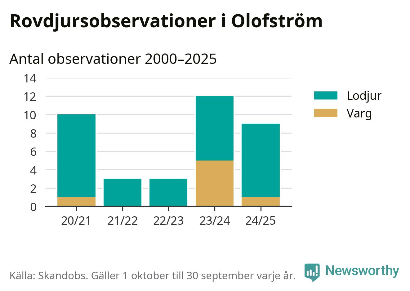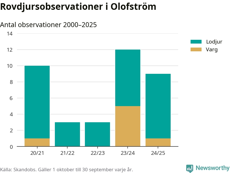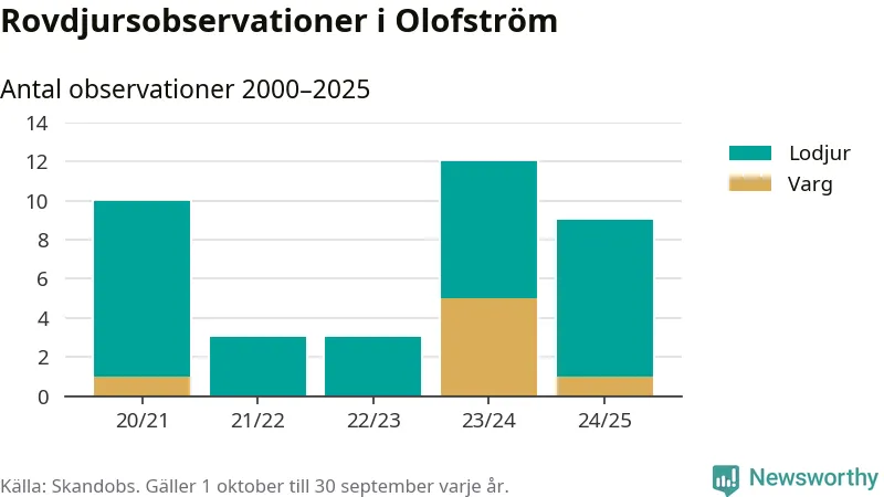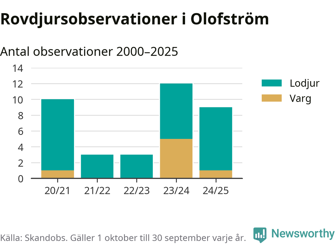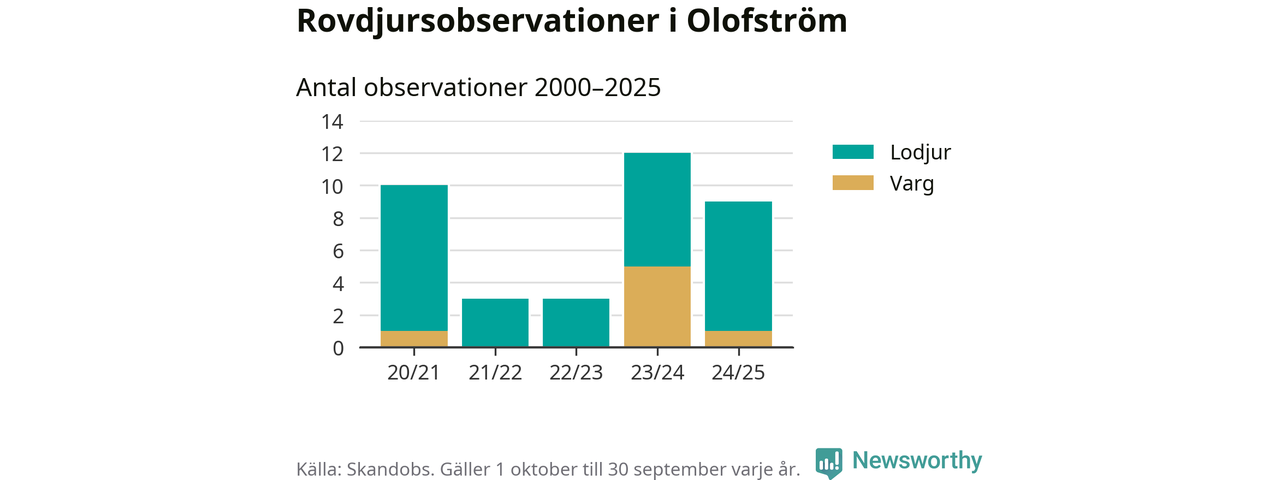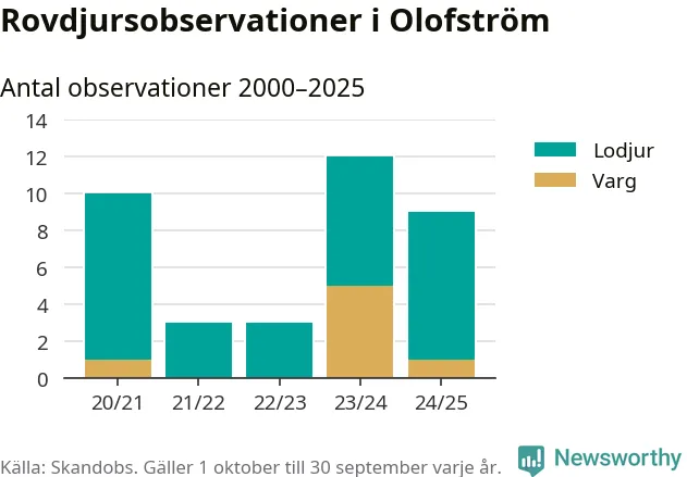 Där kan vem som helst rapportera sina observationer av de stora rovdjuren björn, varg, lodjur och järv. Mellan 1 oktober 2024 och 30 september i år har knappt 10 000 observationer registrerats i landet. Det kan vara synobservationer, foton, spår, spillning, döda bytesdjur eller andra tecken på rovdjursförekomst. I Olofström handlar det om totalt nio observationer av lodjur eller varg.