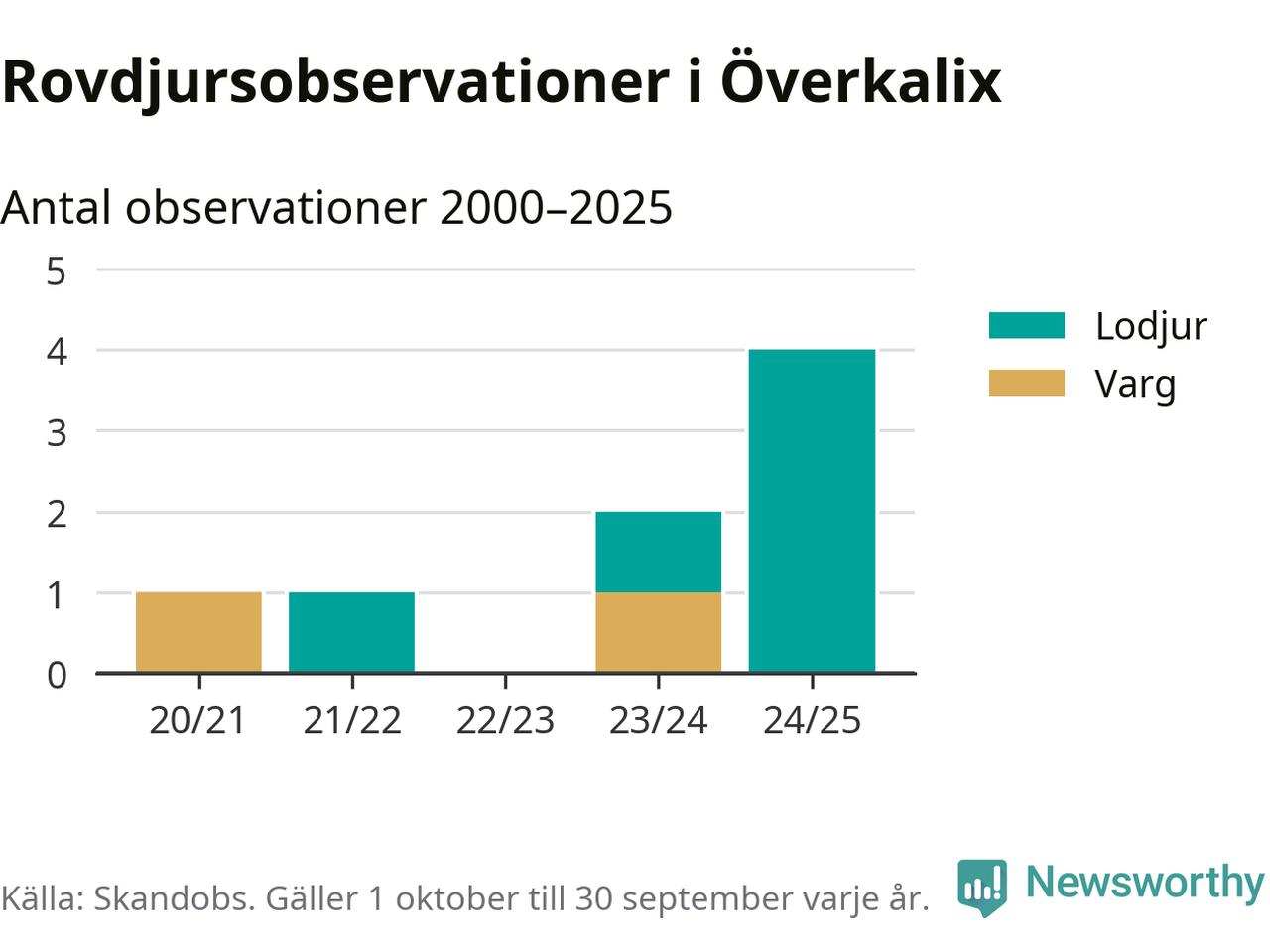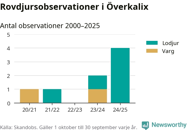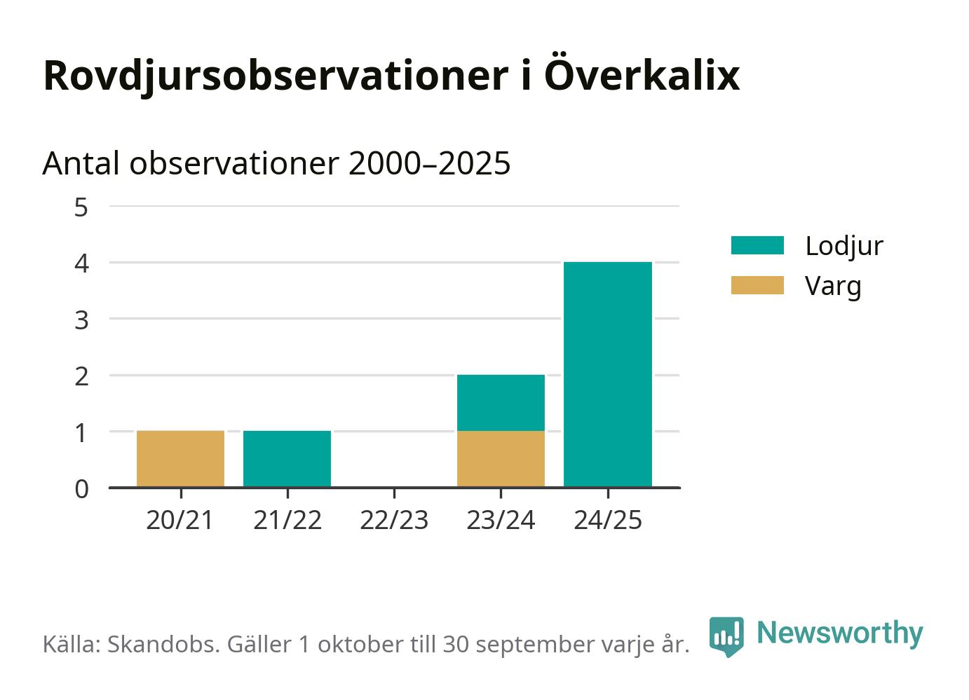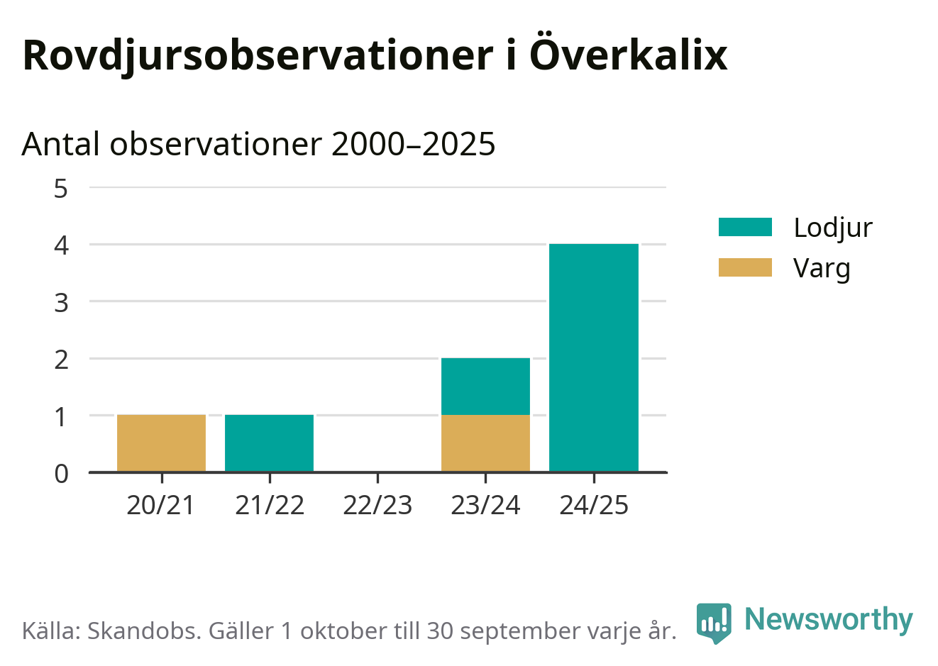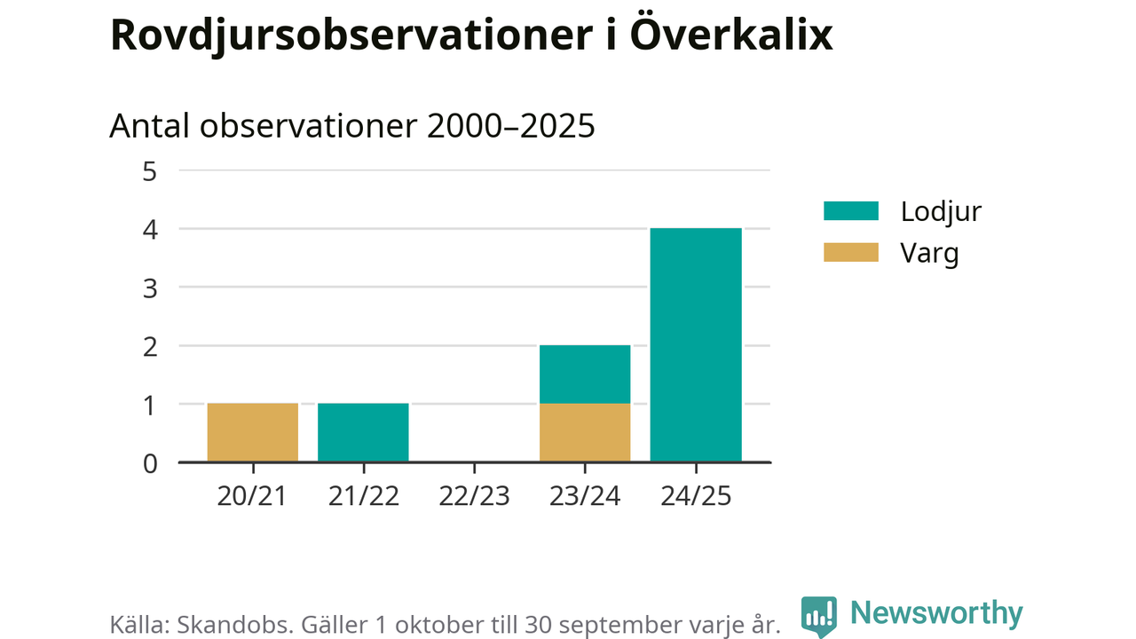Där kan vem som helst rapportera sina observationer av de stora rovdjuren björn, varg, lodjur och järv. Mellan 1 oktober 2024 och 30 september i år har knappt 10 000 observationer registrerats i landet. Det kan vara synobservationer, foton, spår, spillning, döda bytesdjur eller andra tecken på rovdjursförekomst. I Överkalix handlar det om totalt fyra observationer av lodjur.