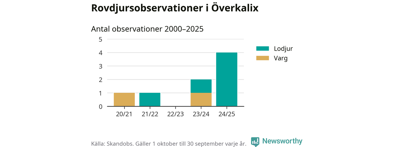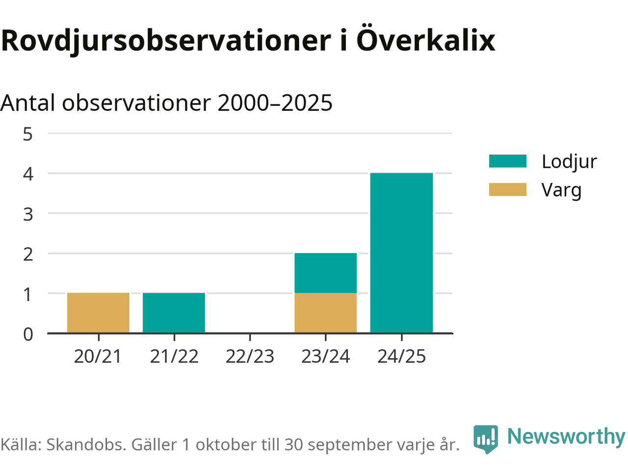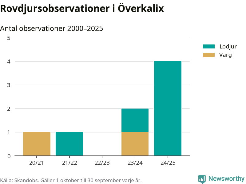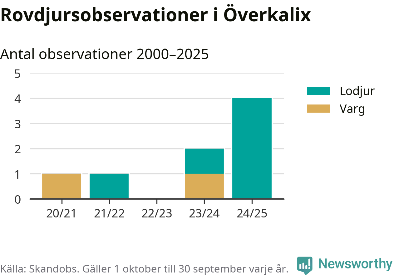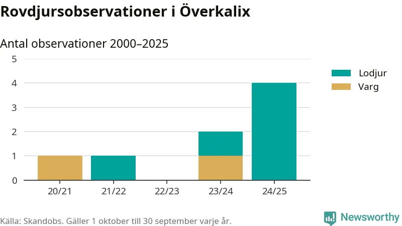 Där kan vem som helst rapportera sina observationer av de stora rovdjuren björn, varg, lodjur och järv. Mellan 1 oktober 2024 och 30 september i år har knappt 10 000 observationer registrerats i landet. Det kan vara synobservationer, foton, spår, spillning, döda bytesdjur eller andra tecken på rovdjursförekomst. I Överkalix handlar det om totalt fyra observationer av lodjur.