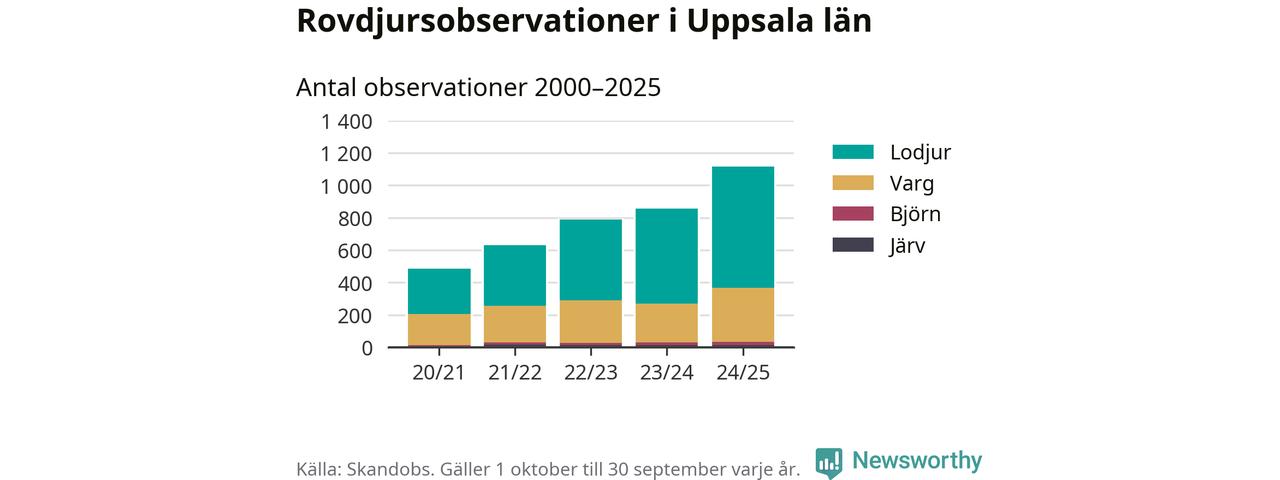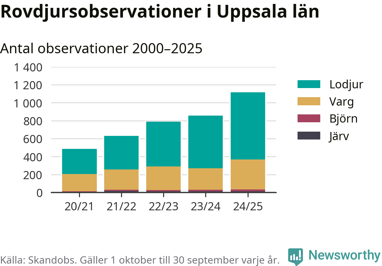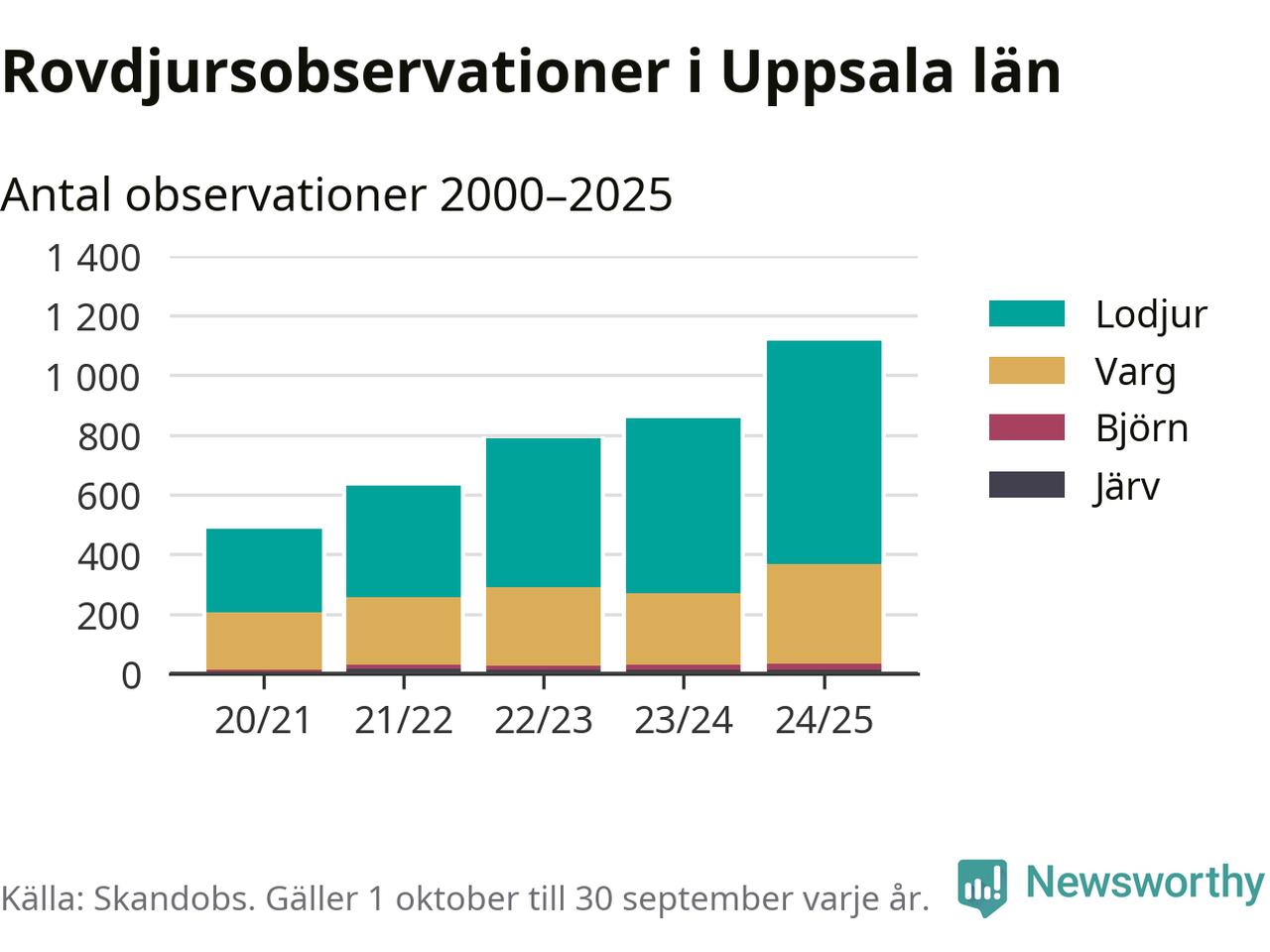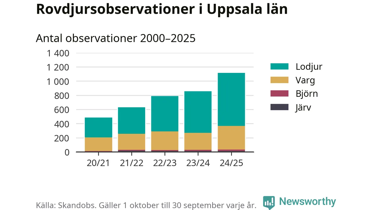Där kan vem som helst rapportera sina observationer av de stora rovdjuren björn, varg, lodjur och järv. Mellan 1 oktober 2024 och 30 september i år har knappt 10 000 observationer registrerats i landet. Det kan vara synobservationer, foton, spår, spillning, döda bytesdjur eller andra tecken på rovdjursförekomst. I Uppsala län finns totalt 1 115 rapporter, om alla fyra rovdjur.
