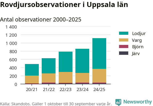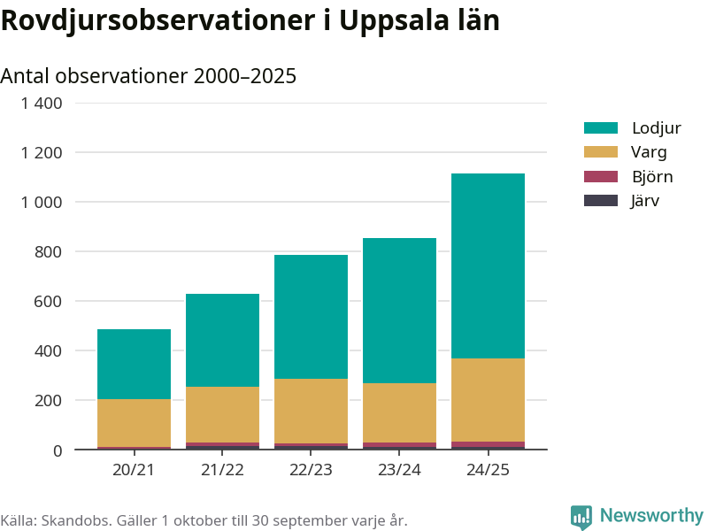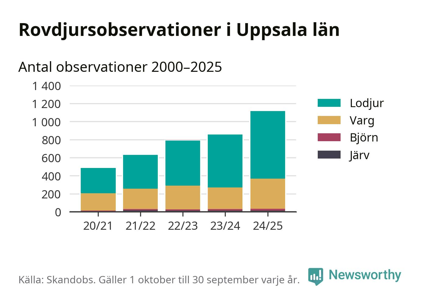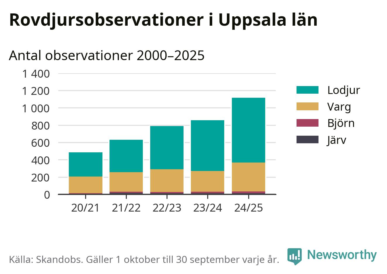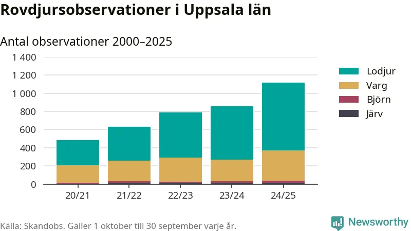 Där kan vem som helst rapportera sina observationer av de stora rovdjuren björn, varg, lodjur och järv. Mellan 1 oktober 2024 och 30 september i år har knappt 10 000 observationer registrerats i landet. Det kan vara synobservationer, foton, spår, spillning, döda bytesdjur eller andra tecken på rovdjursförekomst. I Uppsala län finns totalt 1 115 rapporter, om alla fyra rovdjur.