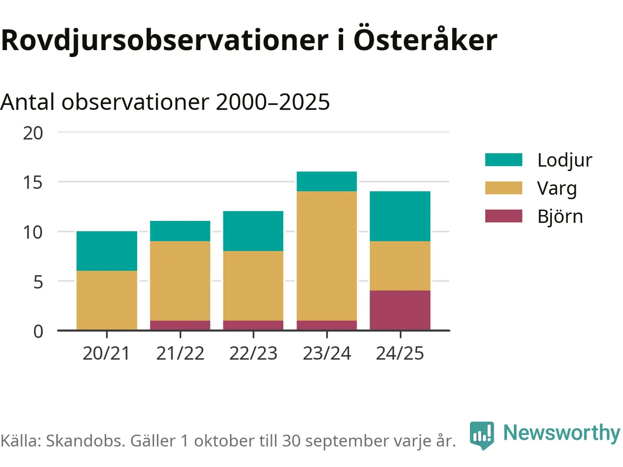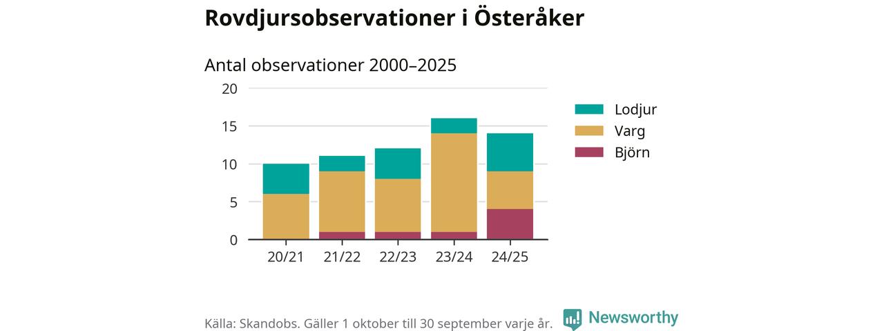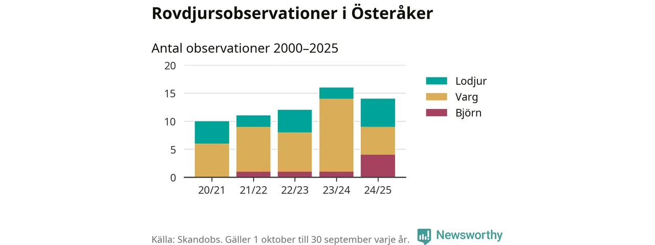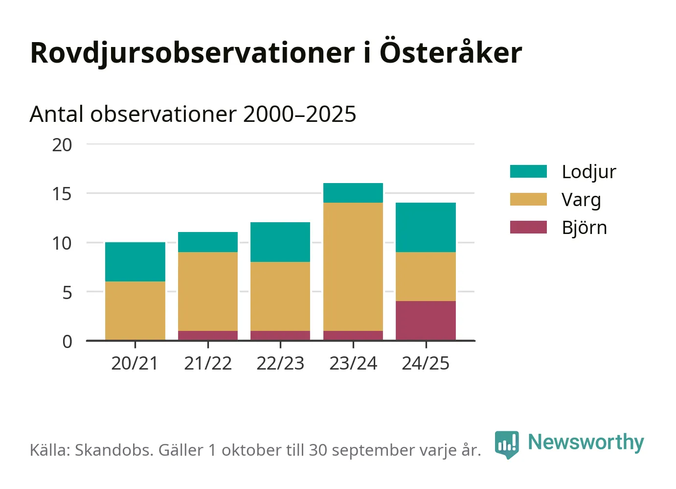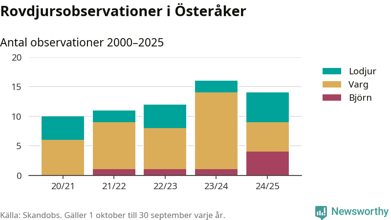 Där kan vem som helst rapportera sina observationer av de stora rovdjuren björn, varg, lodjur och järv. Mellan 1 oktober 2024 och 30 september i år har knappt 10 000 observationer registrerats i landet. Det kan vara synobservationer, foton, spår, spillning, döda bytesdjur eller andra tecken på rovdjursförekomst. I Österåker handlar det om totalt 14 observationer av lodjur, varg eller björn.