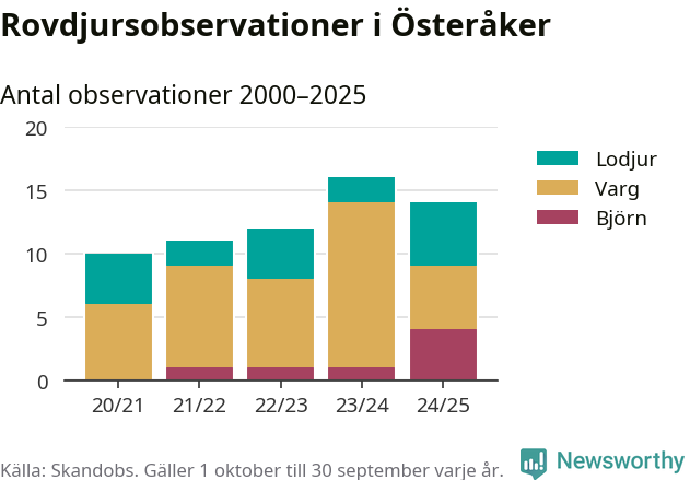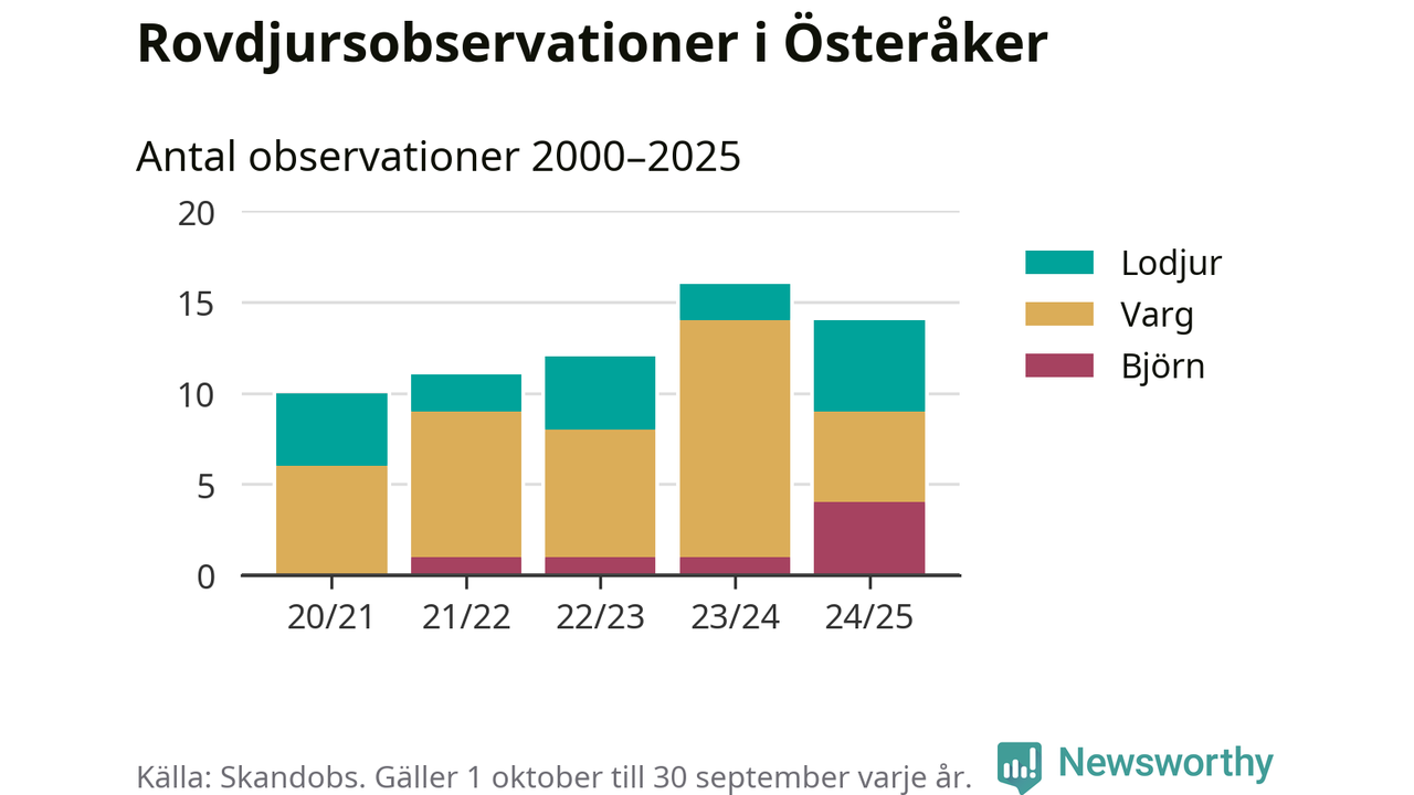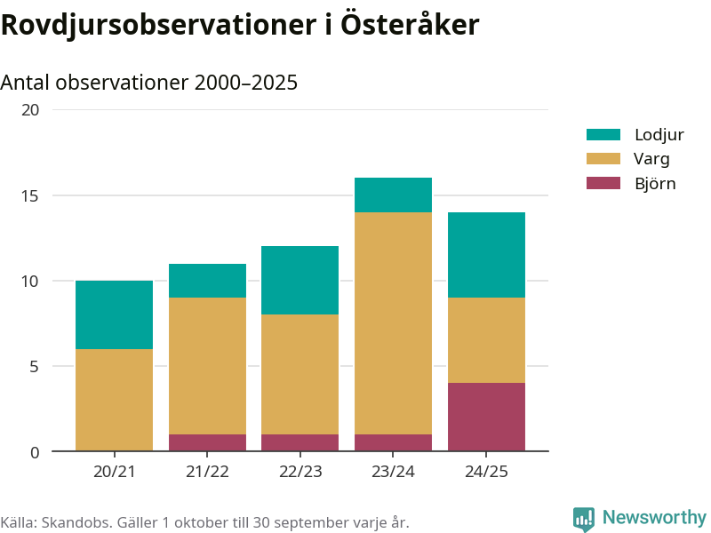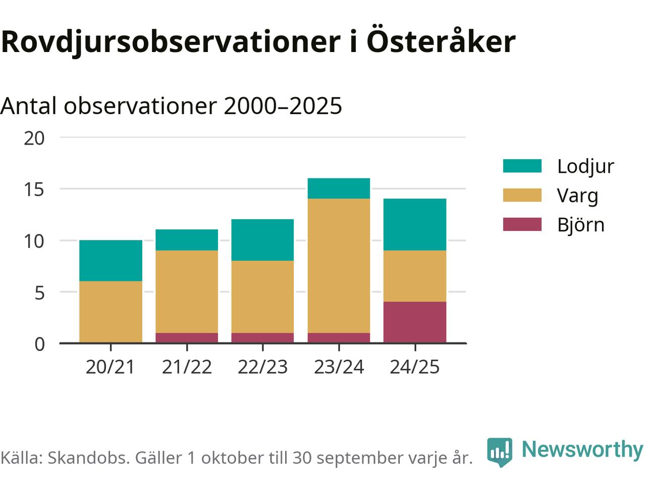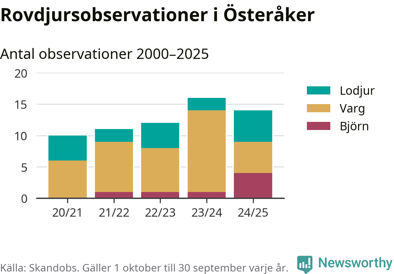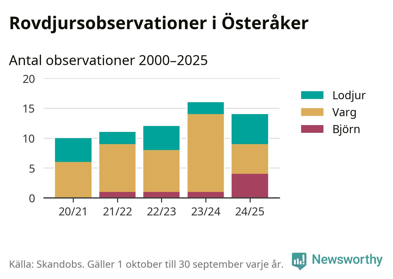 Där kan vem som helst rapportera sina observationer av de stora rovdjuren björn, varg, lodjur och järv. Mellan 1 oktober 2024 och 30 september i år har knappt 10 000 observationer registrerats i landet. Det kan vara synobservationer, foton, spår, spillning, döda bytesdjur eller andra tecken på rovdjursförekomst. I Österåker handlar det om totalt 14 observationer av lodjur, varg eller björn.