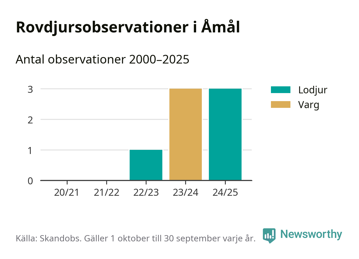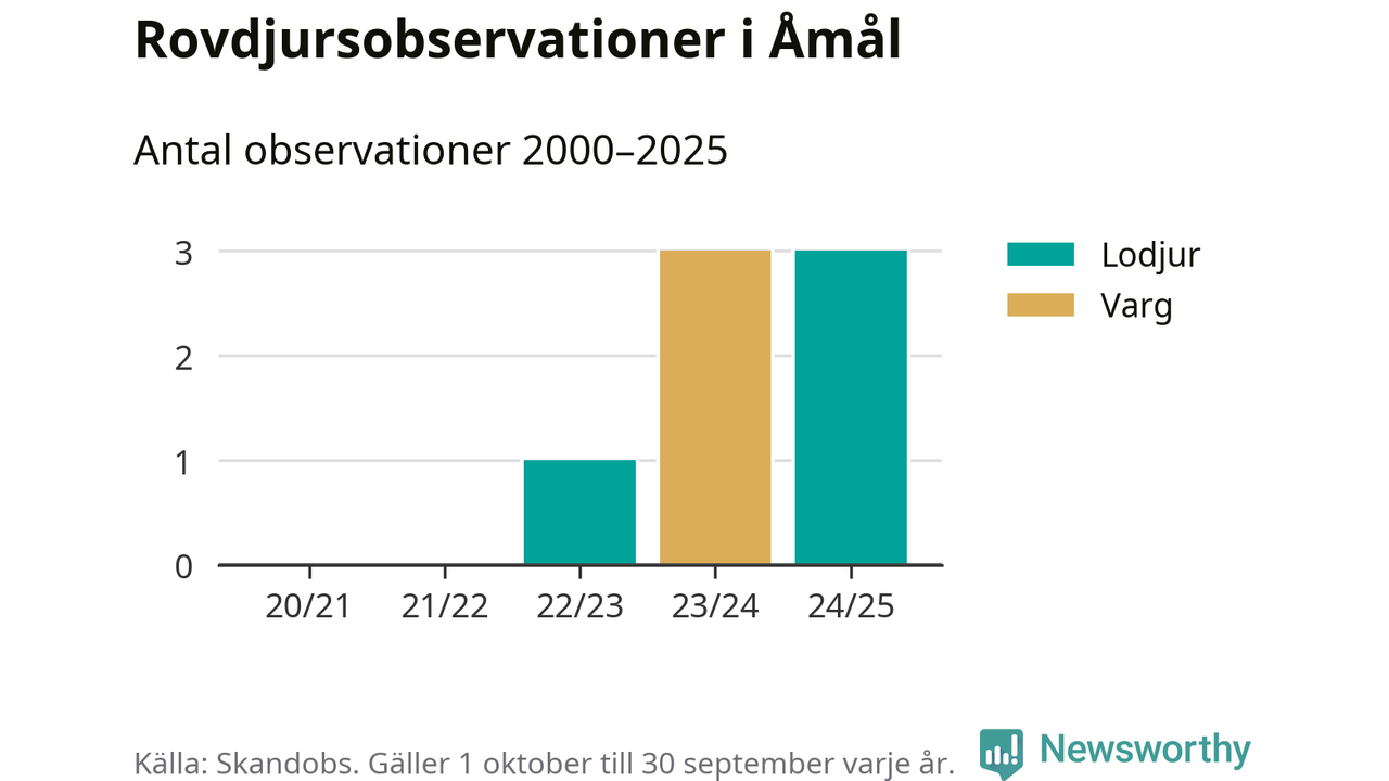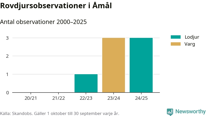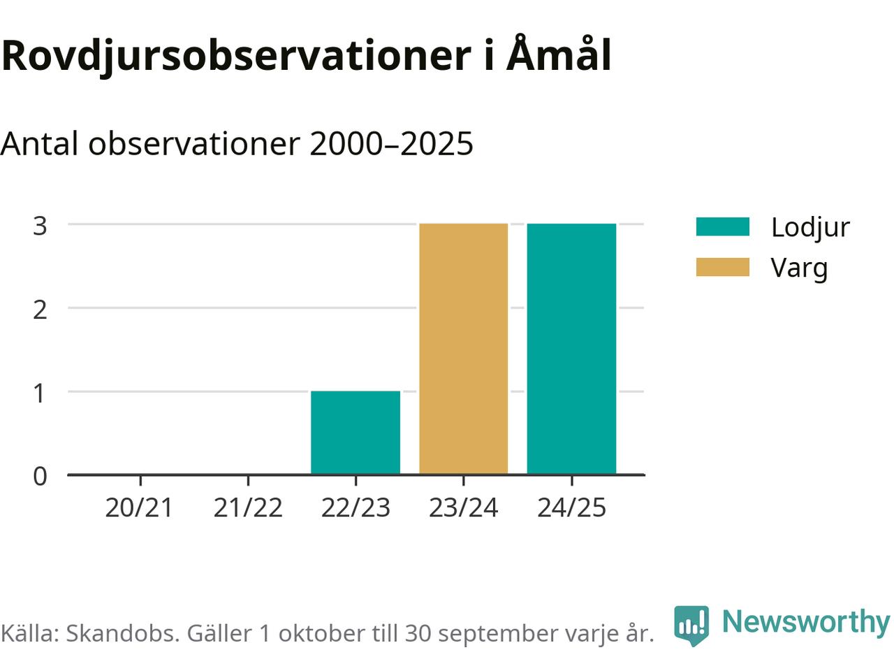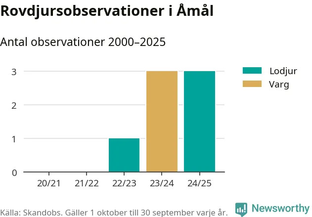 Där kan vem som helst rapportera sina observationer av de stora rovdjuren björn, varg, lodjur och järv. Mellan 1 oktober 2024 och 30 september i år har knappt 10 000 observationer registrerats i landet. Det kan vara synobservationer, foton, spår, spillning, döda bytesdjur eller andra tecken på rovdjursförekomst. I Åmål handlar det om totalt tre observationer av lodjur.