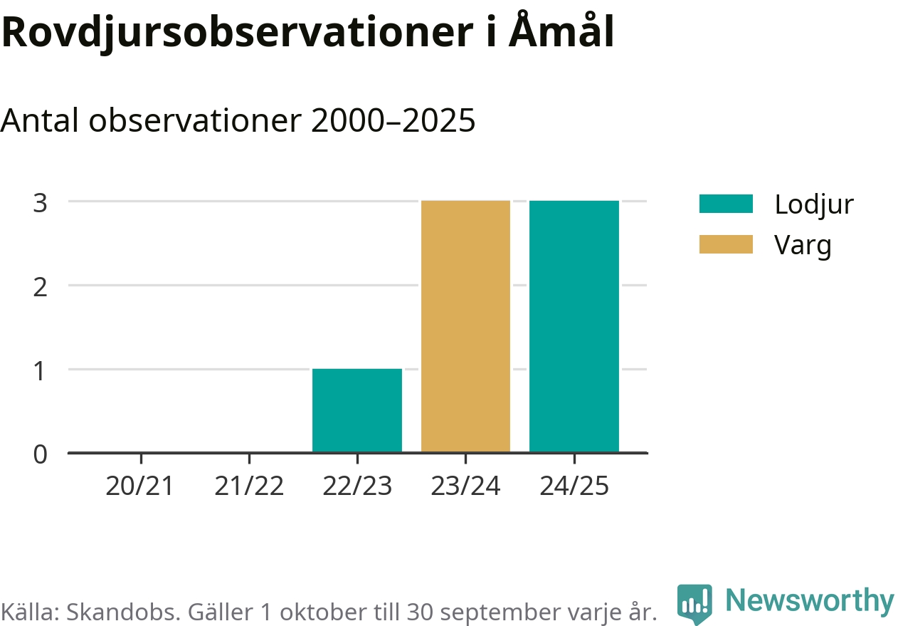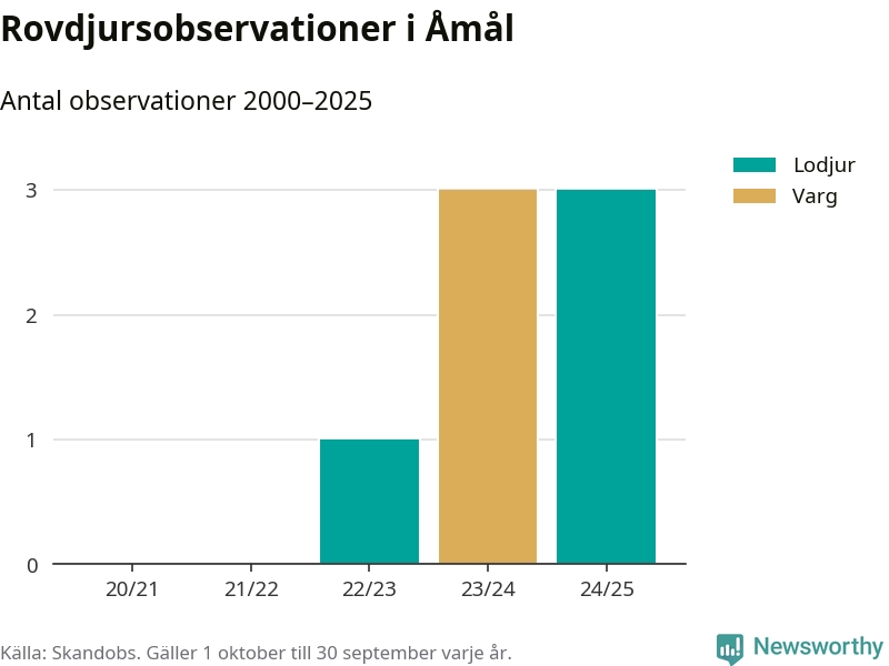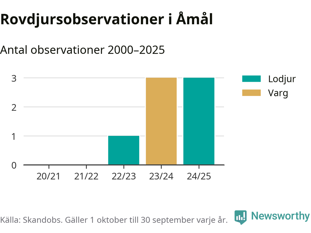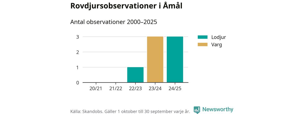 Där kan vem som helst rapportera sina observationer av de stora rovdjuren björn, varg, lodjur och järv. Mellan 1 oktober 2024 och 30 september i år har knappt 10 000 observationer registrerats i landet. Det kan vara synobservationer, foton, spår, spillning, döda bytesdjur eller andra tecken på rovdjursförekomst. I Åmål handlar det om totalt tre observationer av lodjur.