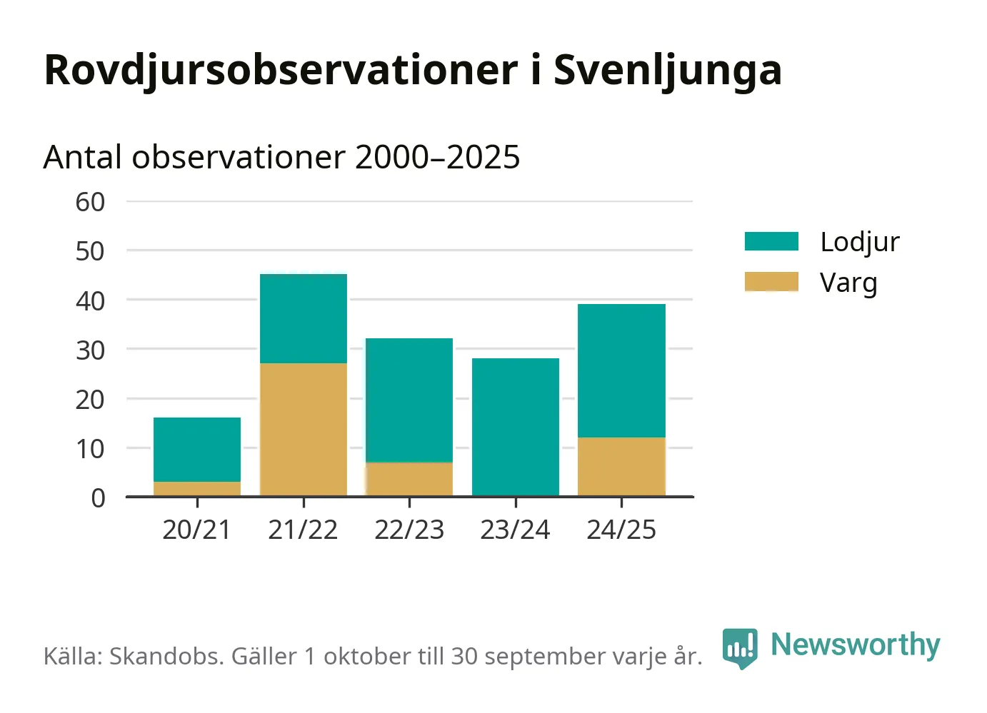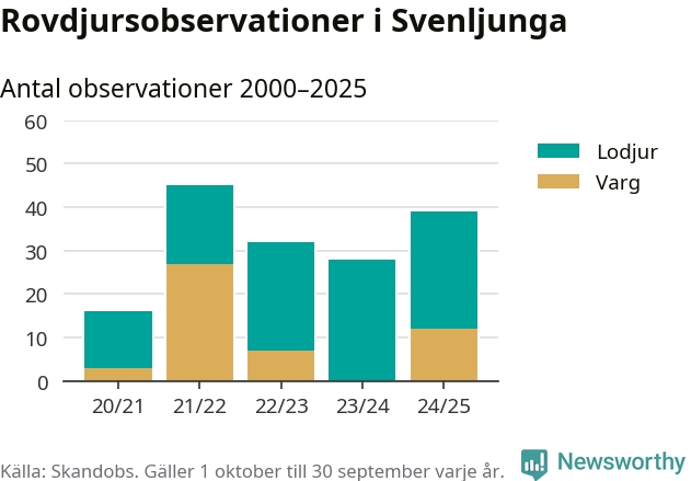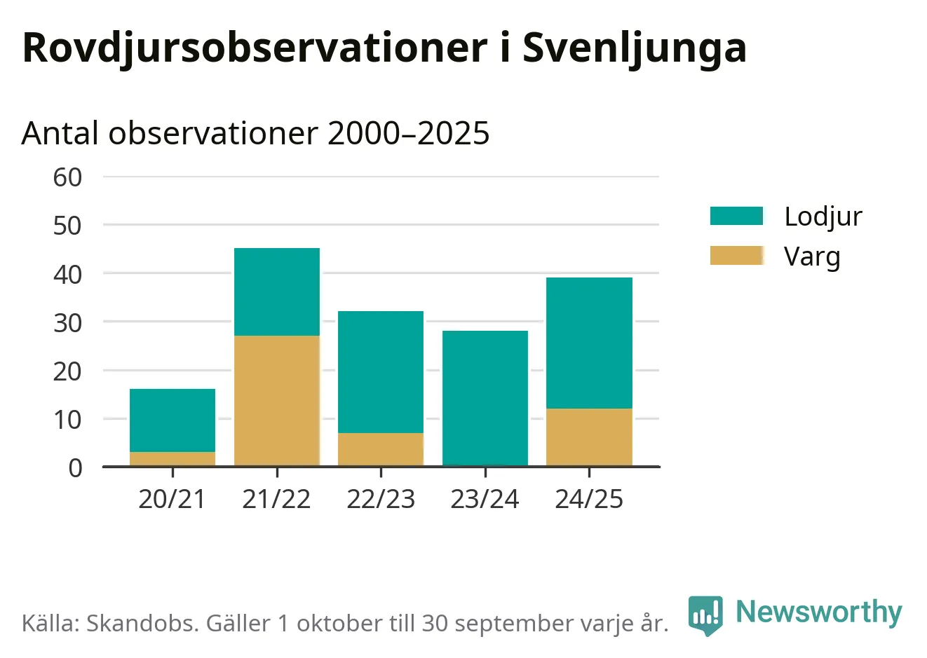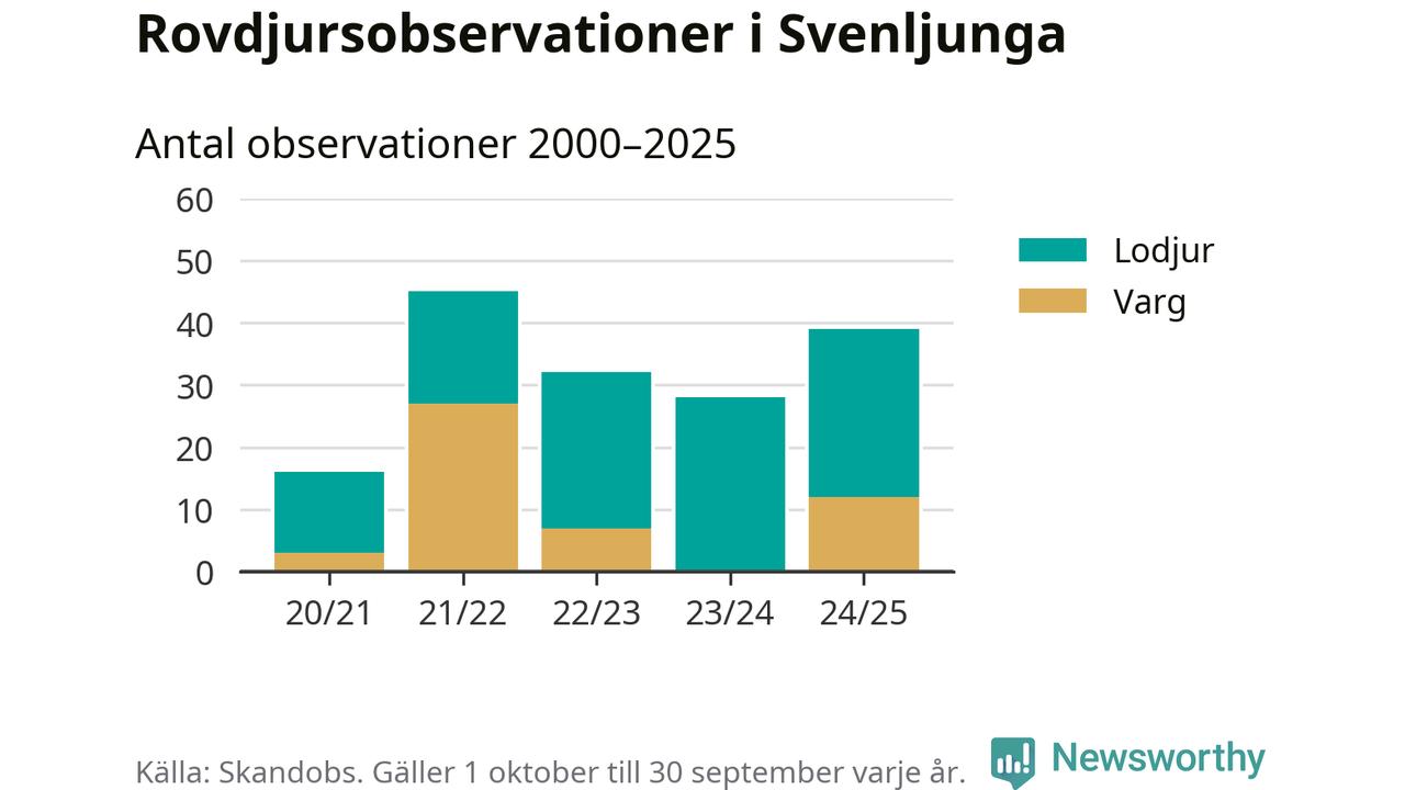 Där kan vem som helst rapportera sina observationer av de stora rovdjuren björn, varg, lodjur och järv. Mellan 1 oktober 2024 och 30 september i år har knappt 10 000 observationer registrerats i landet. Det kan vara synobservationer, foton, spår, spillning, döda bytesdjur eller andra tecken på rovdjursförekomst. I Svenljunga handlar det om totalt 39 observationer av lodjur eller varg.