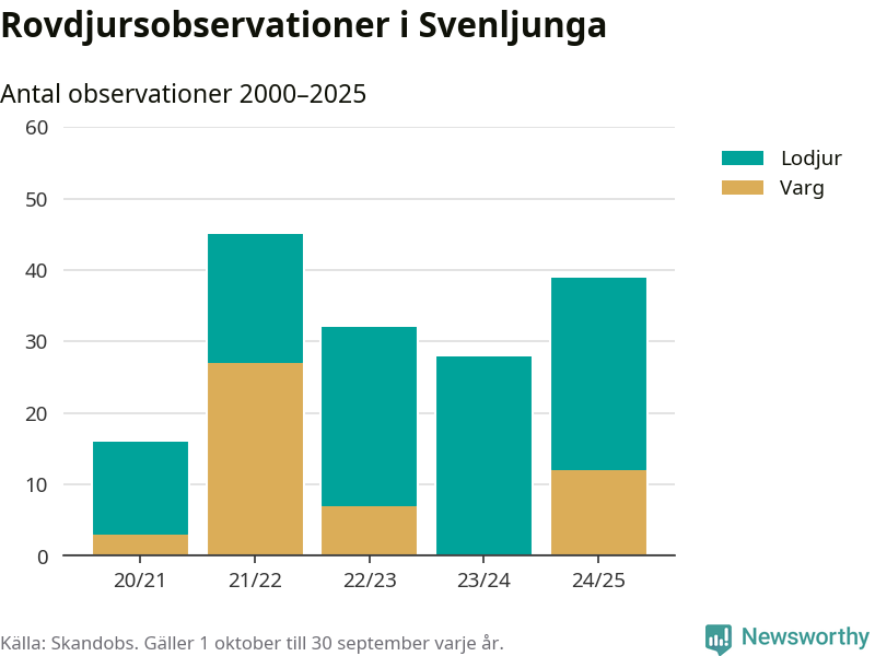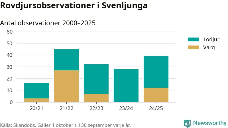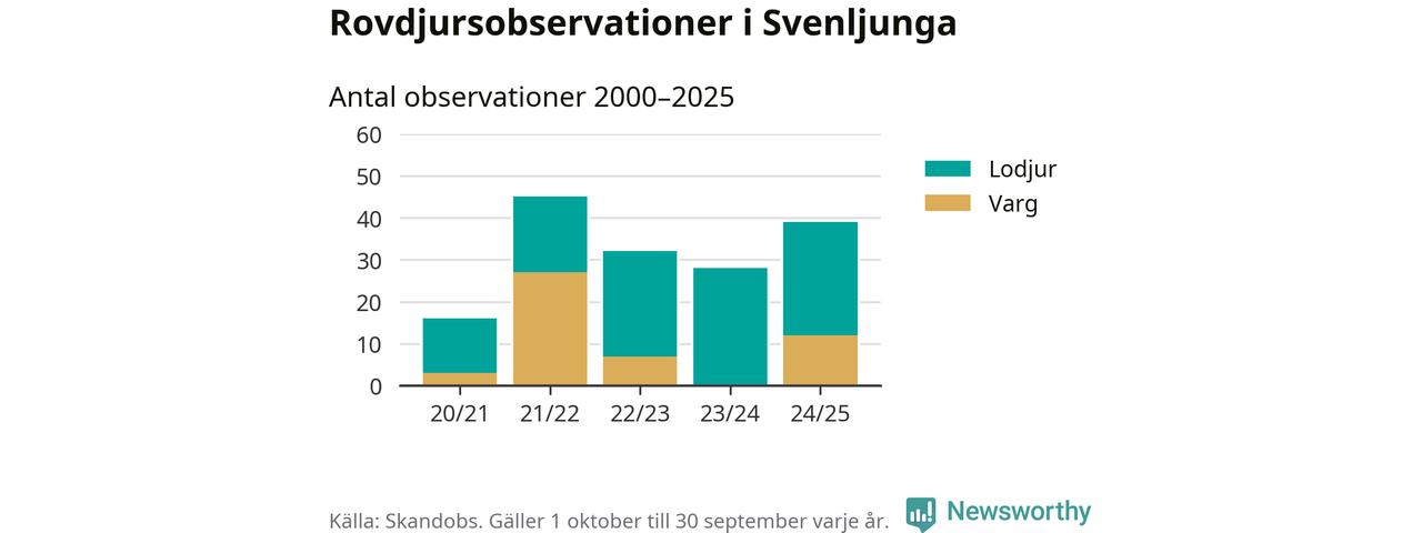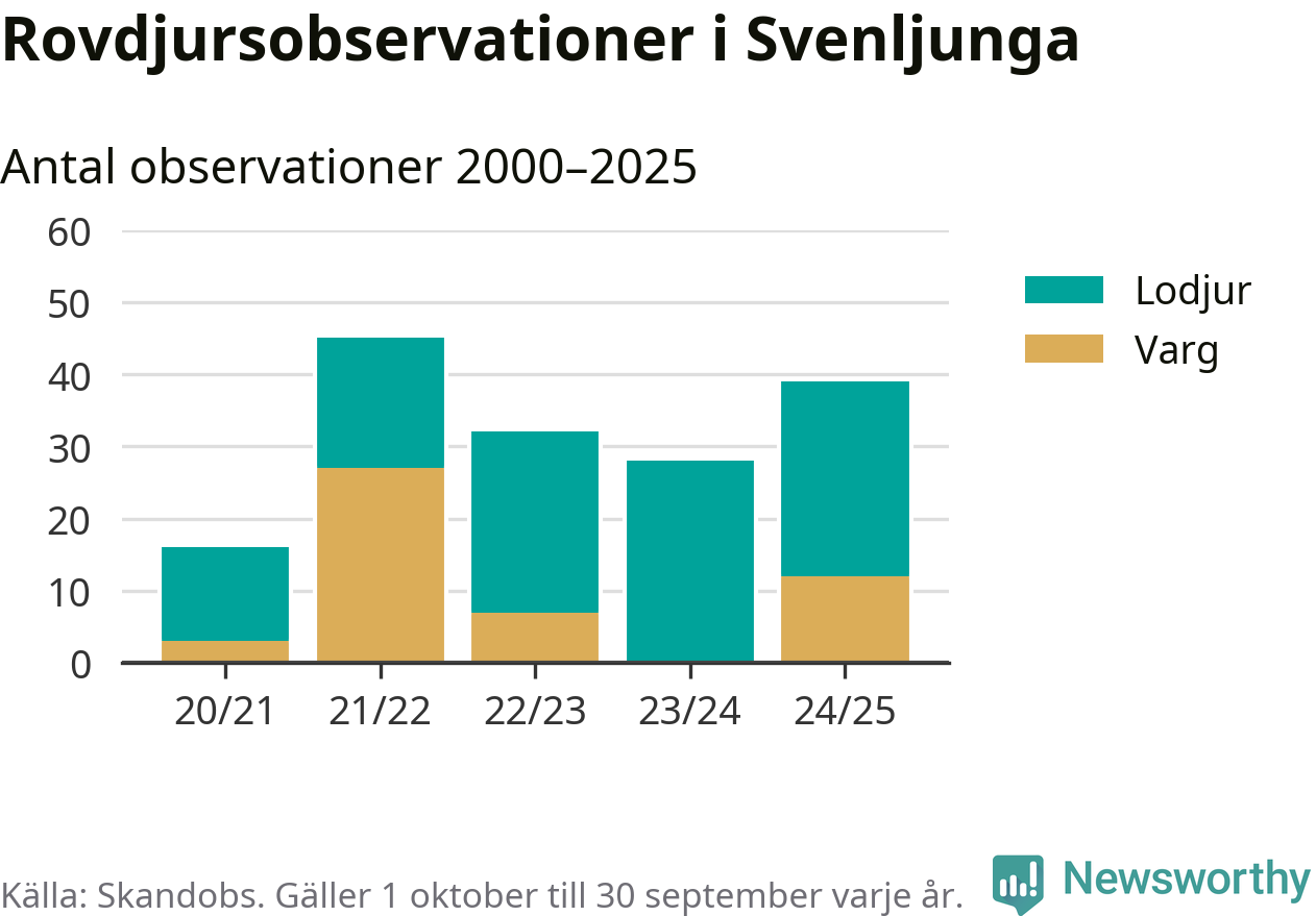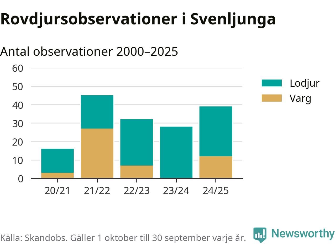 Där kan vem som helst rapportera sina observationer av de stora rovdjuren björn, varg, lodjur och järv. Mellan 1 oktober 2024 och 30 september i år har knappt 10 000 observationer registrerats i landet. Det kan vara synobservationer, foton, spår, spillning, döda bytesdjur eller andra tecken på rovdjursförekomst. I Svenljunga handlar det om totalt 39 observationer av lodjur eller varg.