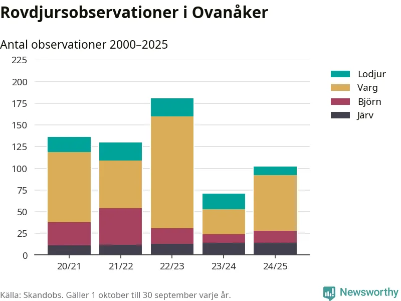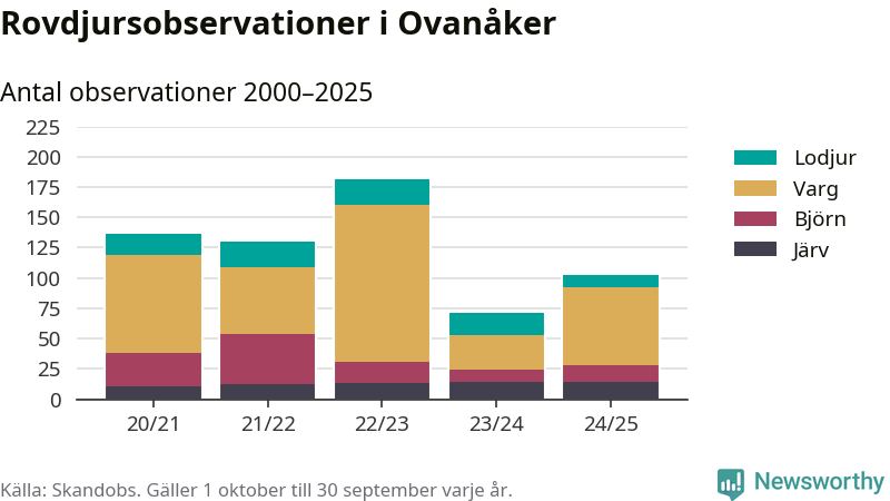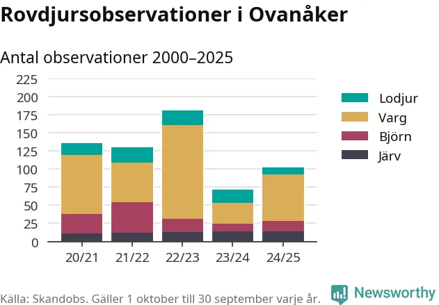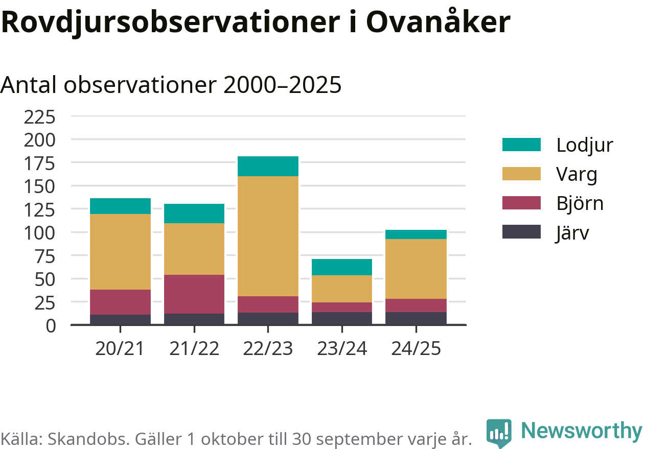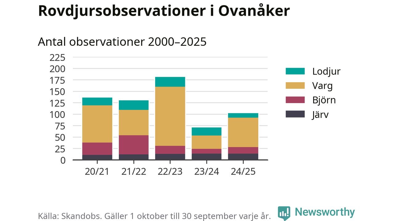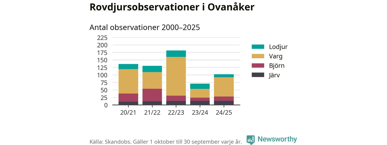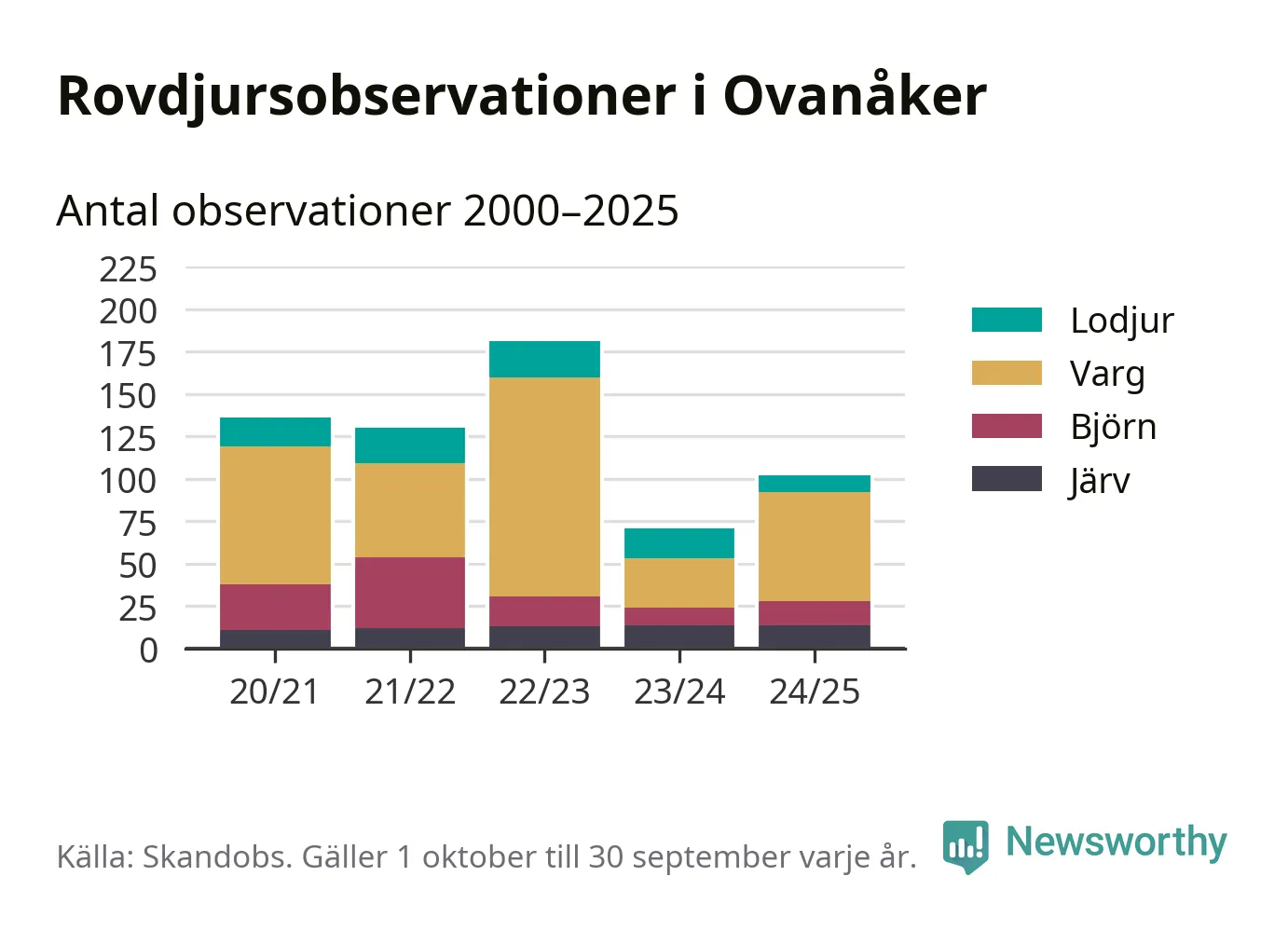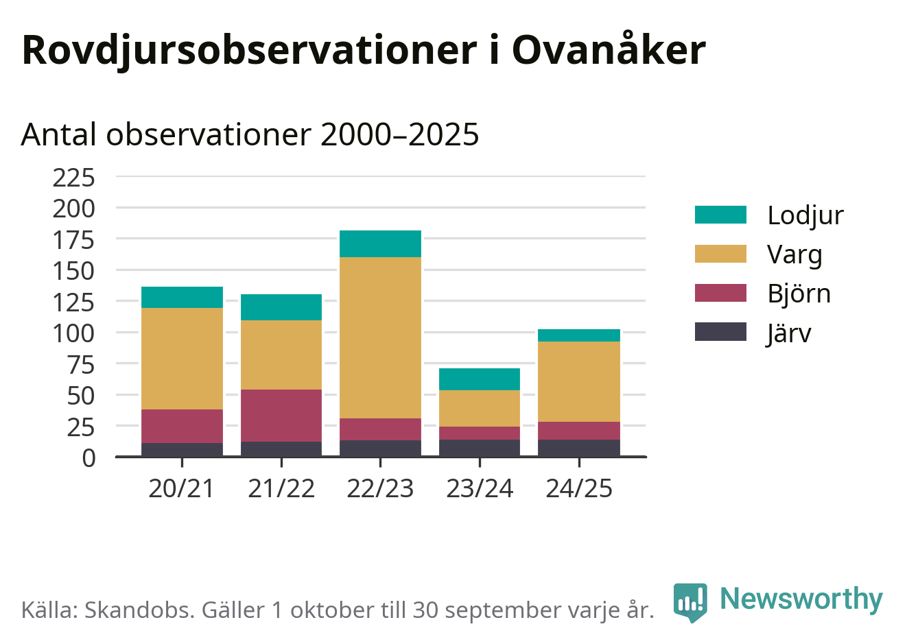Där kan vem som helst rapportera sina observationer av de stora rovdjuren björn, varg, lodjur och järv. Mellan 1 oktober 2024 och 30 september i år har knappt 10 000 observationer registrerats i landet. Det kan vara synobservationer, foton, spår, spillning, döda bytesdjur eller andra tecken på rovdjursförekomst. I Ovanåker finns totalt 102 rapporter, om alla fyra rovdjur.