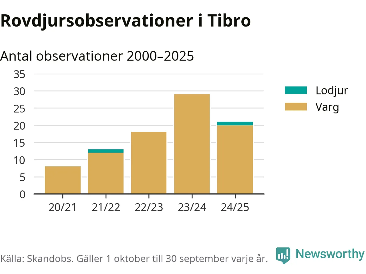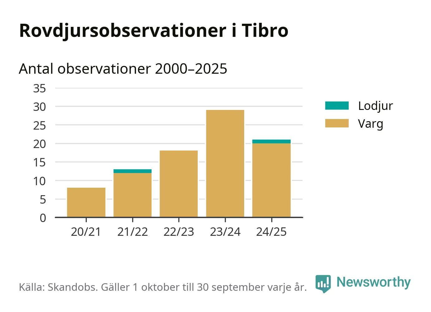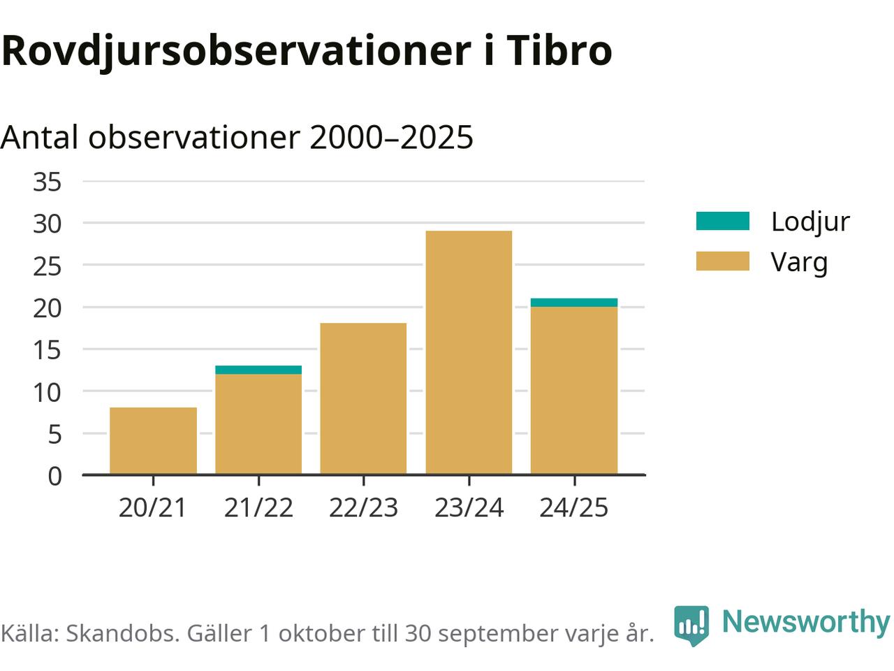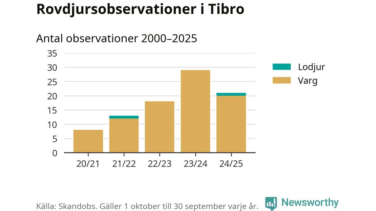 Där kan vem som helst rapportera sina observationer av de stora rovdjuren björn, varg, lodjur och järv. Mellan 1 oktober 2024 och 30 september i år har knappt 10 000 observationer registrerats i landet. Det kan vara synobservationer, foton, spår, spillning, döda bytesdjur eller andra tecken på rovdjursförekomst. I Tibro handlar det om totalt 21 observationer av varg eller lodjur.