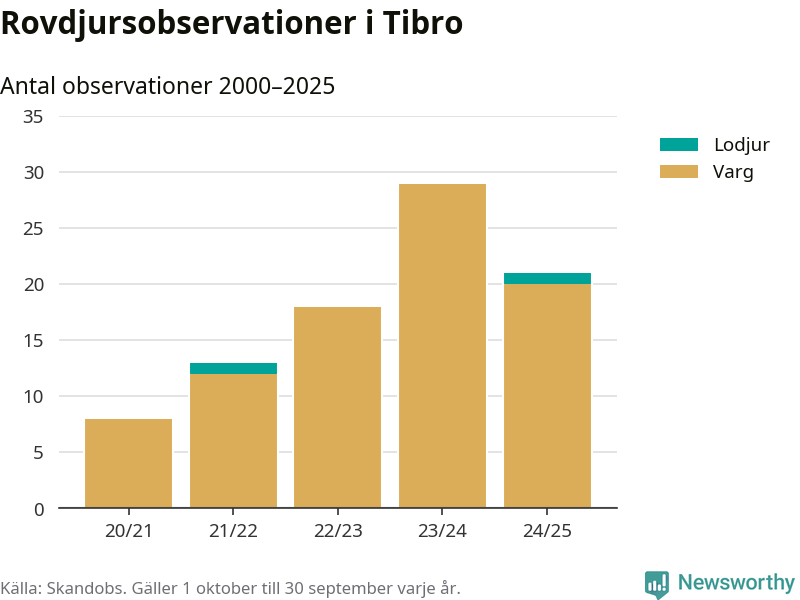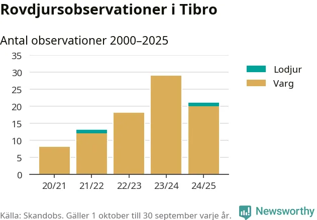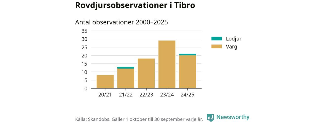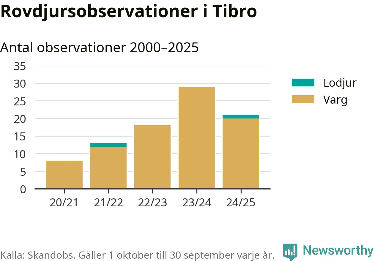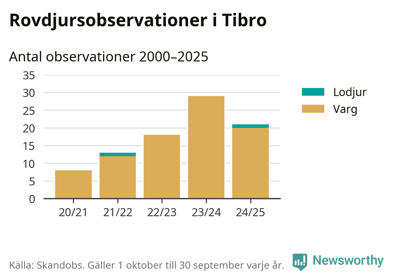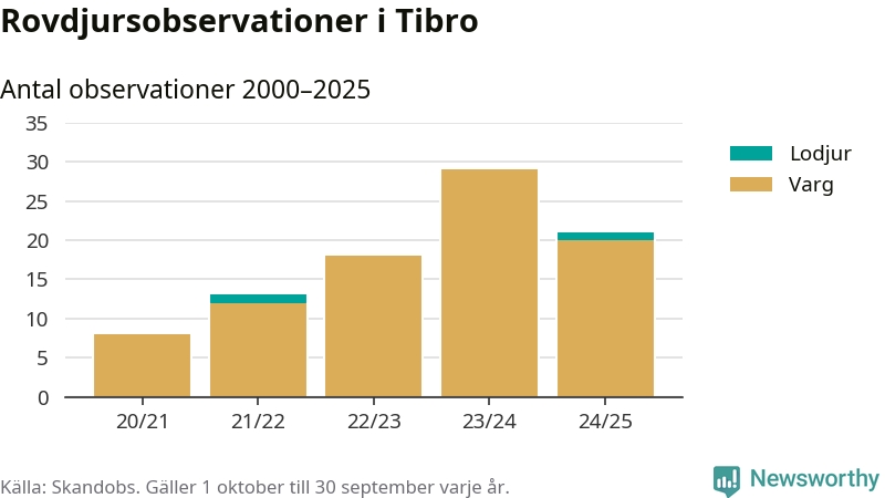 Där kan vem som helst rapportera sina observationer av de stora rovdjuren björn, varg, lodjur och järv. Mellan 1 oktober 2024 och 30 september i år har knappt 10 000 observationer registrerats i landet. Det kan vara synobservationer, foton, spår, spillning, döda bytesdjur eller andra tecken på rovdjursförekomst. I Tibro handlar det om totalt 21 observationer av varg eller lodjur.