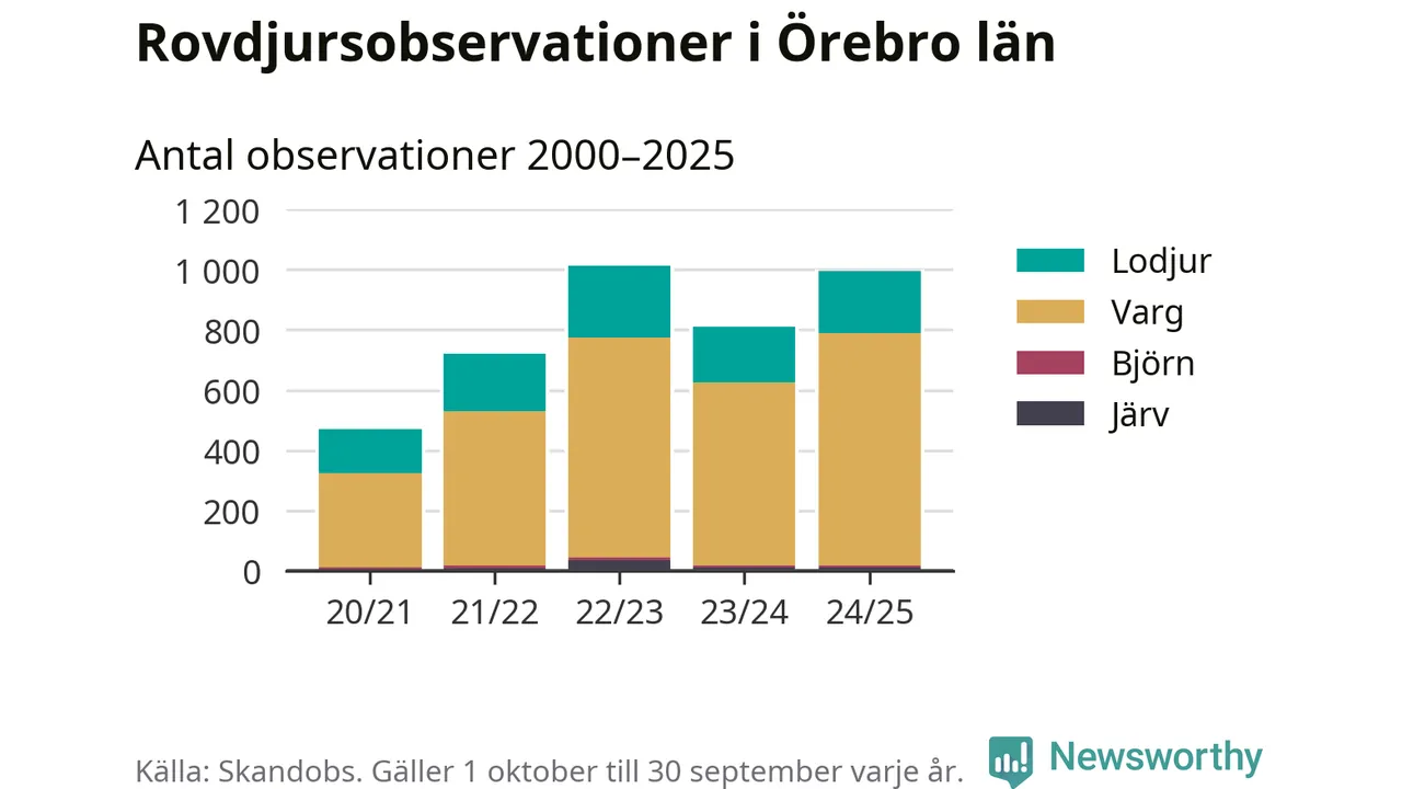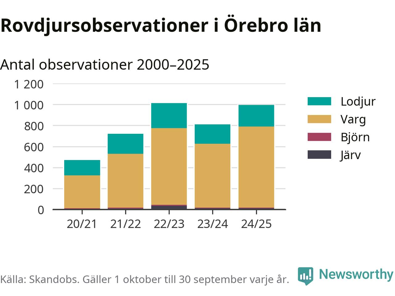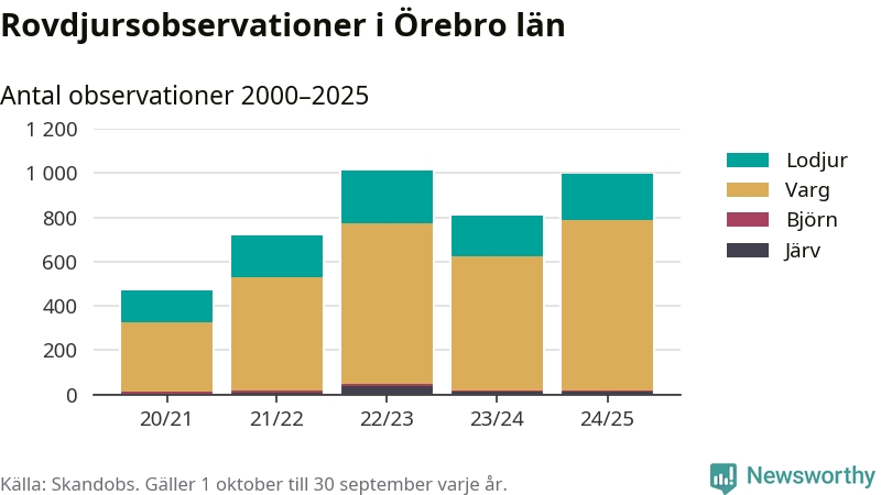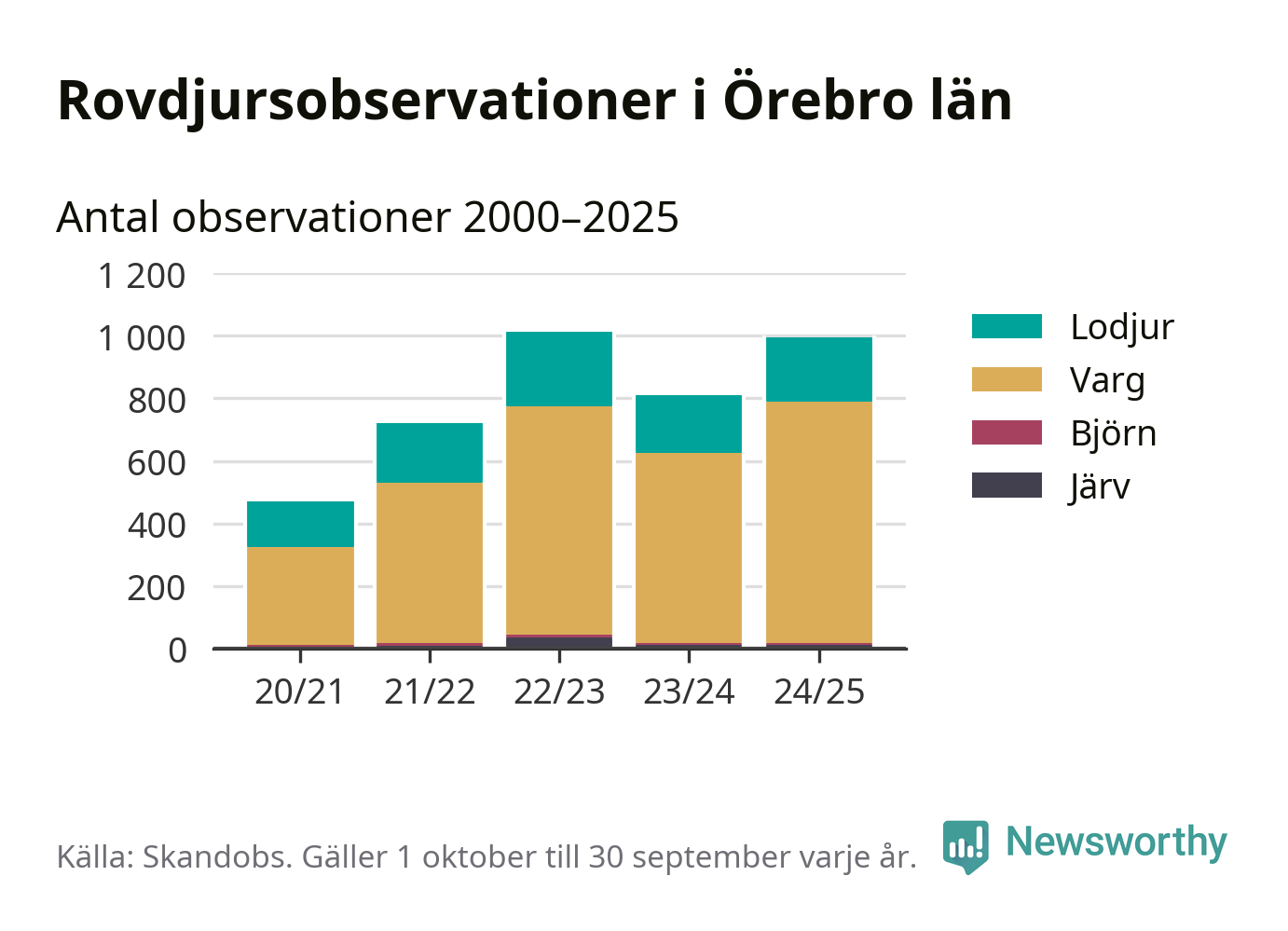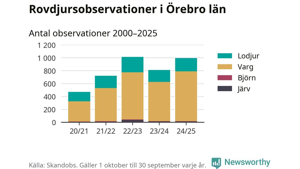 Där kan vem som helst rapportera sina observationer av de stora rovdjuren björn, varg, lodjur och järv. Mellan 1 oktober 2024 och 30 september i år har knappt 10 000 observationer registrerats i landet. Det kan vara synobservationer, foton, spår, spillning, döda bytesdjur eller andra tecken på rovdjursförekomst. I Örebro län finns totalt 994 rapporter, om alla fyra rovdjur.