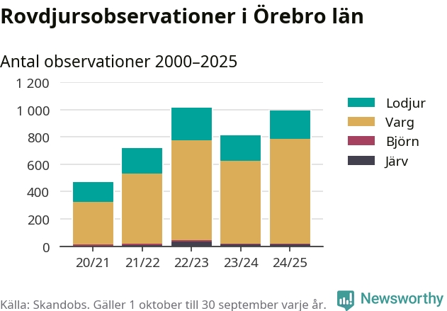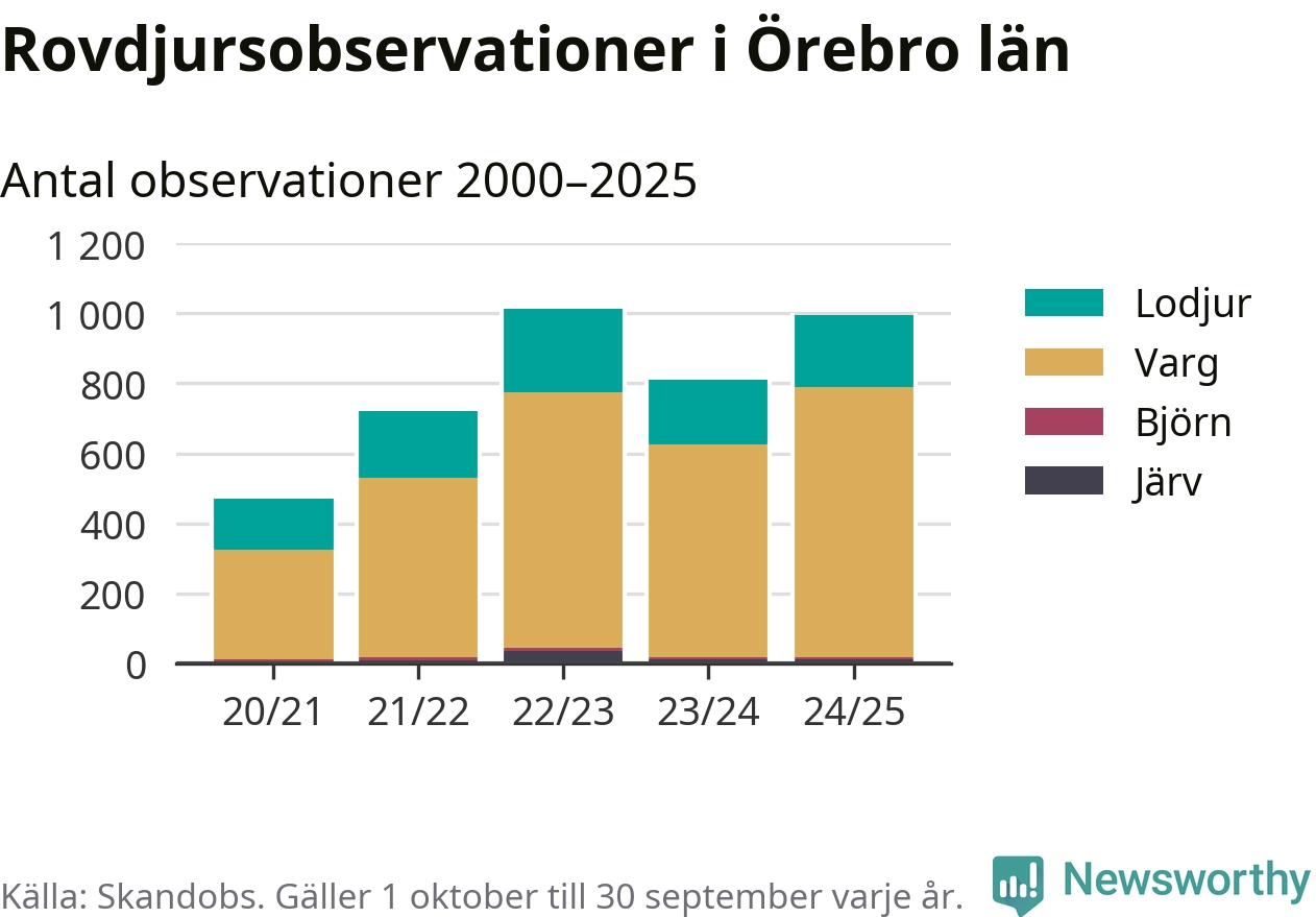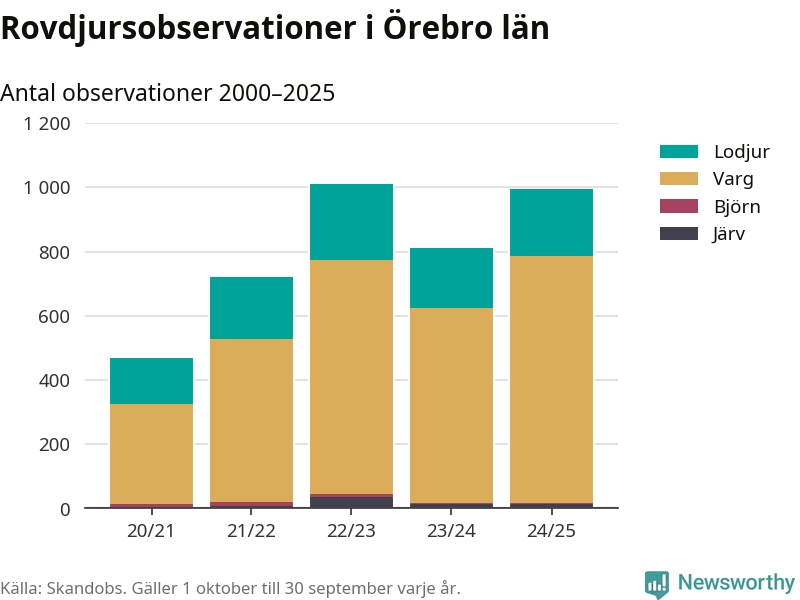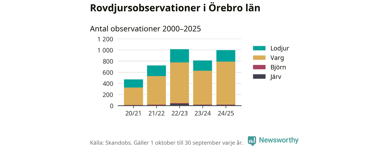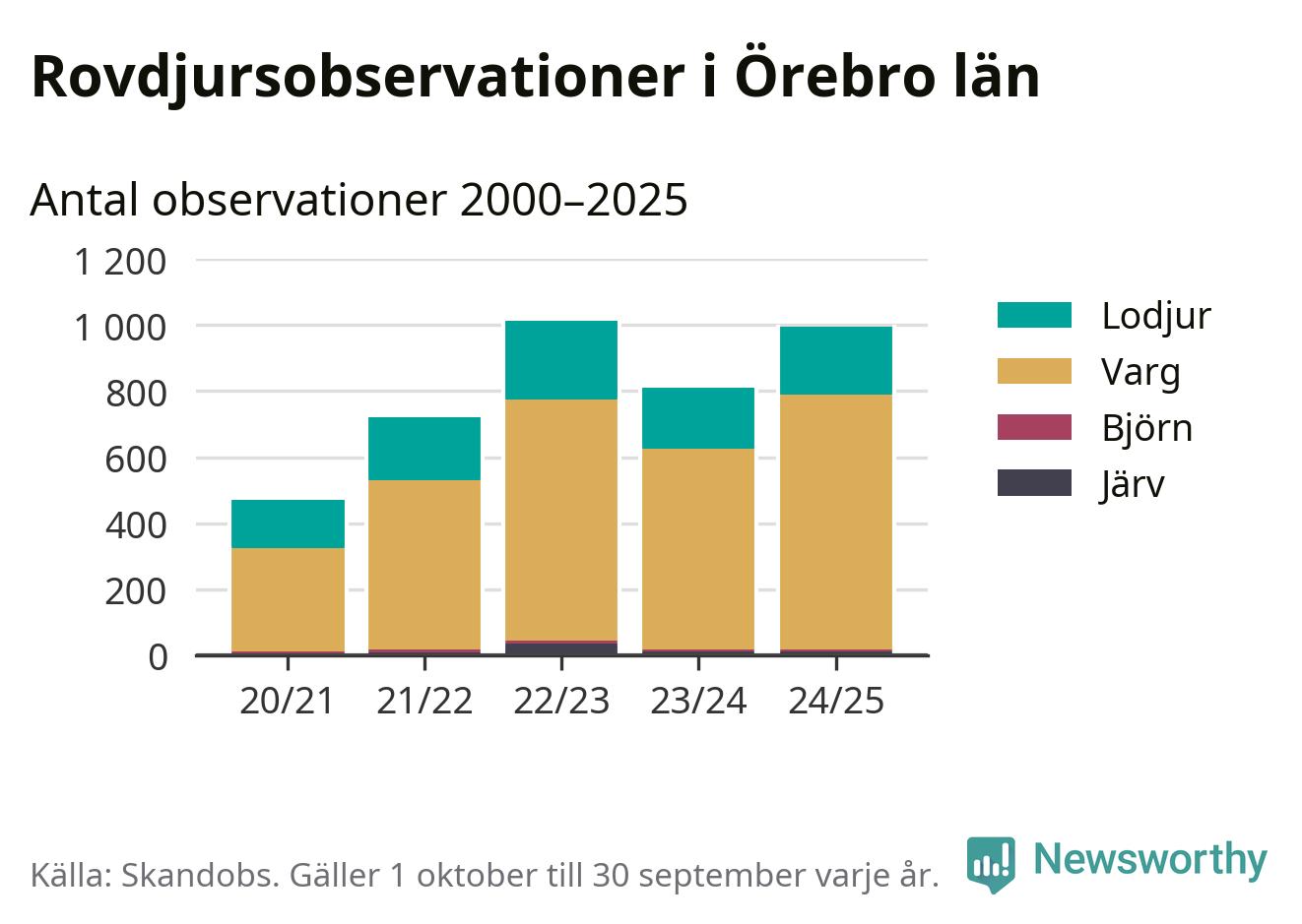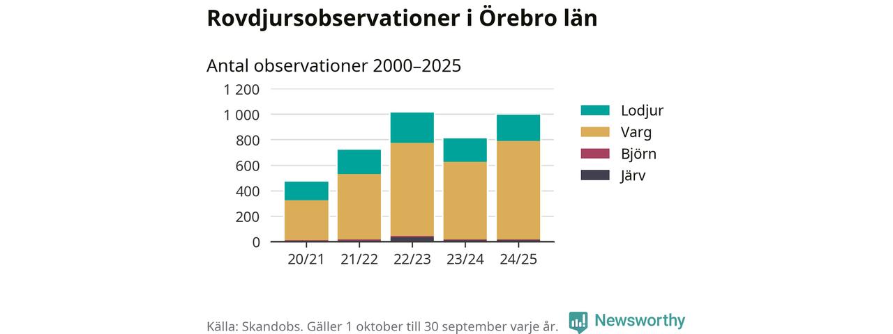 Där kan vem som helst rapportera sina observationer av de stora rovdjuren björn, varg, lodjur och järv. Mellan 1 oktober 2024 och 30 september i år har knappt 10 000 observationer registrerats i landet. Det kan vara synobservationer, foton, spår, spillning, döda bytesdjur eller andra tecken på rovdjursförekomst. I Örebro län finns totalt 994 rapporter, om alla fyra rovdjur.