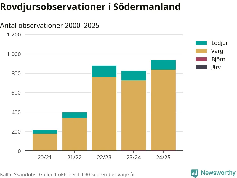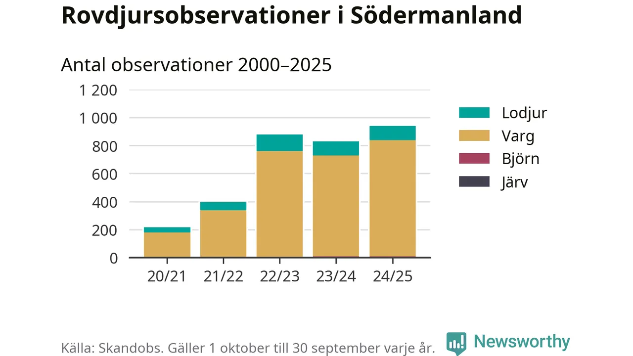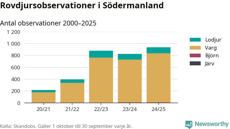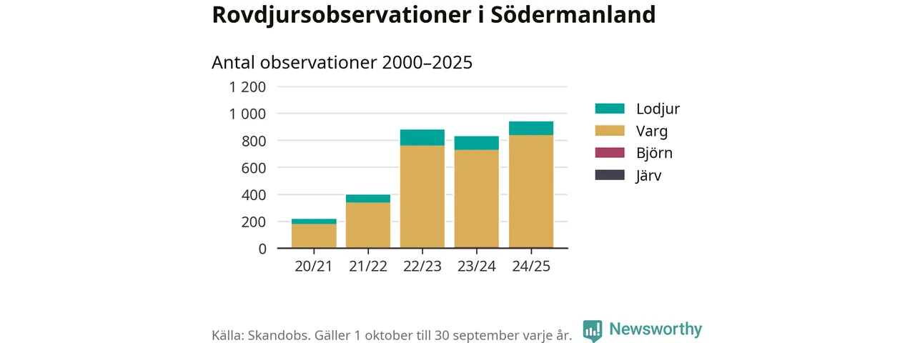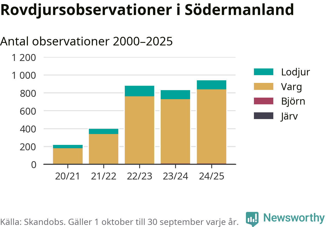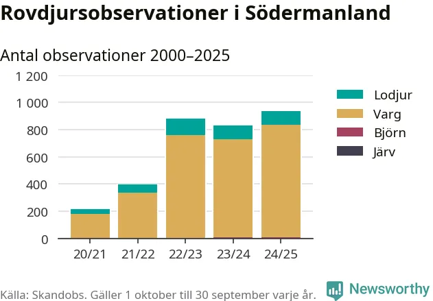 Källa och metod Newsworthy har begärt ut alla observationer som finns i Skandobs databas mellan 1 oktober 2020 och 30 september 2025. Vi har sedan räknat bort observationer som bedömts vara fel art av länsstyrelsen. Däremot finns observationer som inte har bedömts, eller som inte kunnat bedömas, kvar i materialet. Vi räknar här per år från 1 oktober till 30 september. Kommun och län baseras på den koordinat som observationen är registrerad på, och den kopplingen görs av Skandobs.