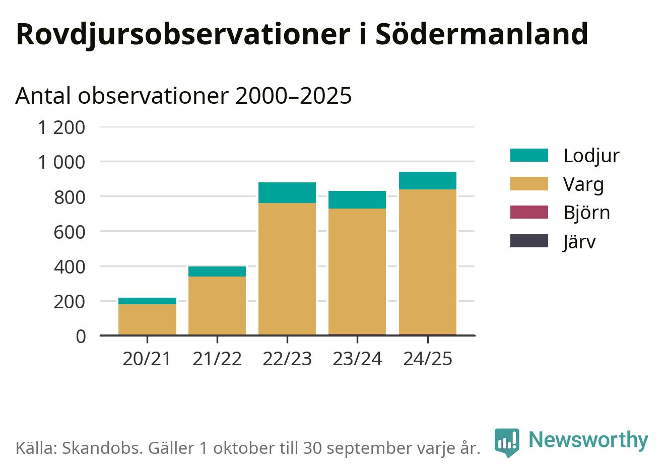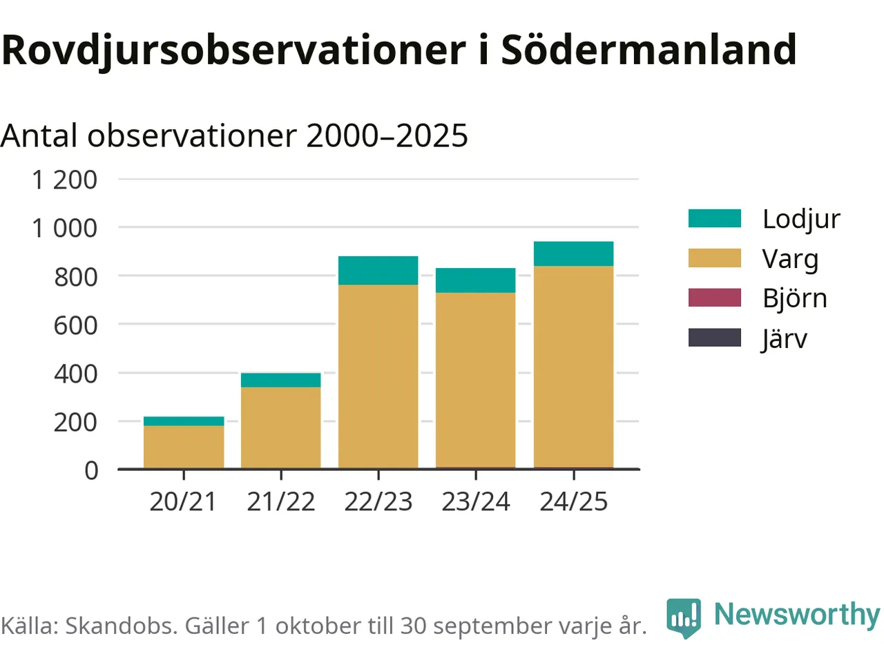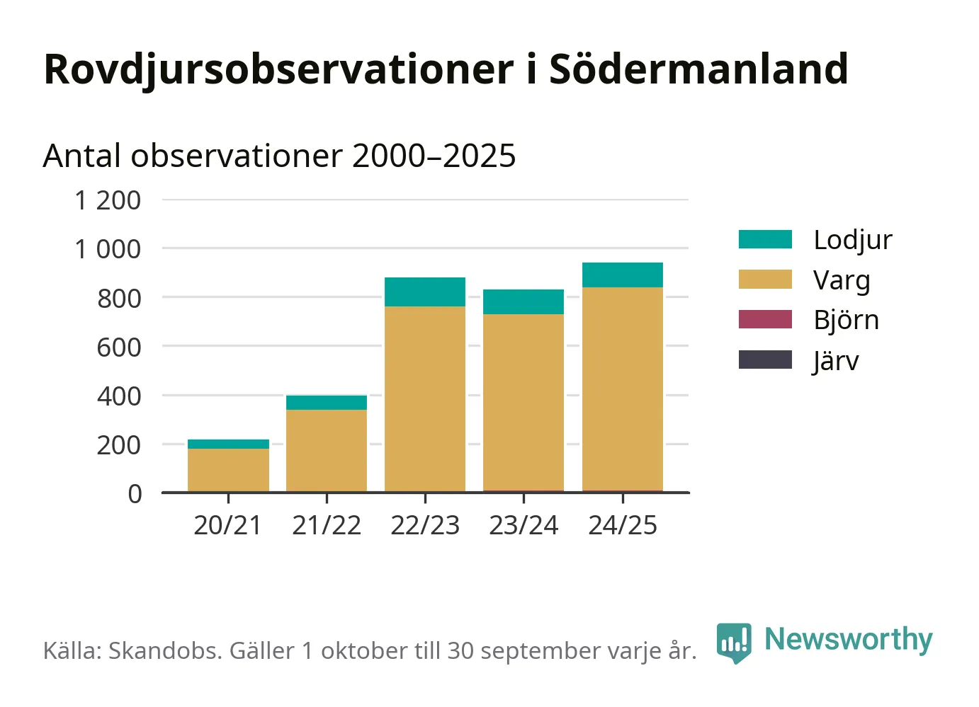 Källa och metod Newsworthy har begärt ut alla observationer som finns i Skandobs databas mellan 1 oktober 2020 och 30 september 2025. Vi har sedan räknat bort observationer som bedömts vara fel art av länsstyrelsen. Däremot finns observationer som inte har bedömts, eller som inte kunnat bedömas, kvar i materialet. Vi räknar här per år från 1 oktober till 30 september. Kommun och län baseras på den koordinat som observationen är registrerad på, och den kopplingen görs av Skandobs.