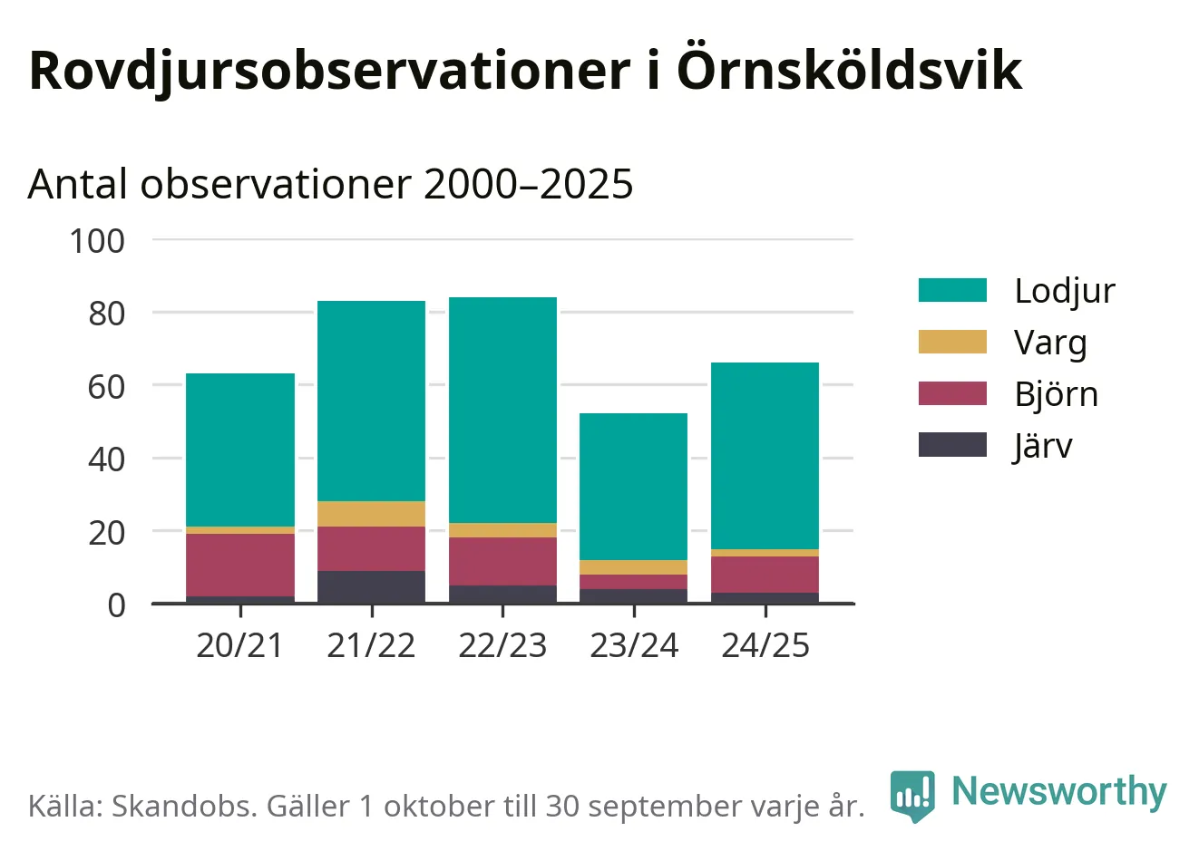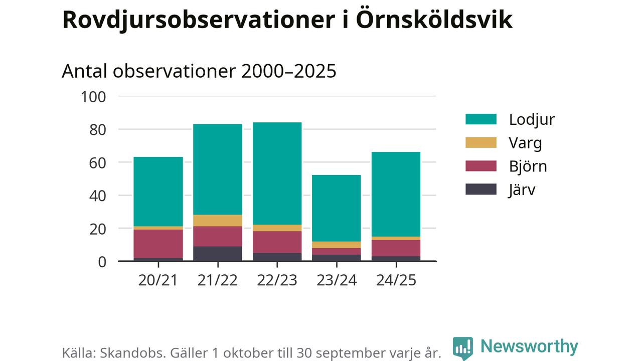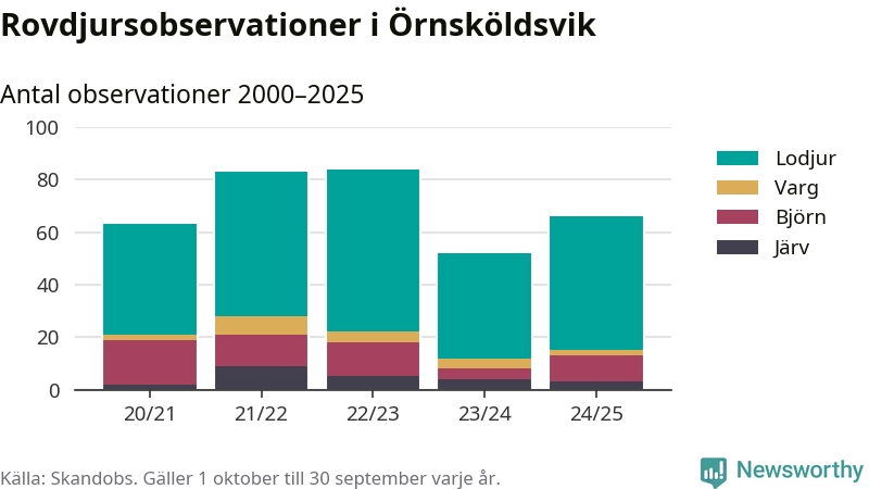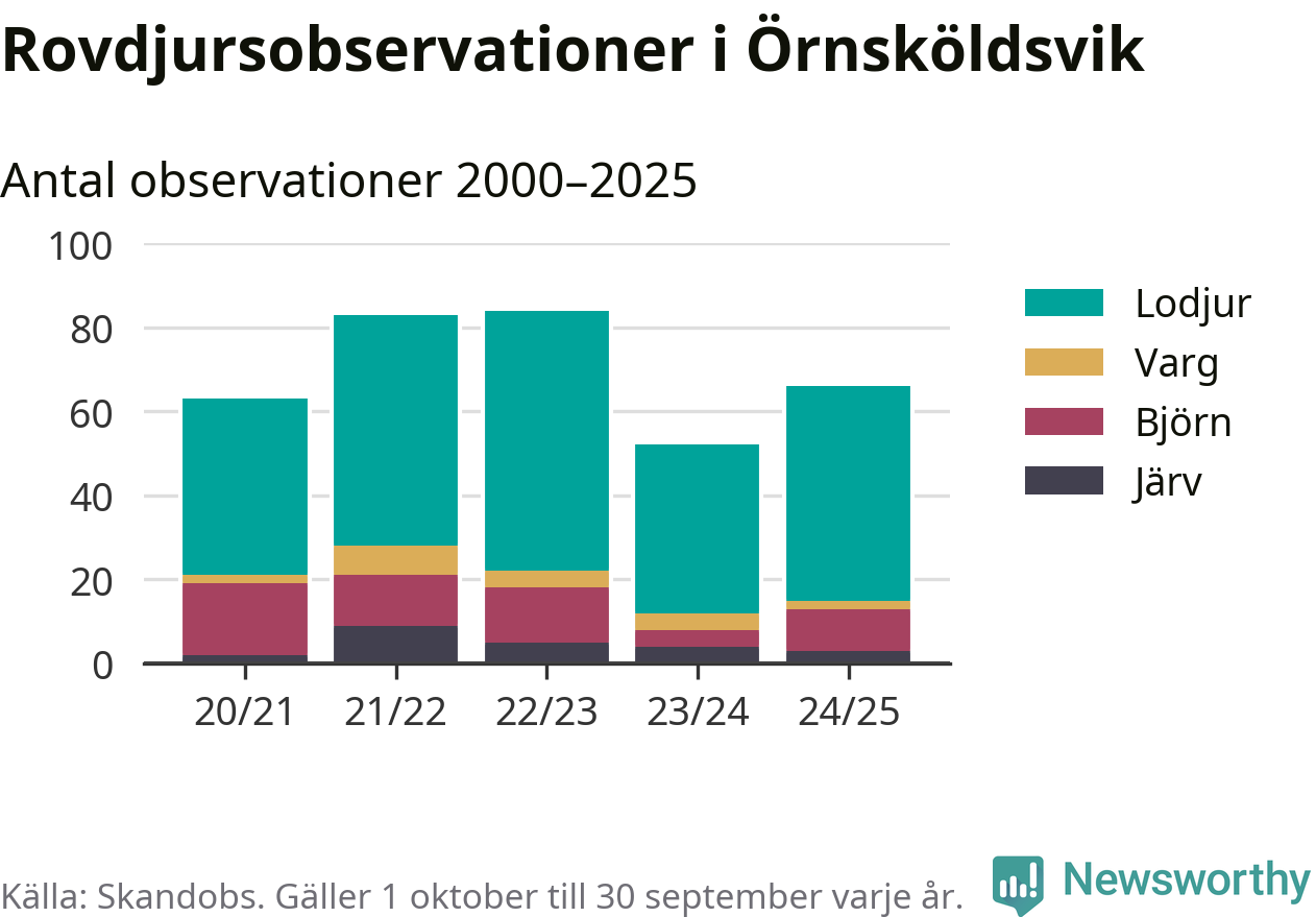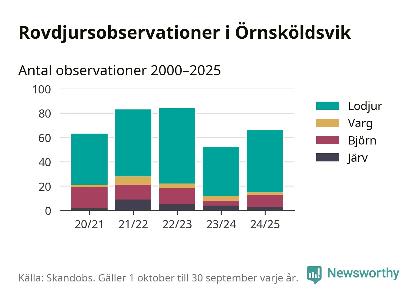 Där kan vem som helst rapportera sina observationer av de stora rovdjuren björn, varg, lodjur och järv. Mellan 1 oktober 2024 och 30 september i år har knappt 10 000 observationer registrerats i landet. Det kan vara synobservationer, foton, spår, spillning, döda bytesdjur eller andra tecken på rovdjursförekomst. I Örnsköldsvik finns totalt 66 rapporter, om alla fyra rovdjur.
