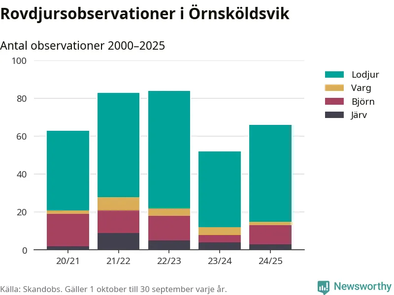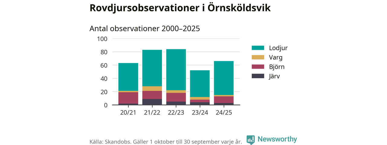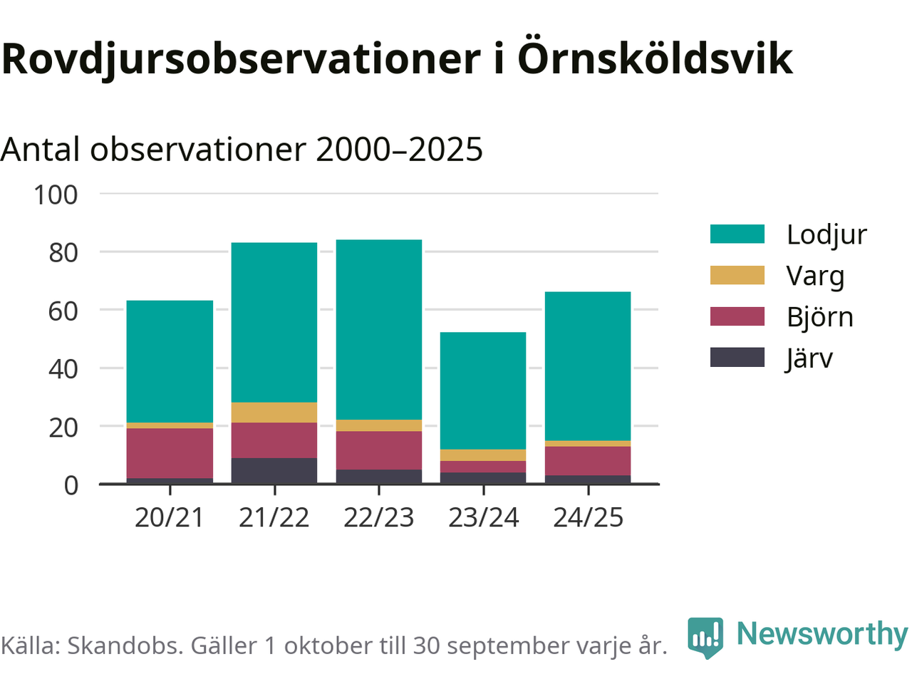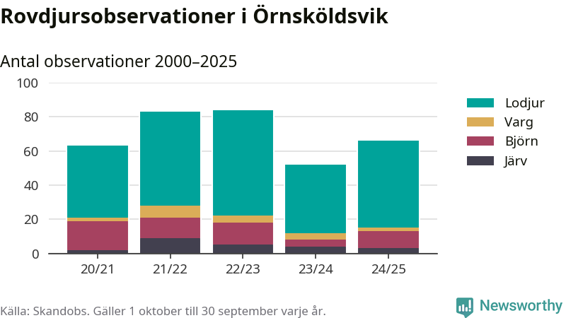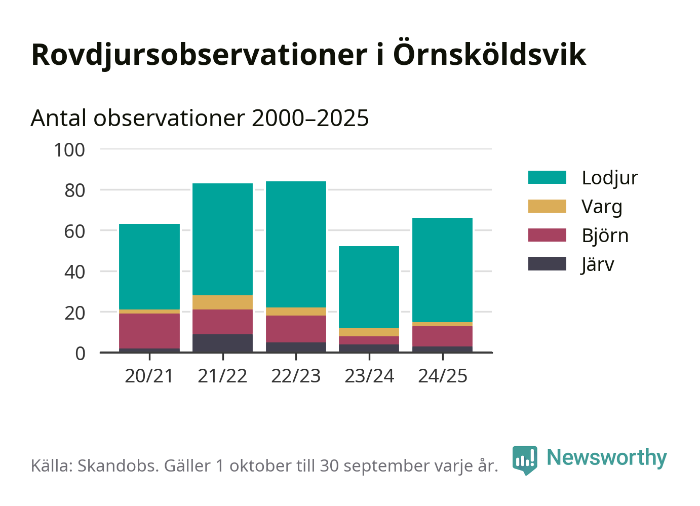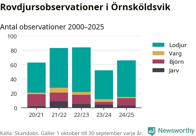 Där kan vem som helst rapportera sina observationer av de stora rovdjuren björn, varg, lodjur och järv. Mellan 1 oktober 2024 och 30 september i år har knappt 10 000 observationer registrerats i landet. Det kan vara synobservationer, foton, spår, spillning, döda bytesdjur eller andra tecken på rovdjursförekomst. I Örnsköldsvik finns totalt 66 rapporter, om alla fyra rovdjur.
