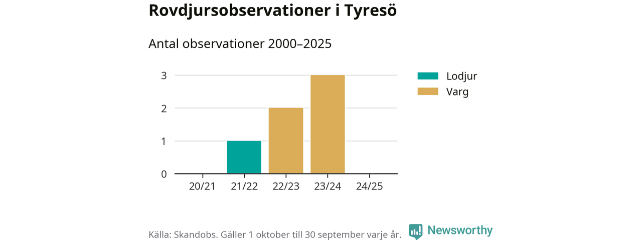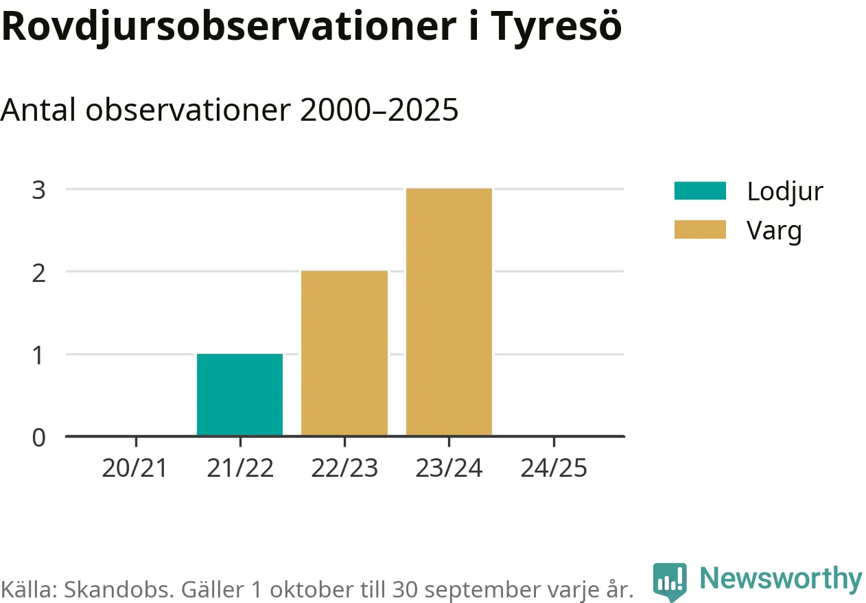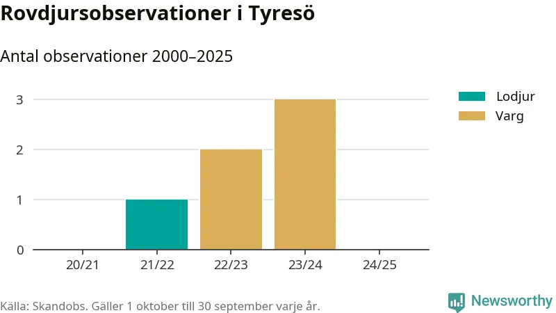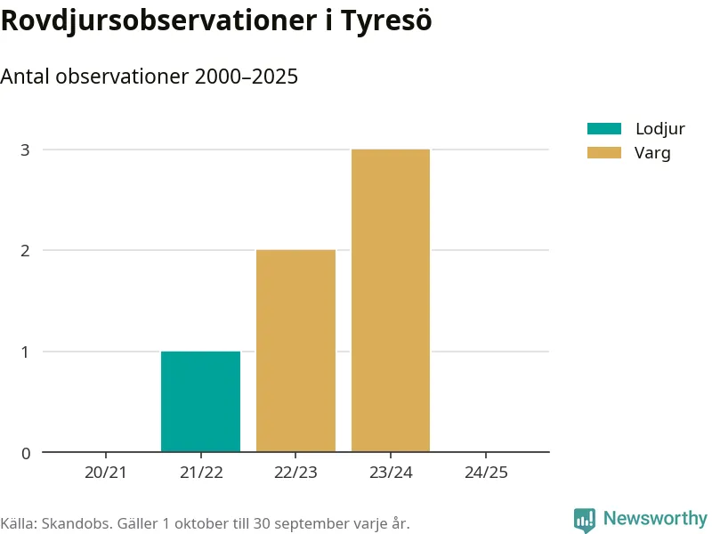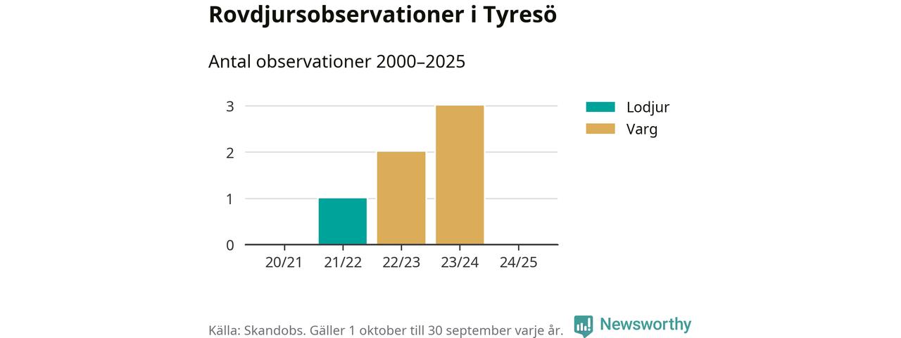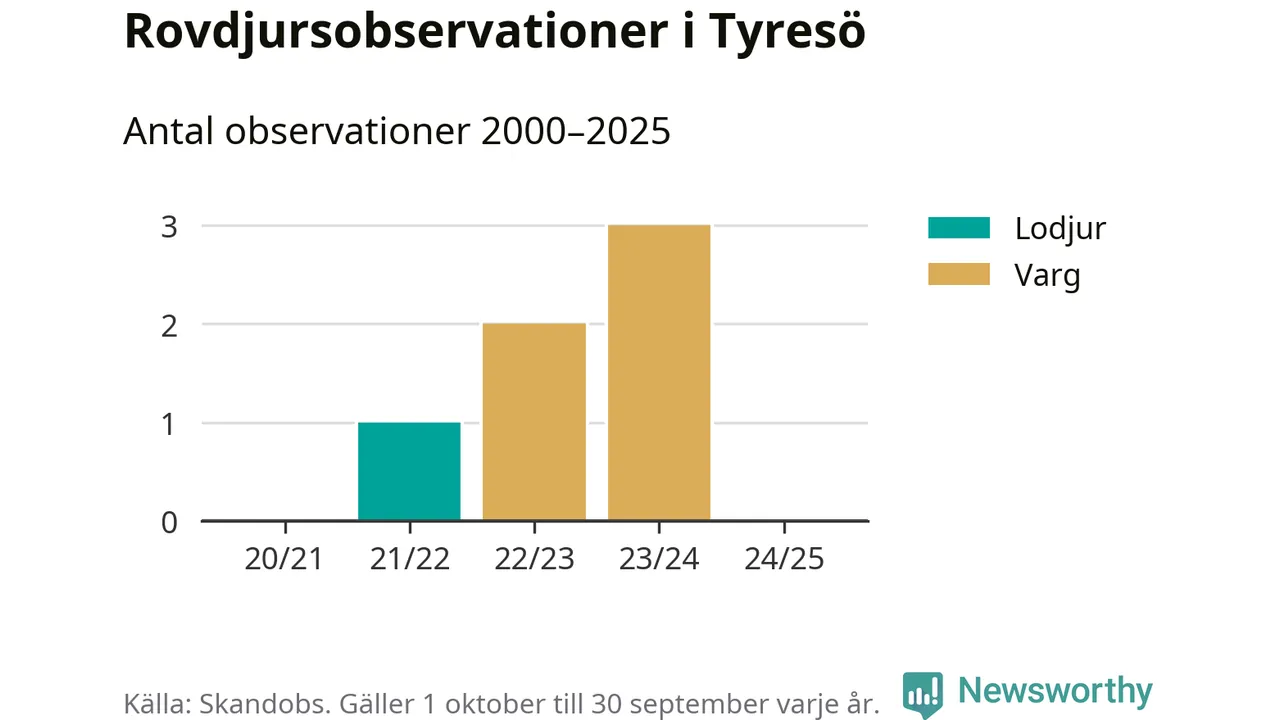 Den 18 maj 2024 säger sig någon ha sett en varg i Tyresö. Det är den senaste observationen av arten i kommunen som finns registrerad i den skandinaviska rovdjursdatabasen Skandobs.