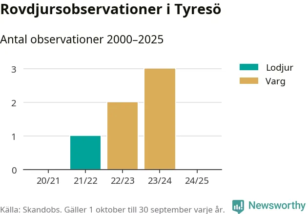 Genom åren har varg och lodjur synts till i Tyresö – men under det senaste året finns inga nya observationer registrerade. I Stockholms län finns dock rapporter om lodjur, varg, björn och järv.