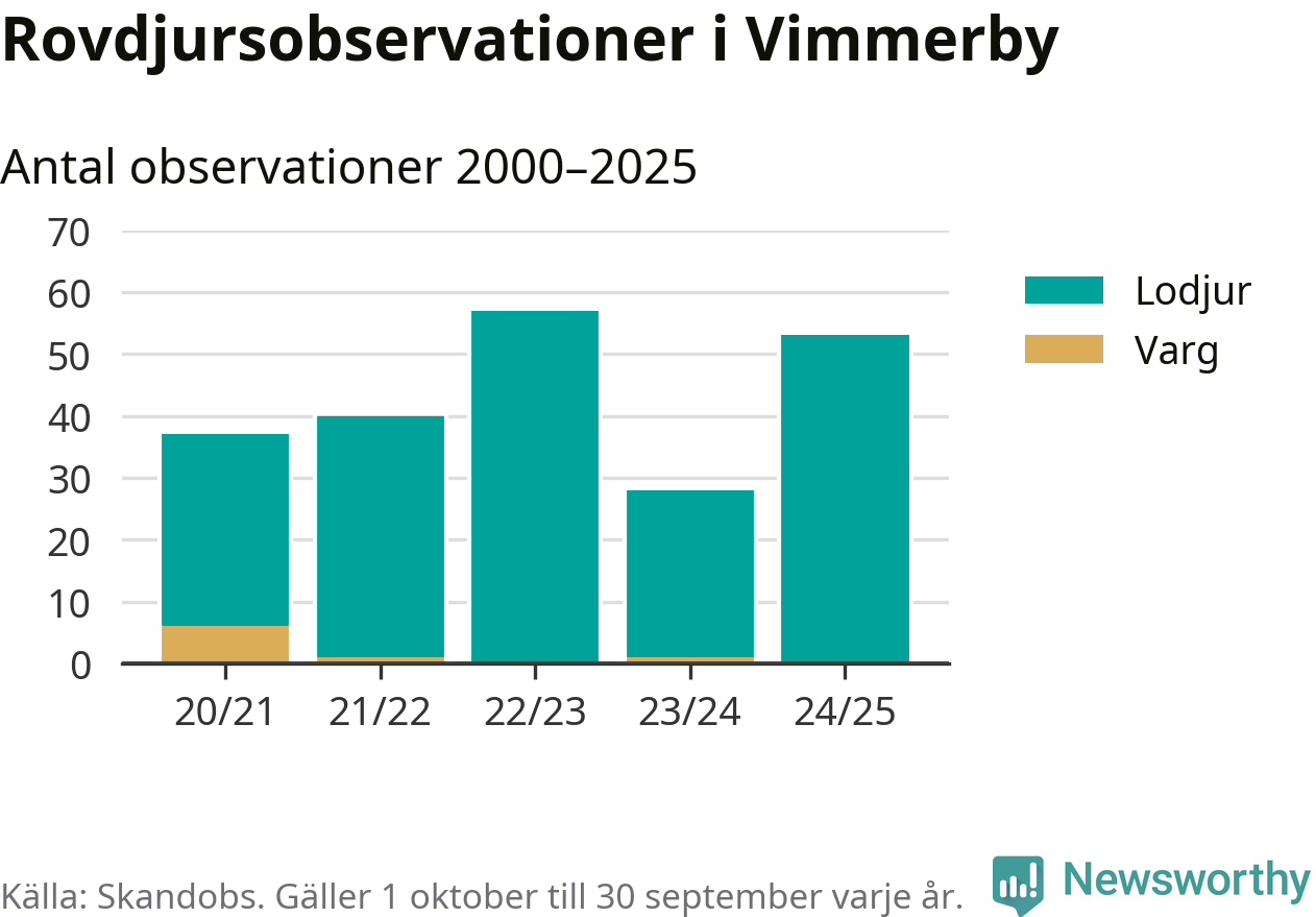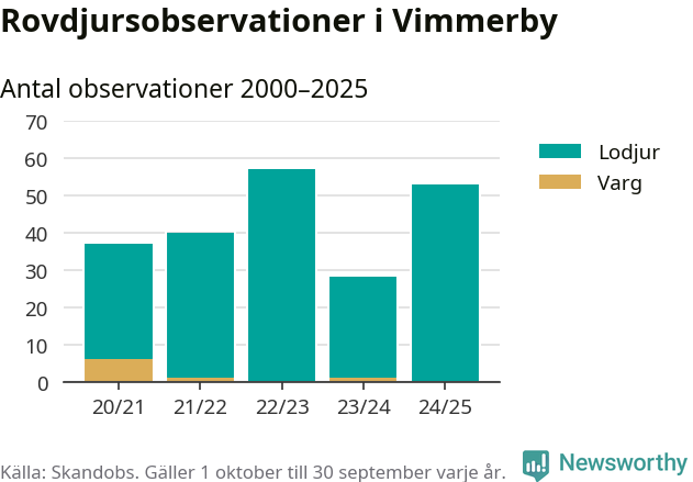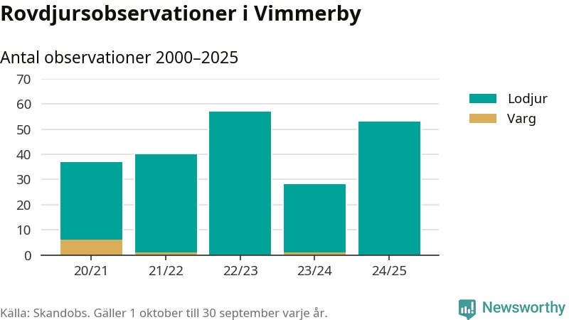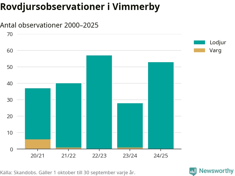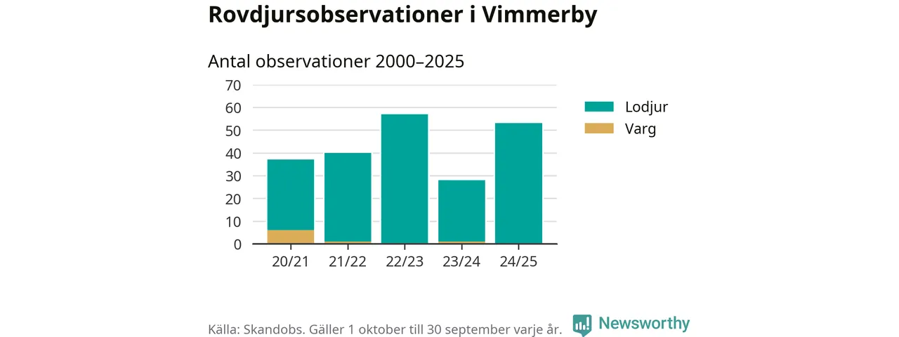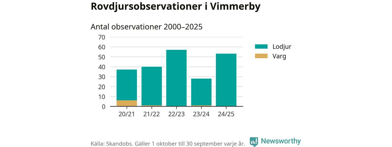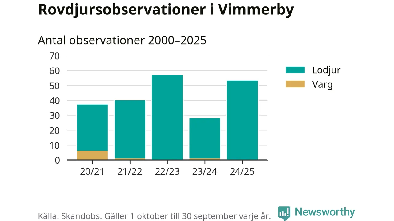 Där kan vem som helst rapportera sina observationer av de stora rovdjuren björn, varg, lodjur och järv. Mellan 1 oktober 2024 och 30 september i år har knappt 10 000 observationer registrerats i landet. Det kan vara synobservationer, foton, spår, spillning, döda bytesdjur eller andra tecken på rovdjursförekomst. I Vimmerby handlar det om totalt 53 observationer av lodjur.