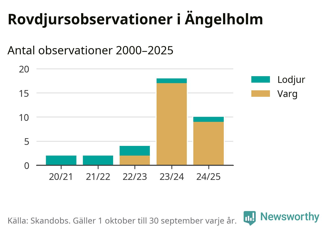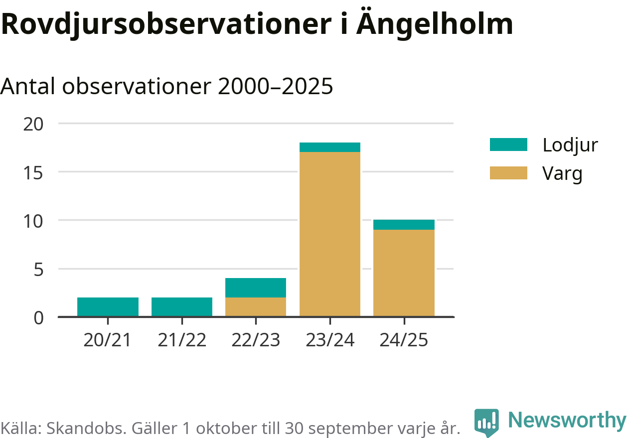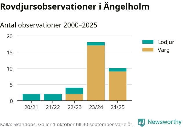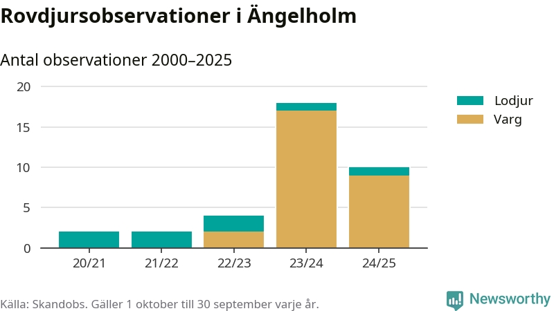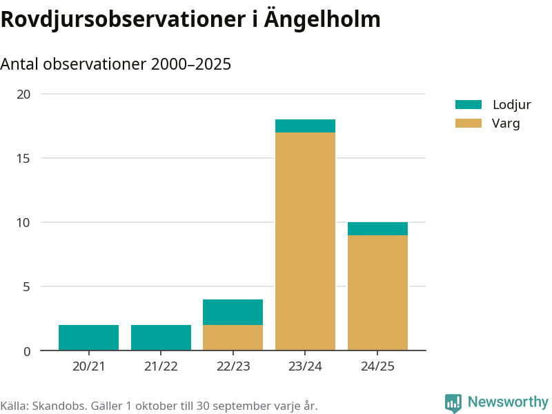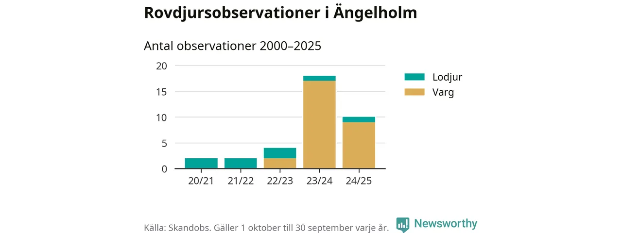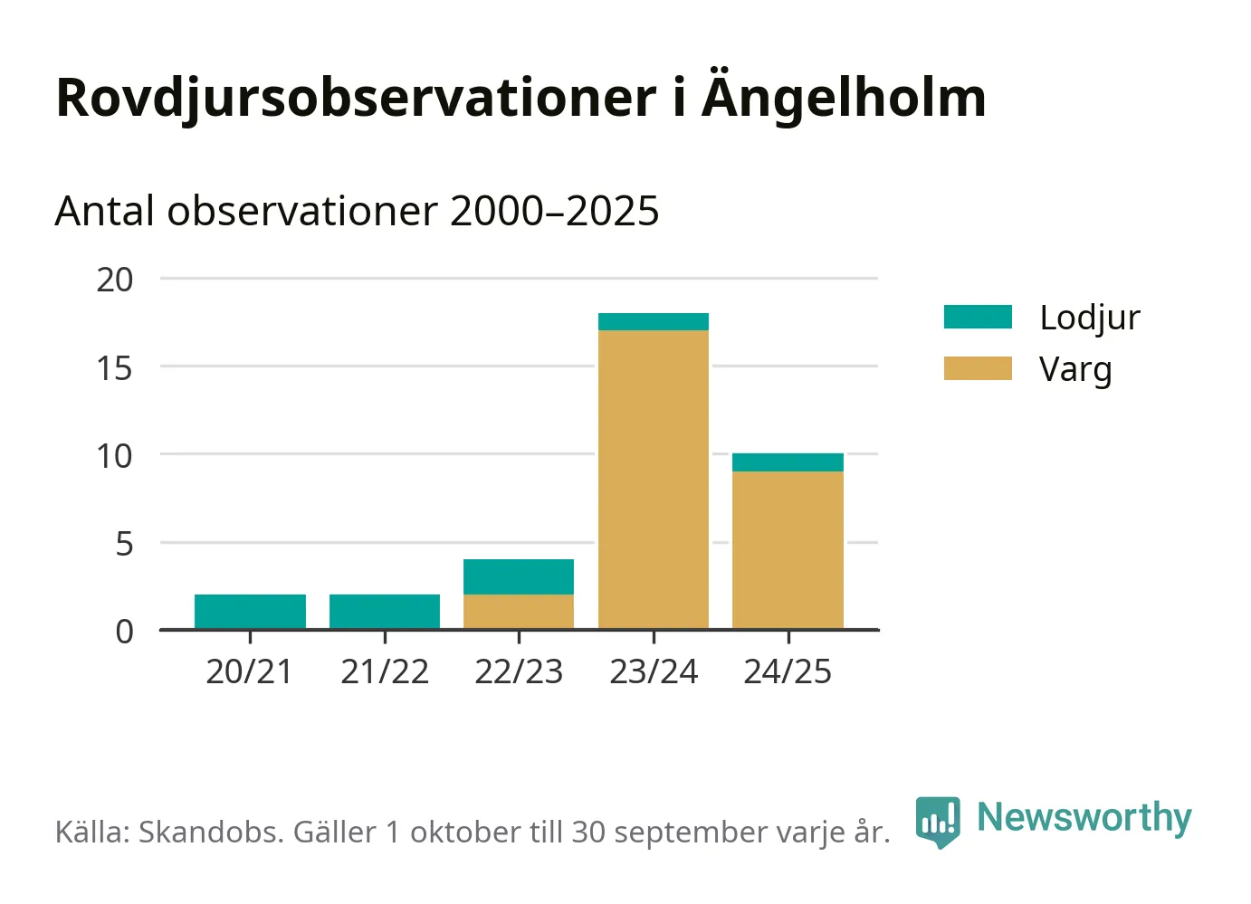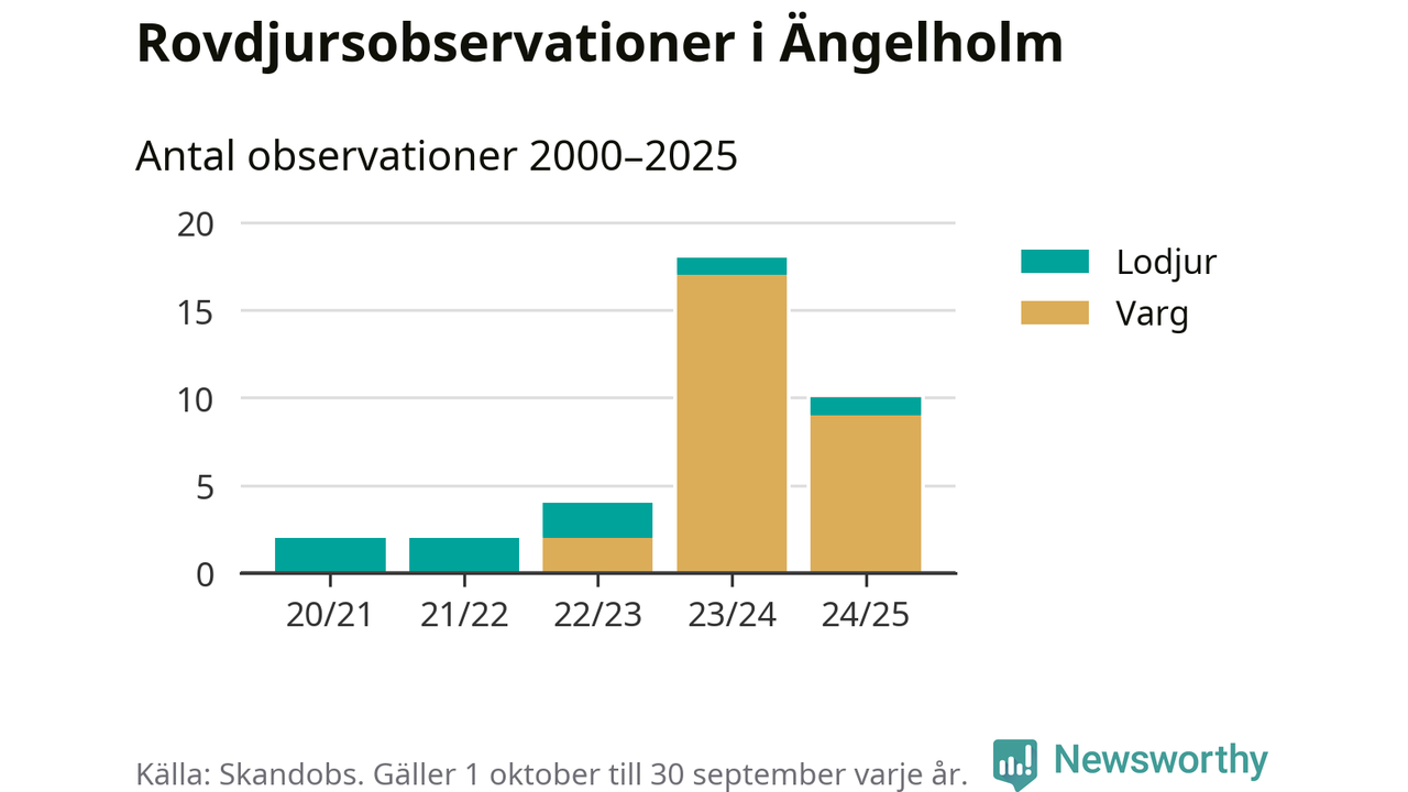 Där kan vem som helst rapportera sina observationer av de stora rovdjuren björn, varg, lodjur och järv. Mellan 1 oktober 2024 och 30 september i år har knappt 10 000 observationer registrerats i landet. Det kan vara synobservationer, foton, spår, spillning, döda bytesdjur eller andra tecken på rovdjursförekomst. I Ängelholm handlar det om totalt tio observationer av varg eller lodjur.