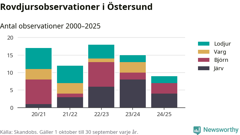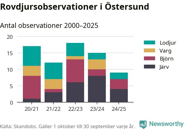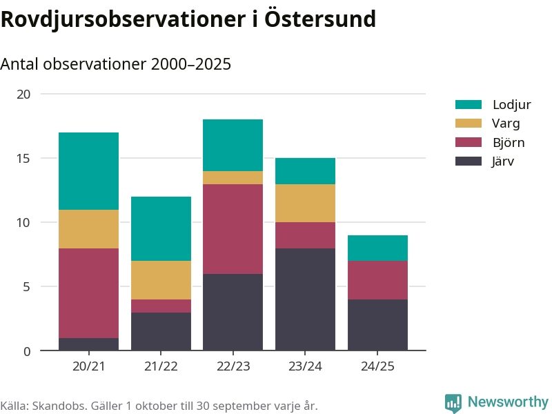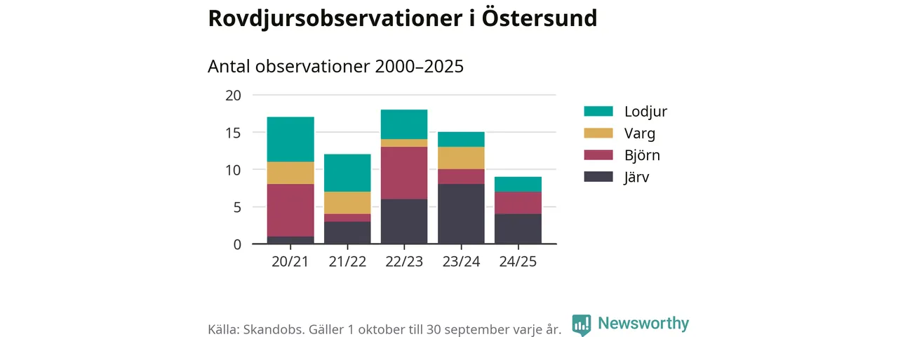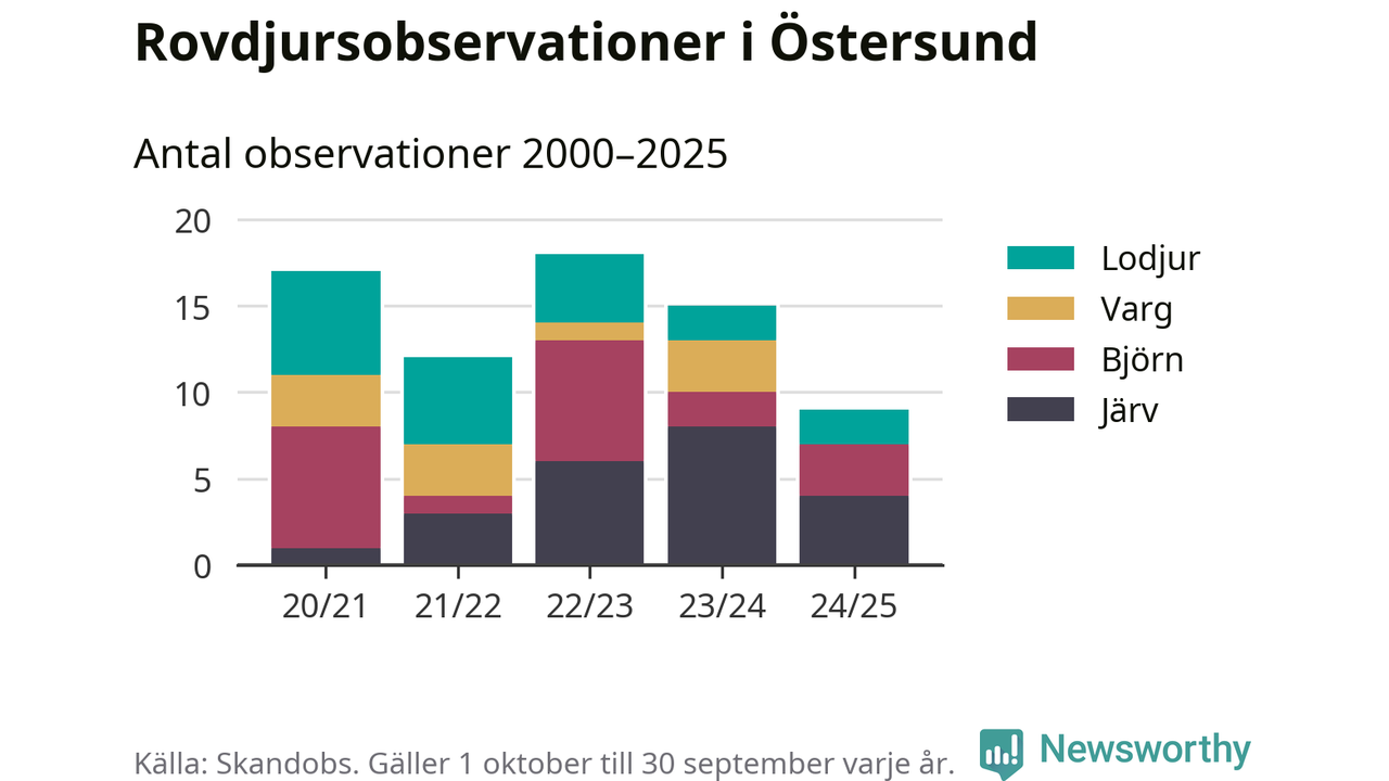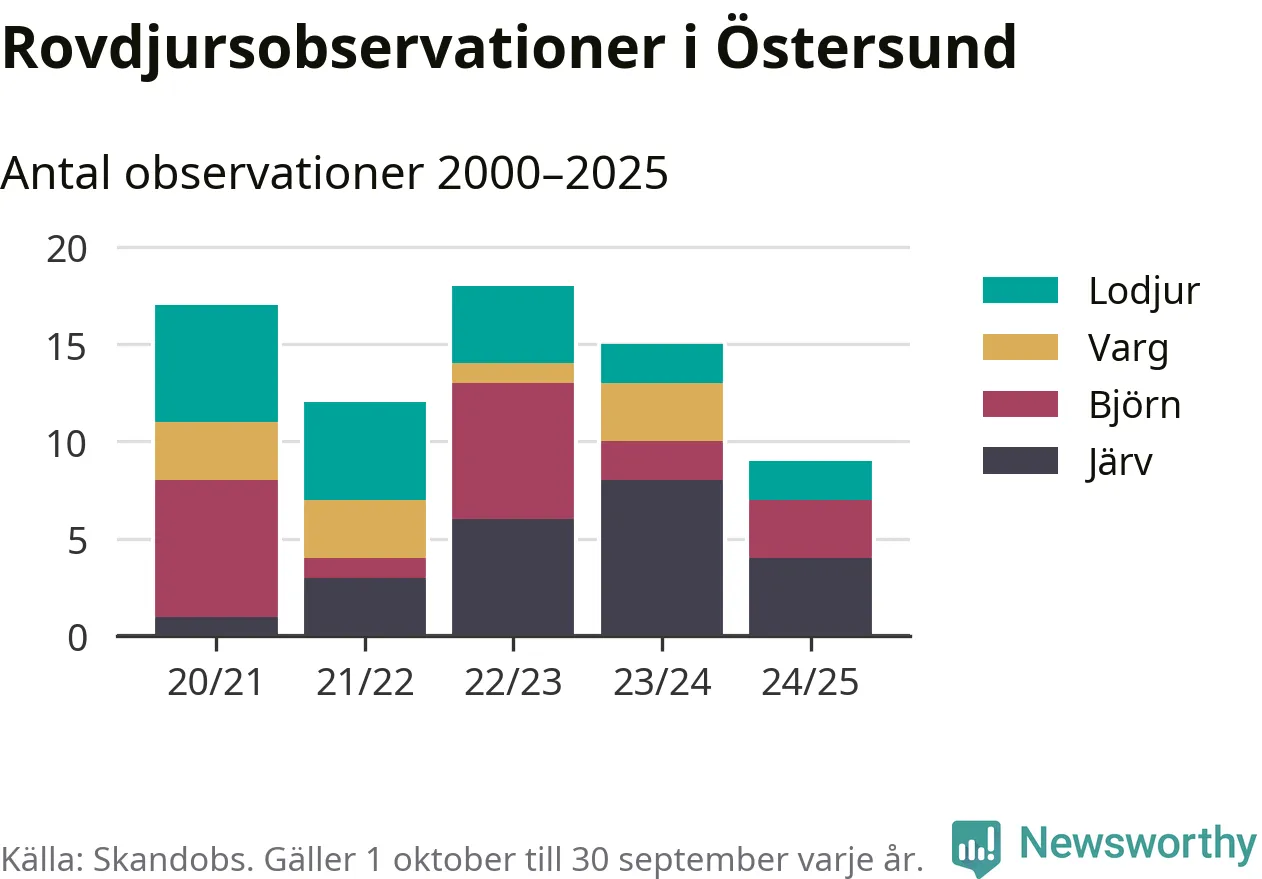 Där kan vem som helst rapportera sina observationer av de stora rovdjuren björn, varg, lodjur och järv. Mellan 1 oktober 2024 och 30 september i år har knappt 10 000 observationer registrerats i landet. Det kan vara synobservationer, foton, spår, spillning, döda bytesdjur eller andra tecken på rovdjursförekomst. I Östersund handlar det om totalt nio observationer av järv, björn eller lodjur.