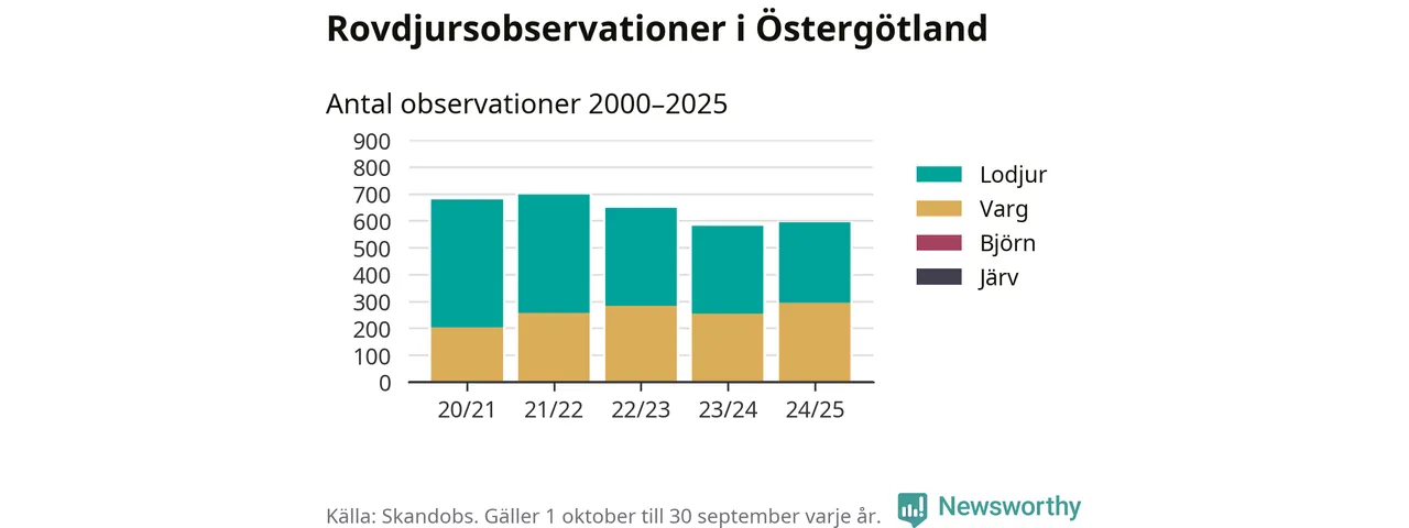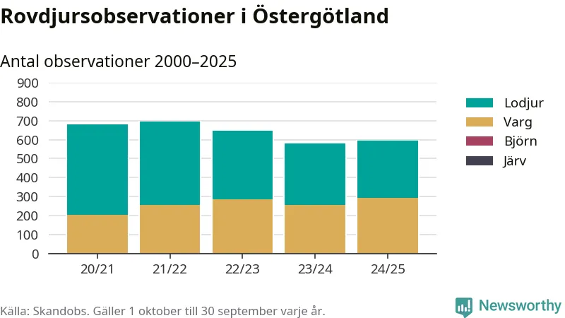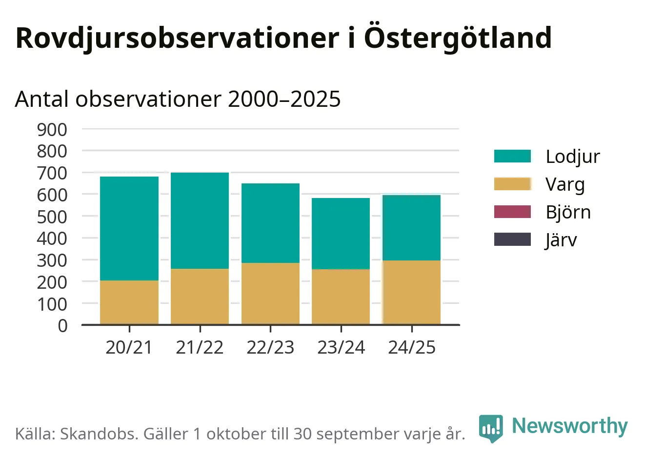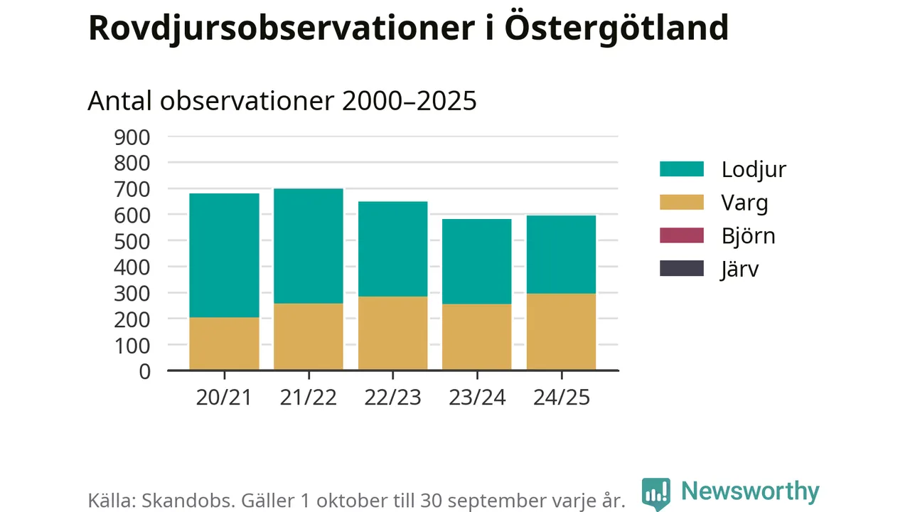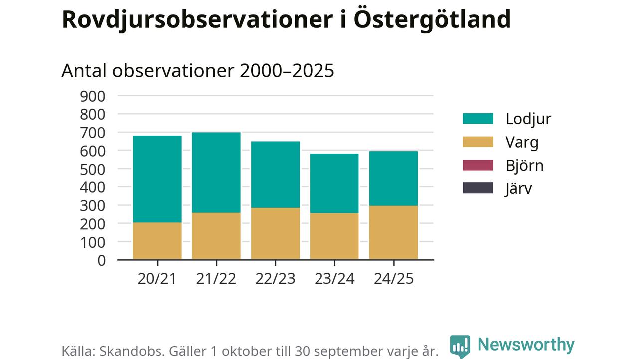 Där kan vem som helst rapportera sina observationer av de stora rovdjuren björn, varg, lodjur och järv. Mellan 1 oktober 2024 och 30 september i år har knappt 10 000 observationer registrerats i landet. Det kan vara synobservationer, foton, spår, spillning, döda bytesdjur eller andra tecken på rovdjursförekomst. I Östergötland handlar det om totalt 595 observationer av lodjur, varg eller björn.