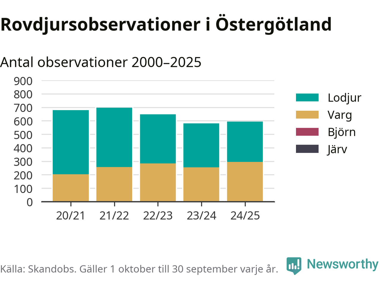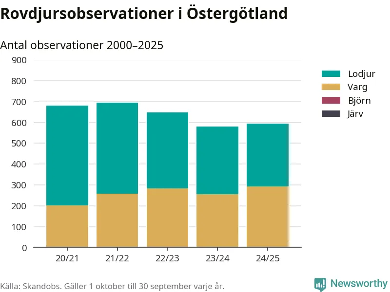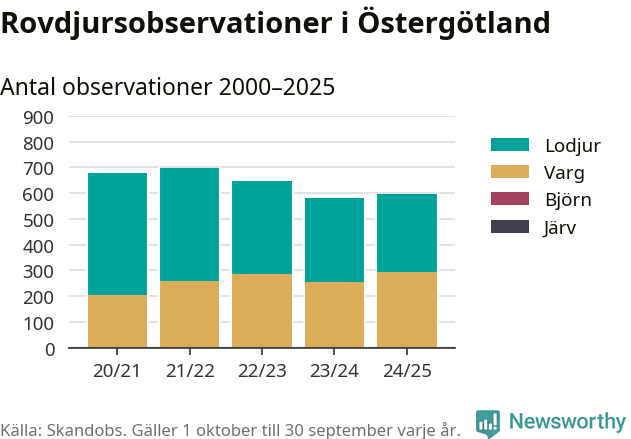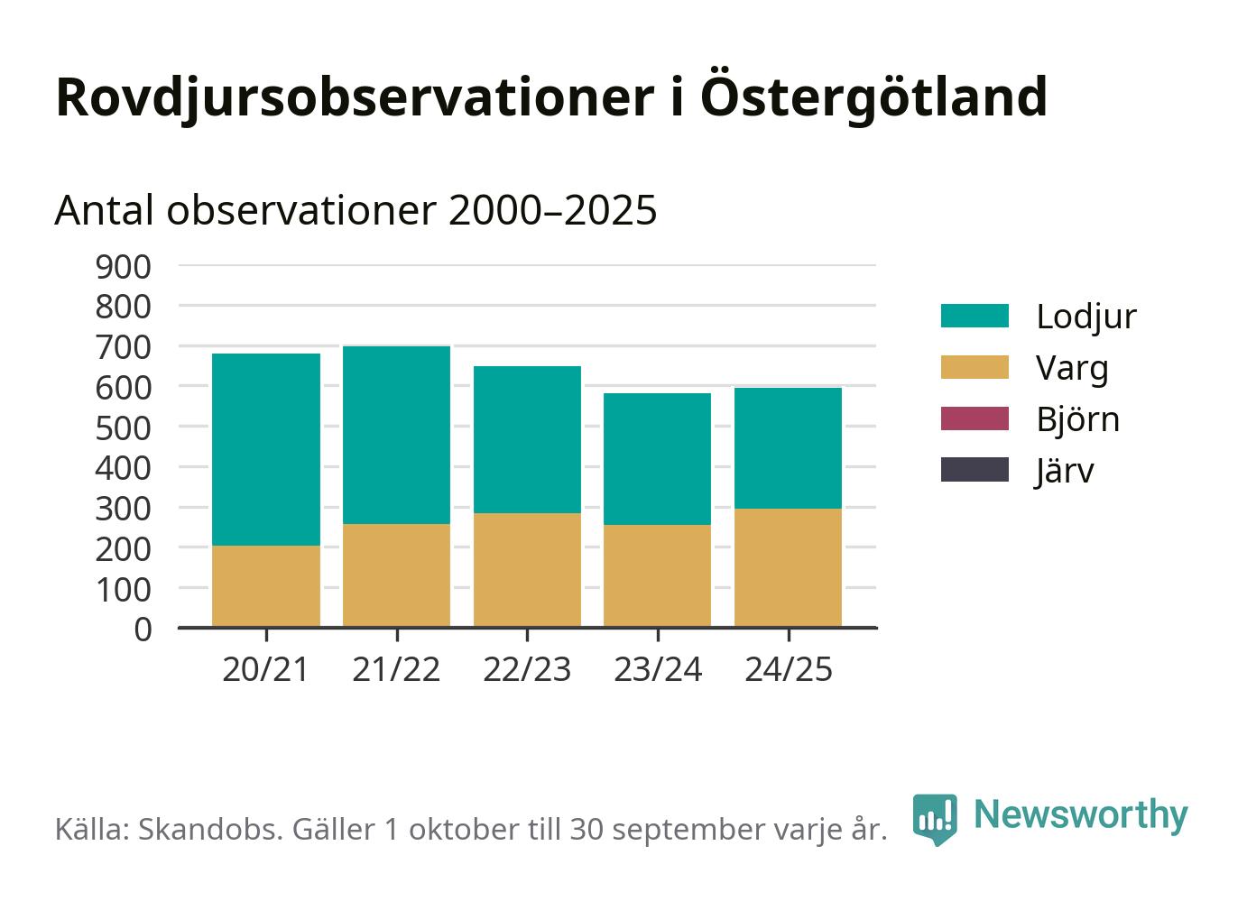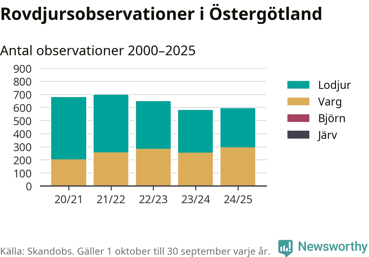 Där kan vem som helst rapportera sina observationer av de stora rovdjuren björn, varg, lodjur och järv. Mellan 1 oktober 2024 och 30 september i år har knappt 10 000 observationer registrerats i landet. Det kan vara synobservationer, foton, spår, spillning, döda bytesdjur eller andra tecken på rovdjursförekomst. I Östergötland handlar det om totalt 595 observationer av lodjur, varg eller björn.