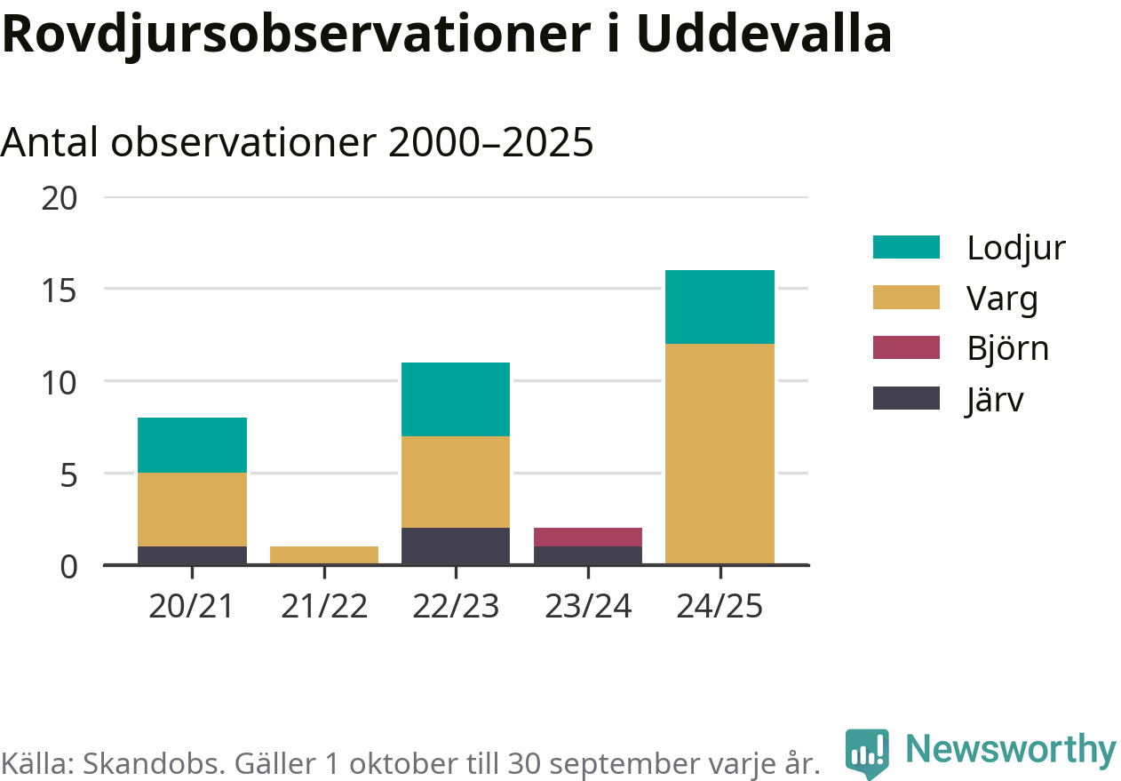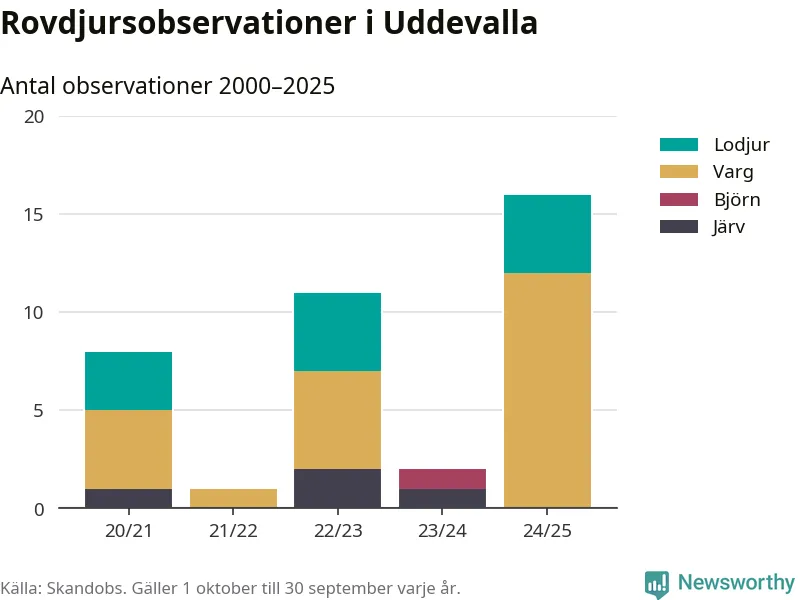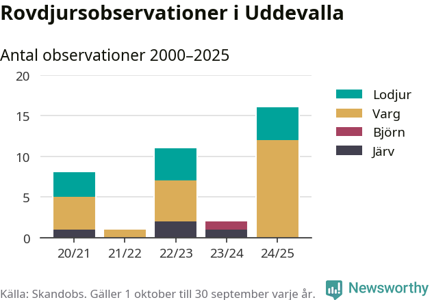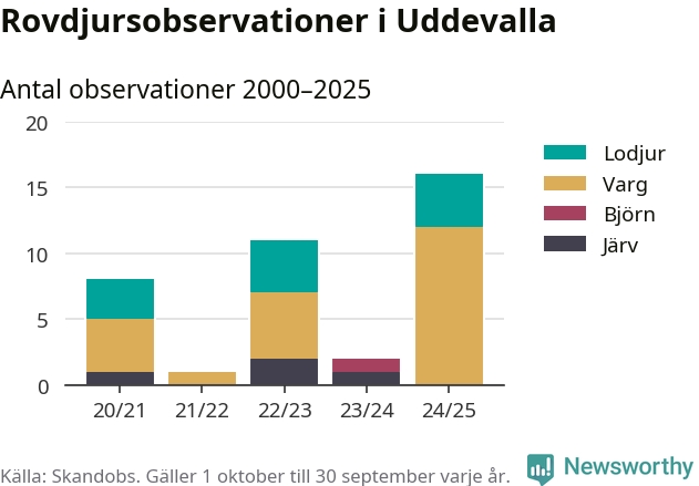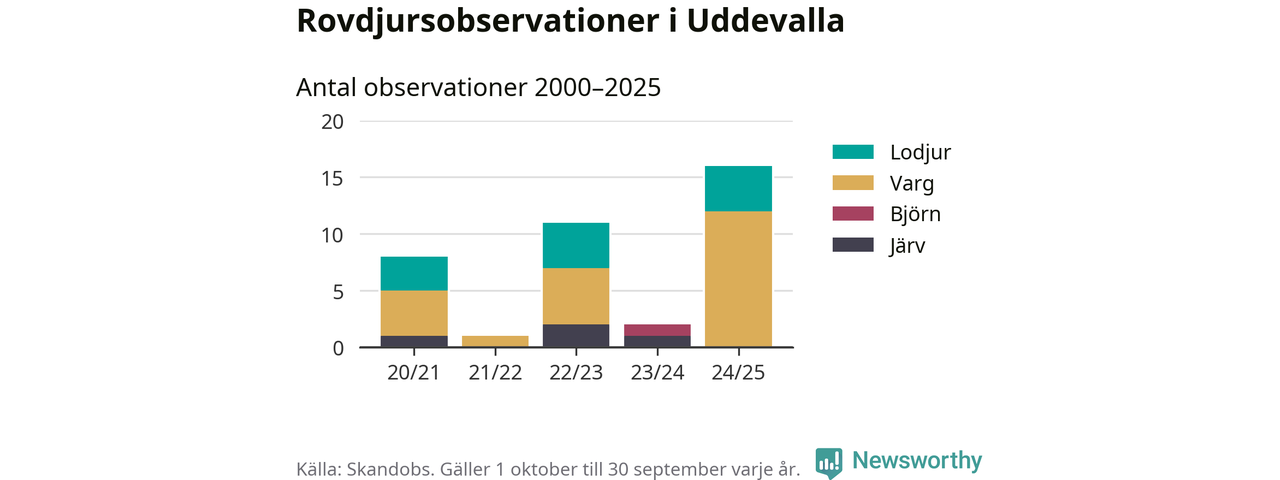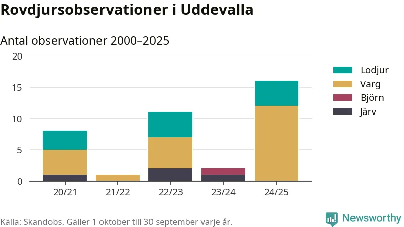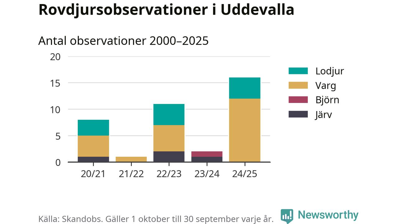Där kan vem som helst rapportera sina observationer av de stora rovdjuren björn, varg, lodjur och järv. Mellan 1 oktober 2024 och 30 september i år har knappt 10 000 observationer registrerats i landet. Det kan vara synobservationer, foton, spår, spillning, döda bytesdjur eller andra tecken på rovdjursförekomst. I Uddevalla handlar det om totalt 16 observationer av varg eller lodjur.