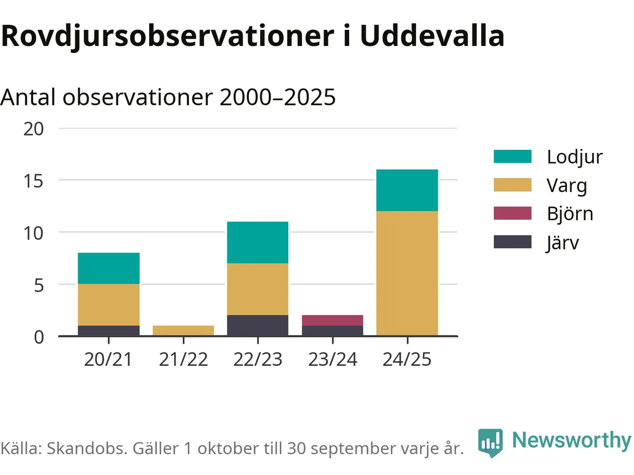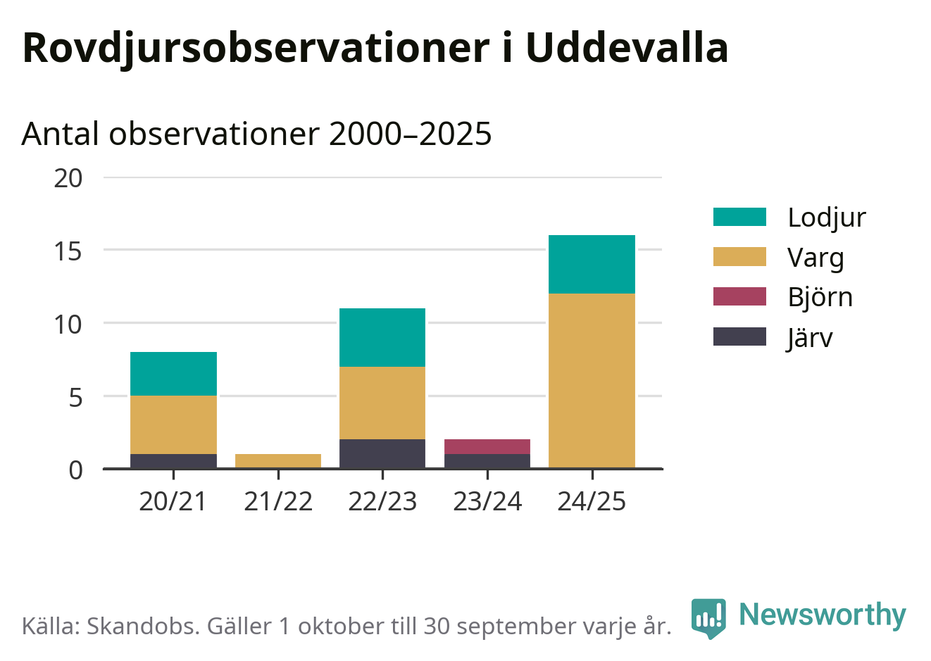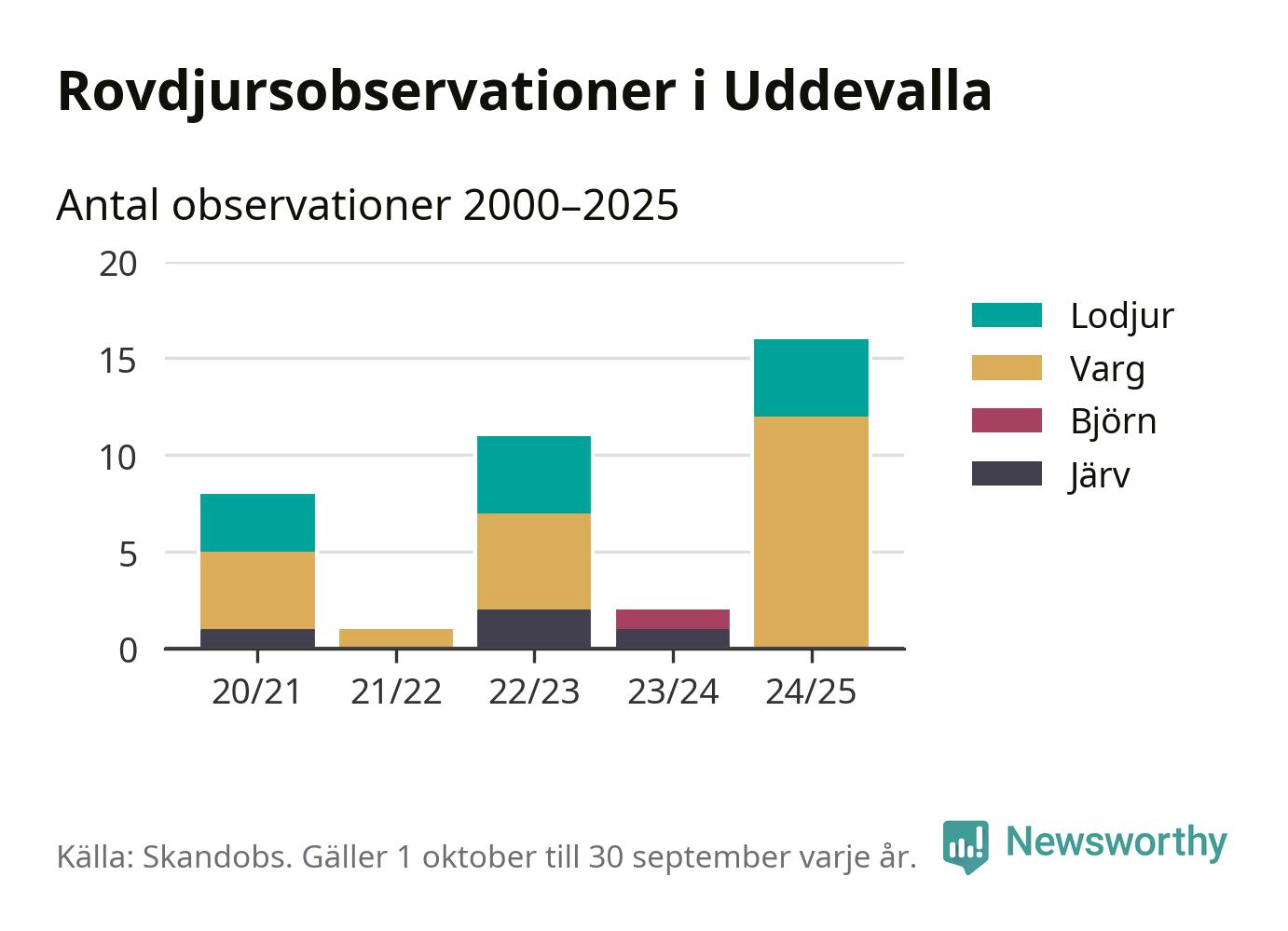 Där kan vem som helst rapportera sina observationer av de stora rovdjuren björn, varg, lodjur och järv. Mellan 1 oktober 2024 och 30 september i år har knappt 10 000 observationer registrerats i landet. Det kan vara synobservationer, foton, spår, spillning, döda bytesdjur eller andra tecken på rovdjursförekomst. I Uddevalla handlar det om totalt 16 observationer av varg eller lodjur.