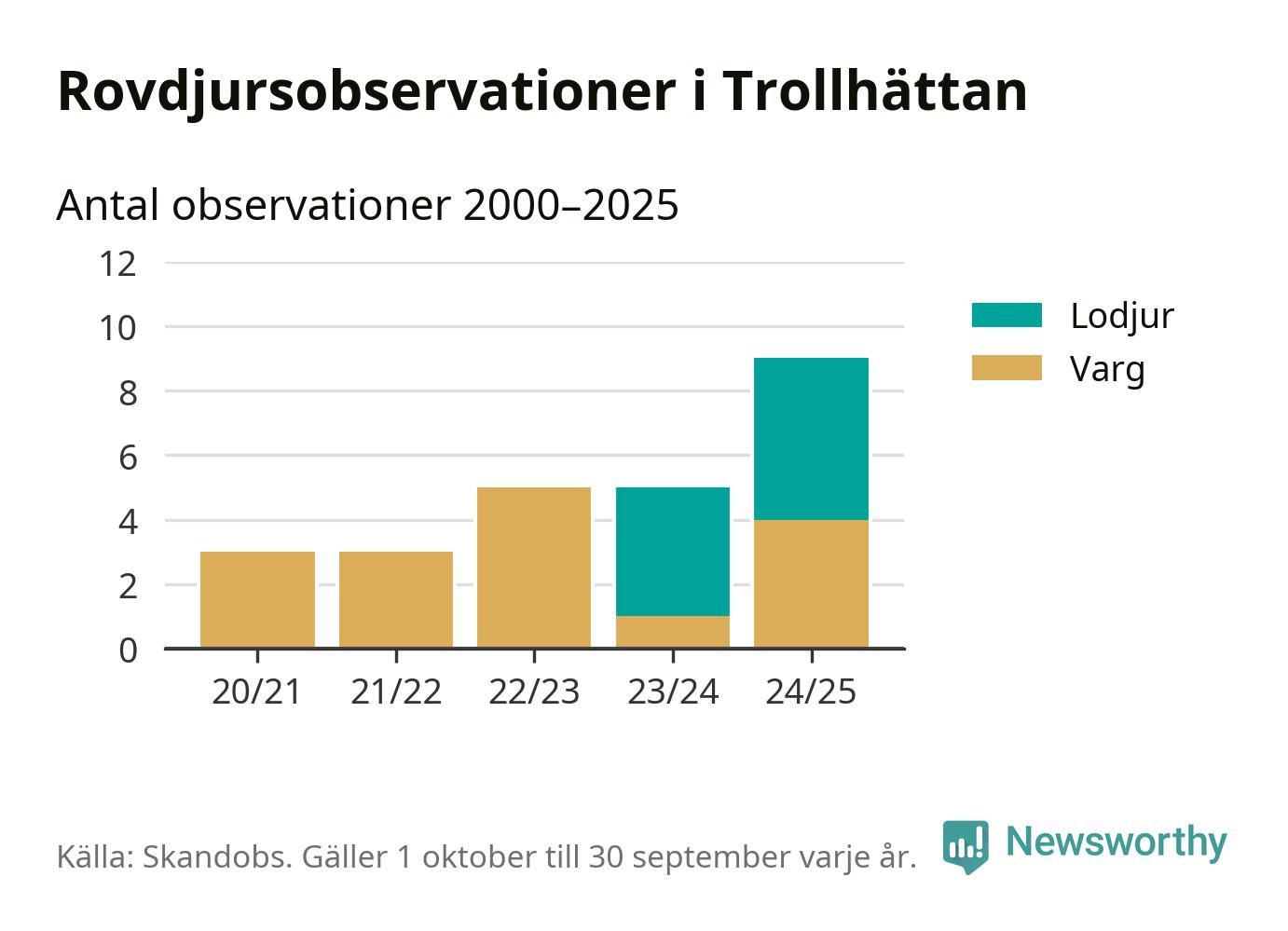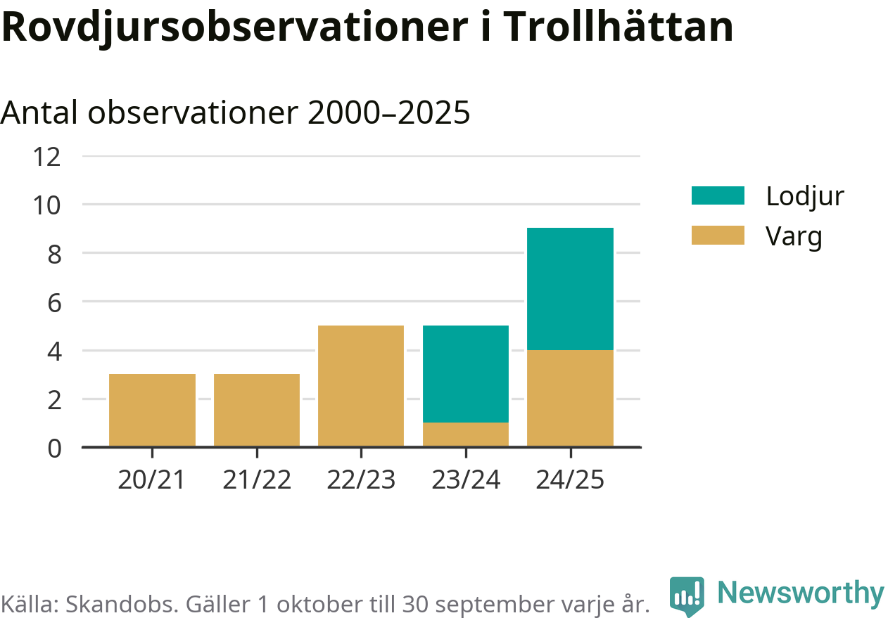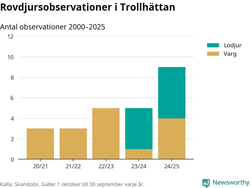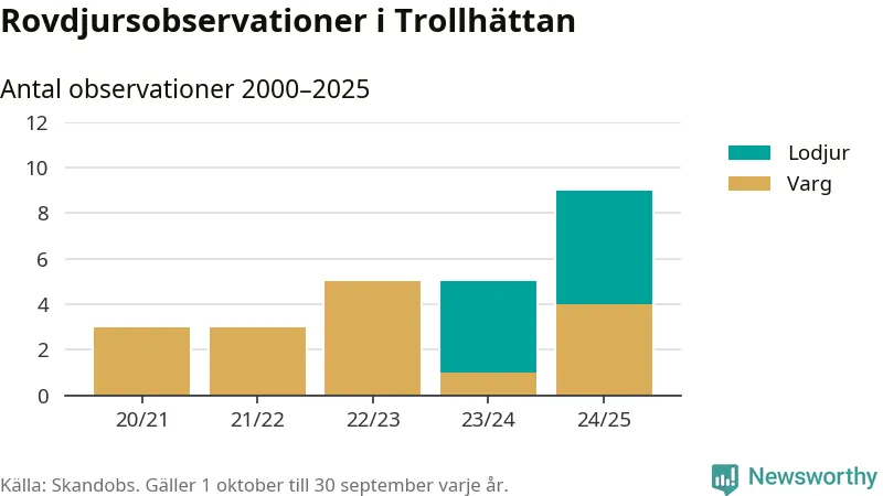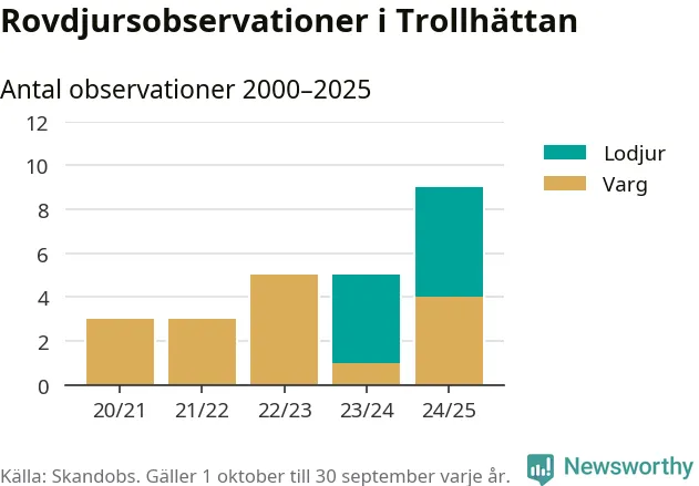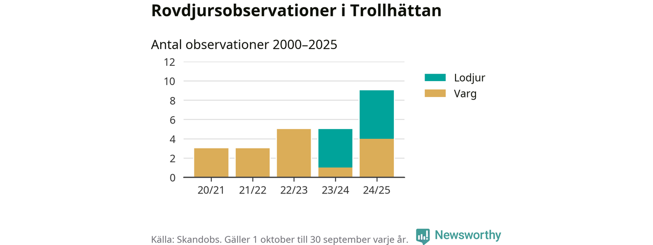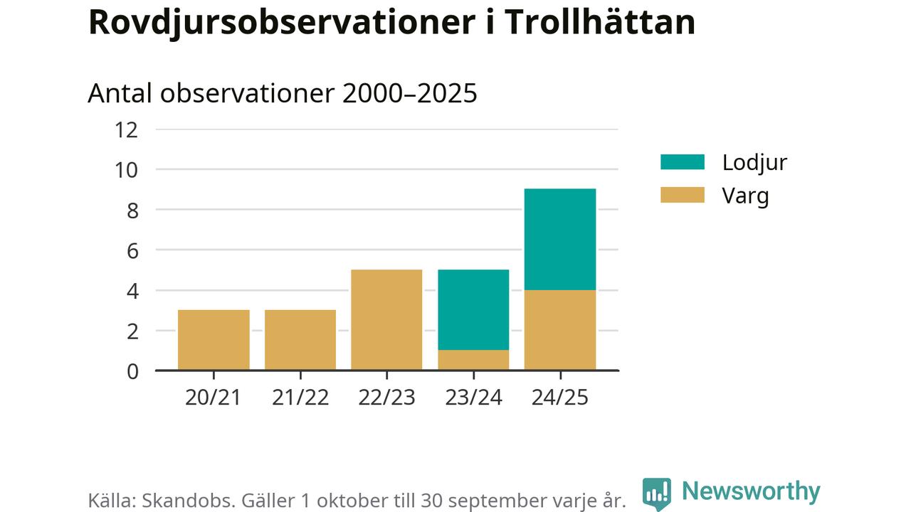 Där kan vem som helst rapportera sina observationer av de stora rovdjuren björn, varg, lodjur och järv. Mellan 1 oktober 2024 och 30 september i år har knappt 10 000 observationer registrerats i landet. Det kan vara synobservationer, foton, spår, spillning, döda bytesdjur eller andra tecken på rovdjursförekomst. I Trollhättan handlar det om totalt nio observationer av lodjur eller varg.