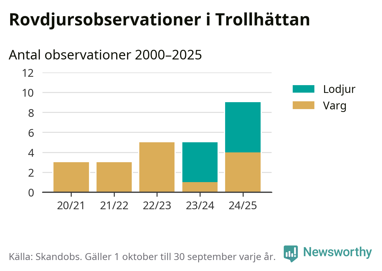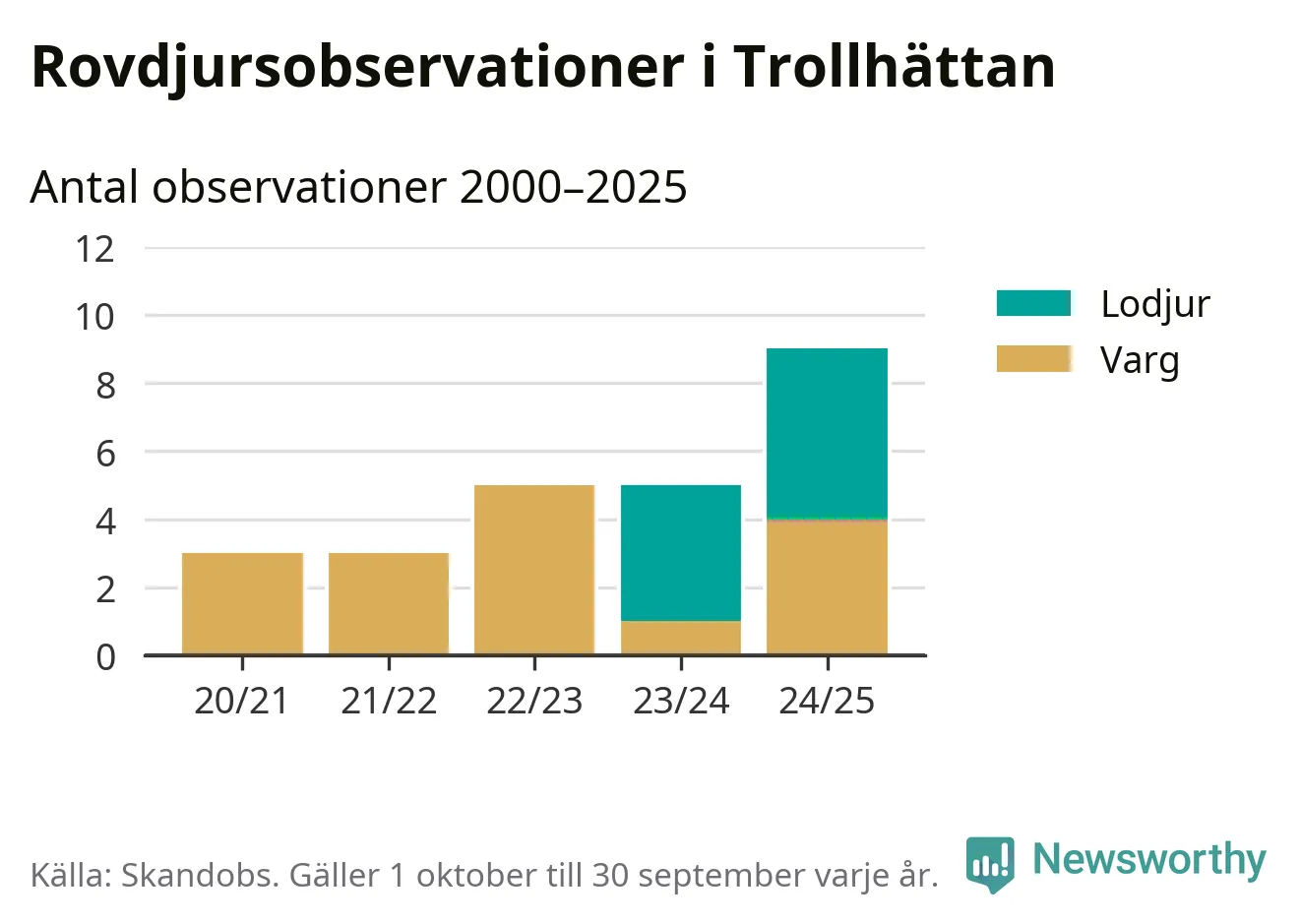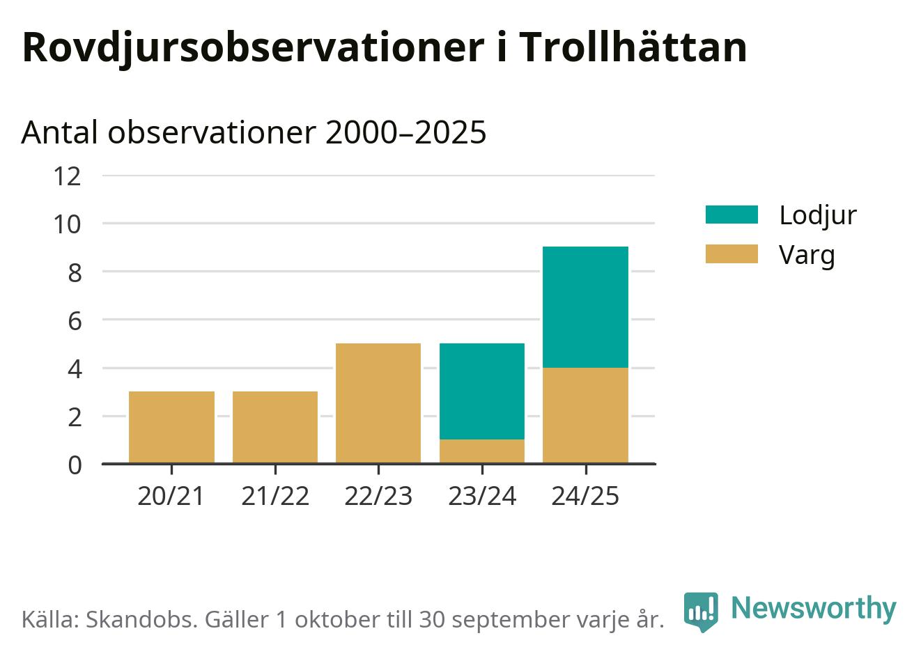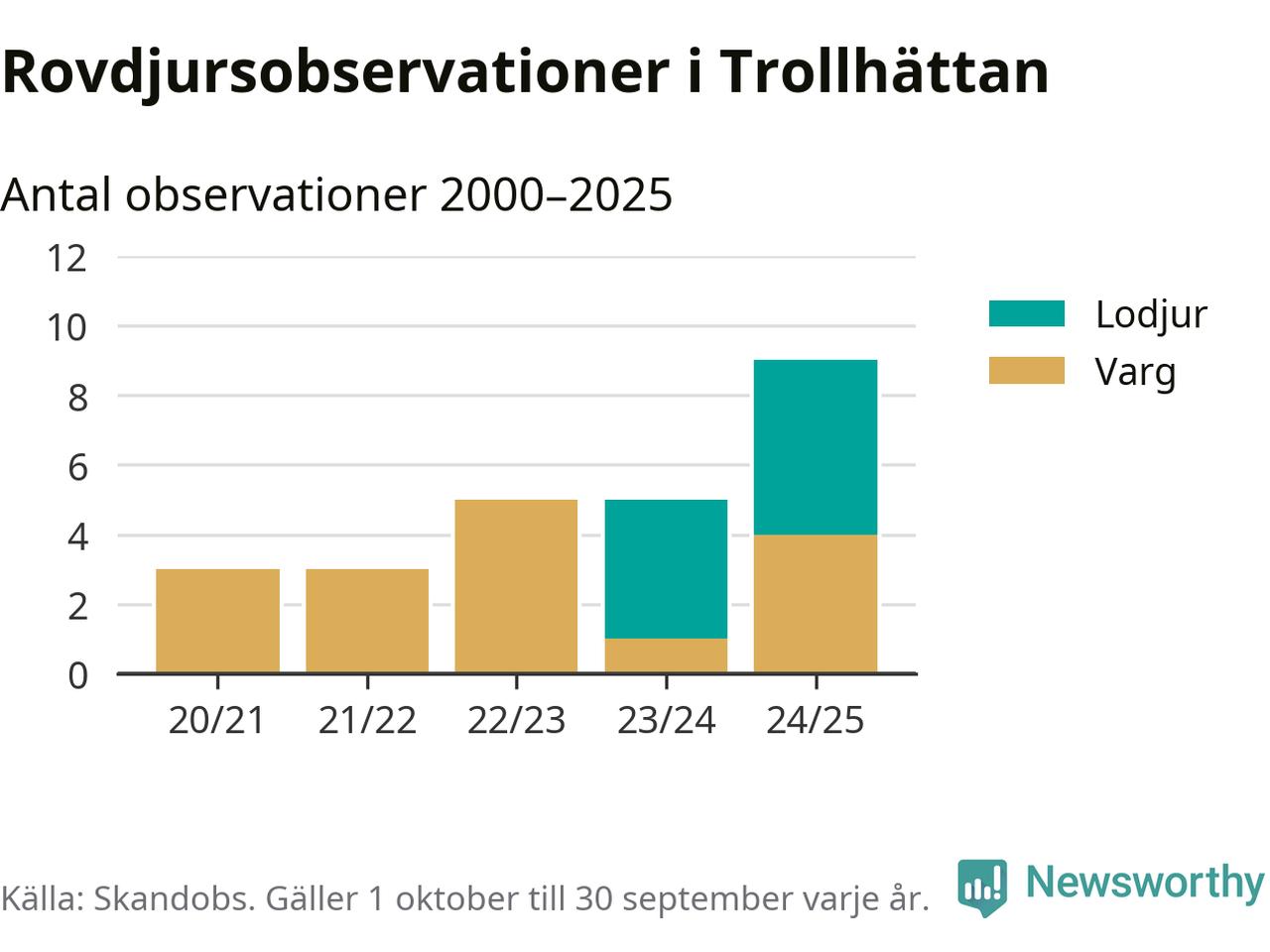 Där kan vem som helst rapportera sina observationer av de stora rovdjuren björn, varg, lodjur och järv. Mellan 1 oktober 2024 och 30 september i år har knappt 10 000 observationer registrerats i landet. Det kan vara synobservationer, foton, spår, spillning, döda bytesdjur eller andra tecken på rovdjursförekomst. I Trollhättan handlar det om totalt nio observationer av lodjur eller varg.