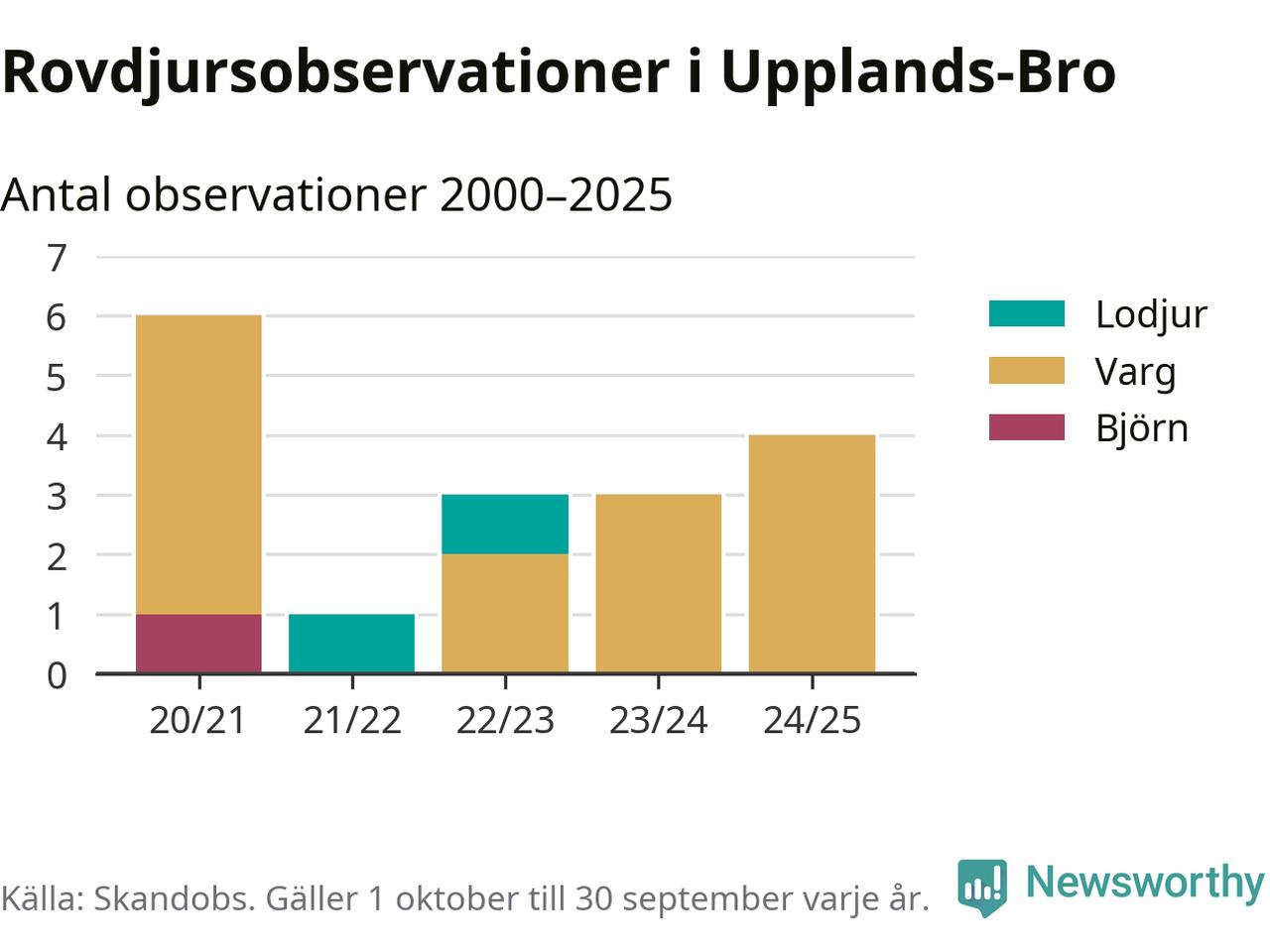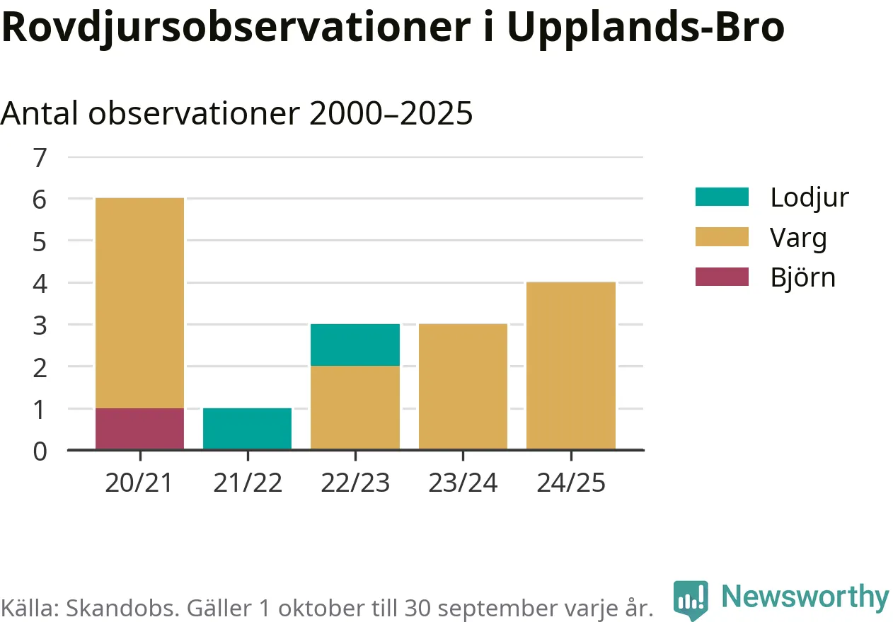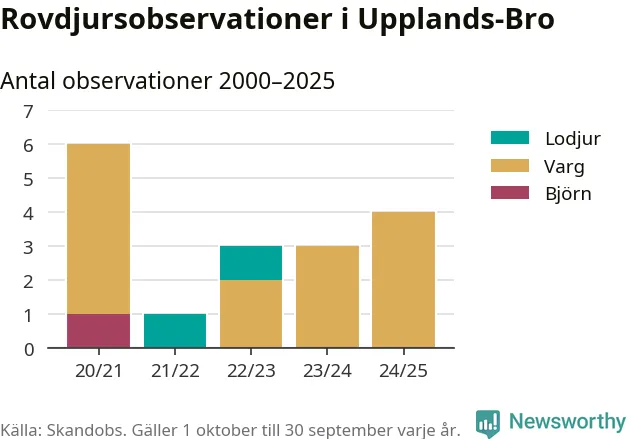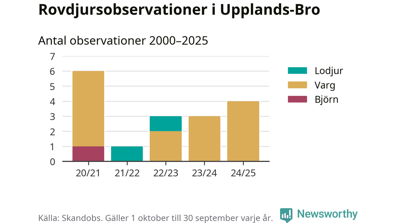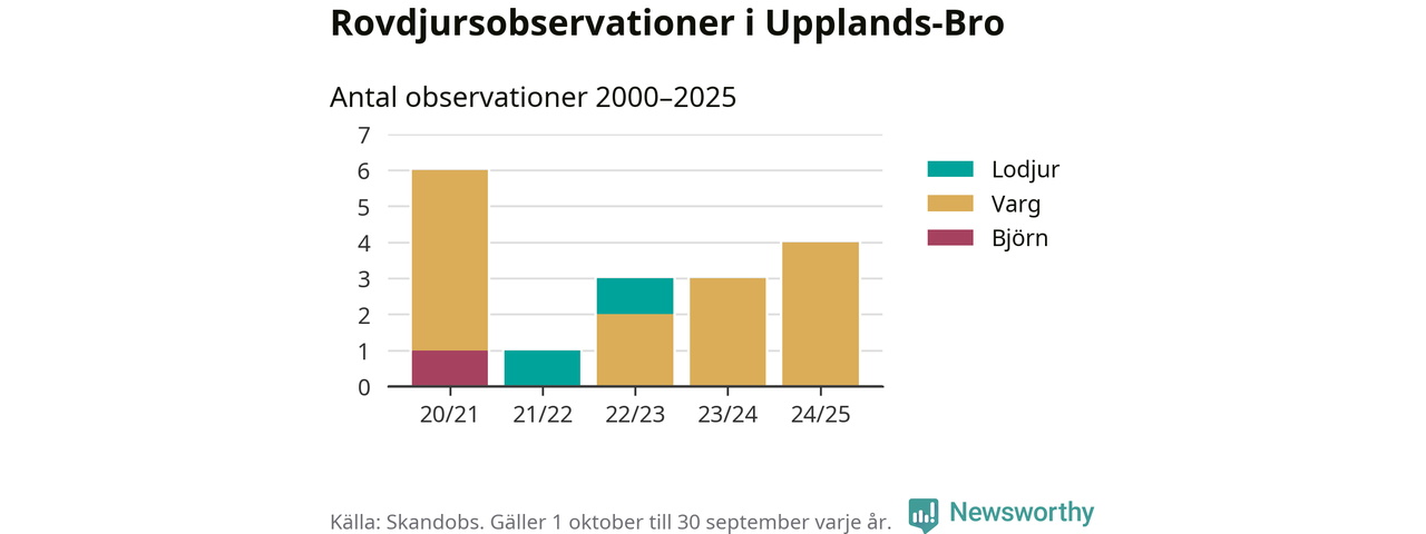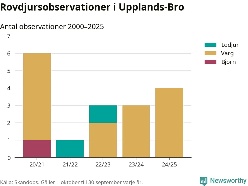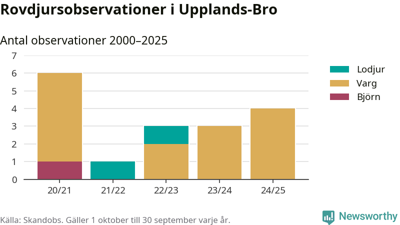 Där kan vem som helst rapportera sina observationer av de stora rovdjuren björn, varg, lodjur och järv. Mellan 1 oktober 2024 och 30 september i år har knappt 10 000 observationer registrerats i landet. Det kan vara synobservationer, foton, spår, spillning, döda bytesdjur eller andra tecken på rovdjursförekomst. I Upplands-Bro handlar det om totalt fyra observationer av varg.