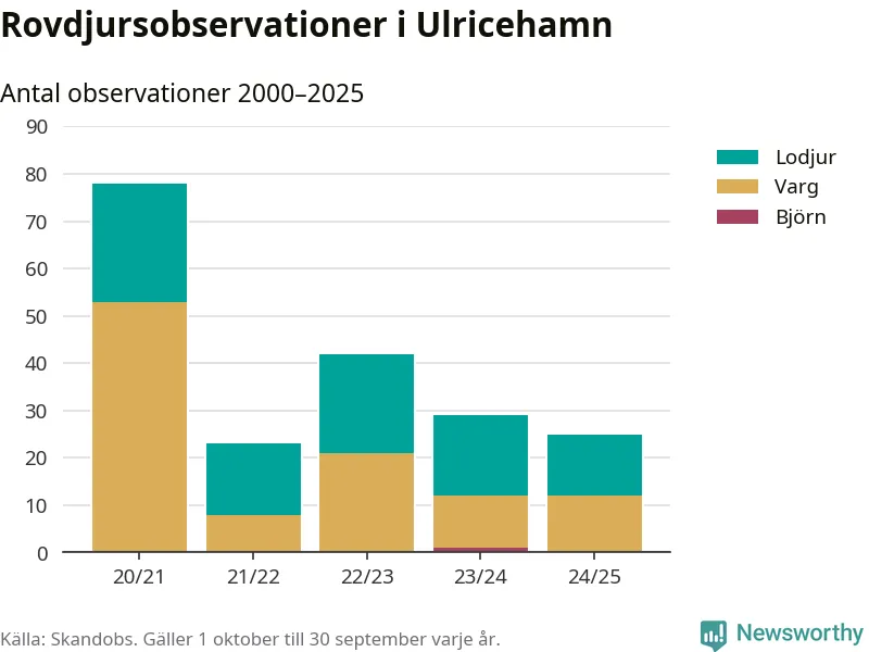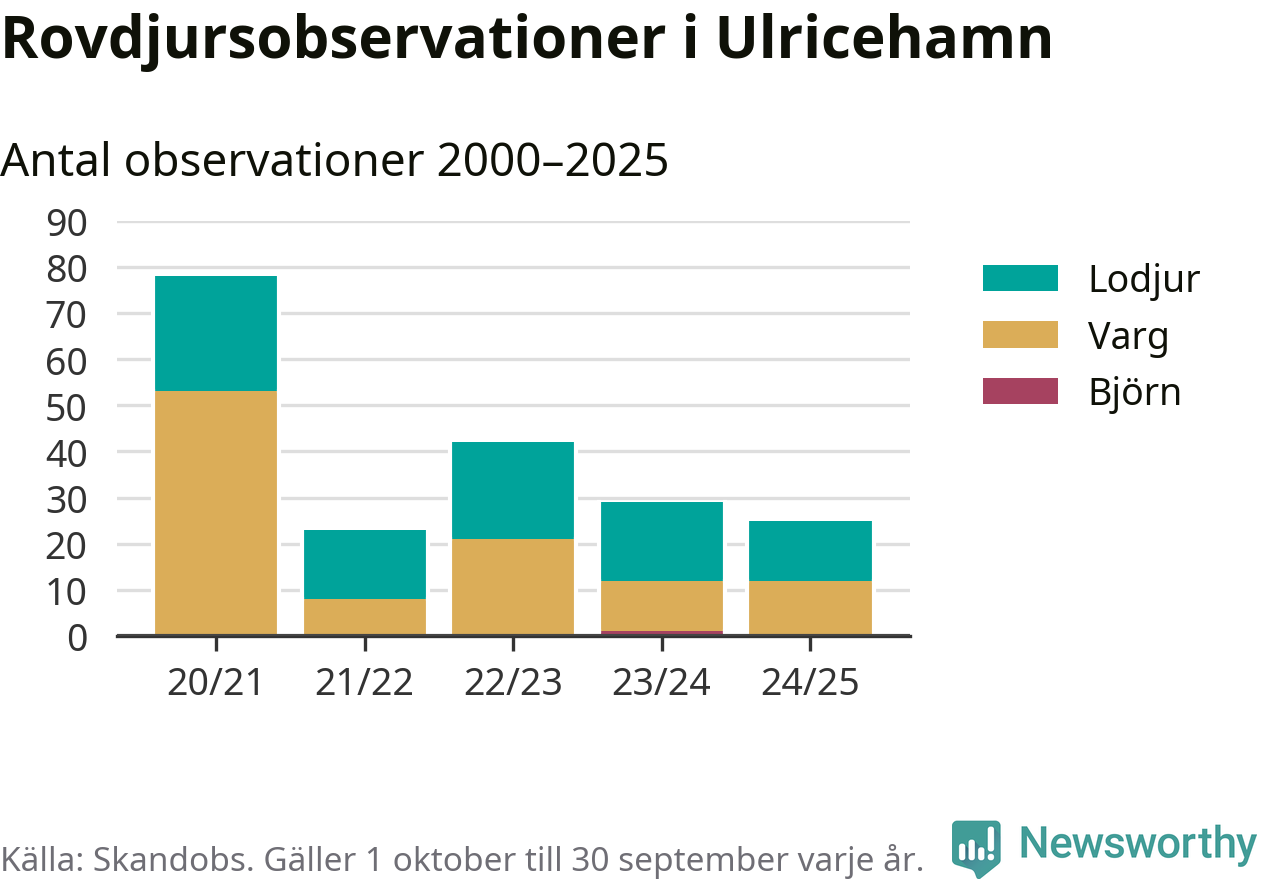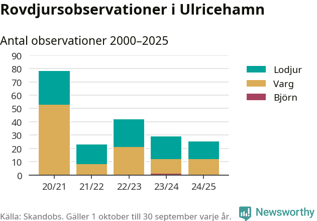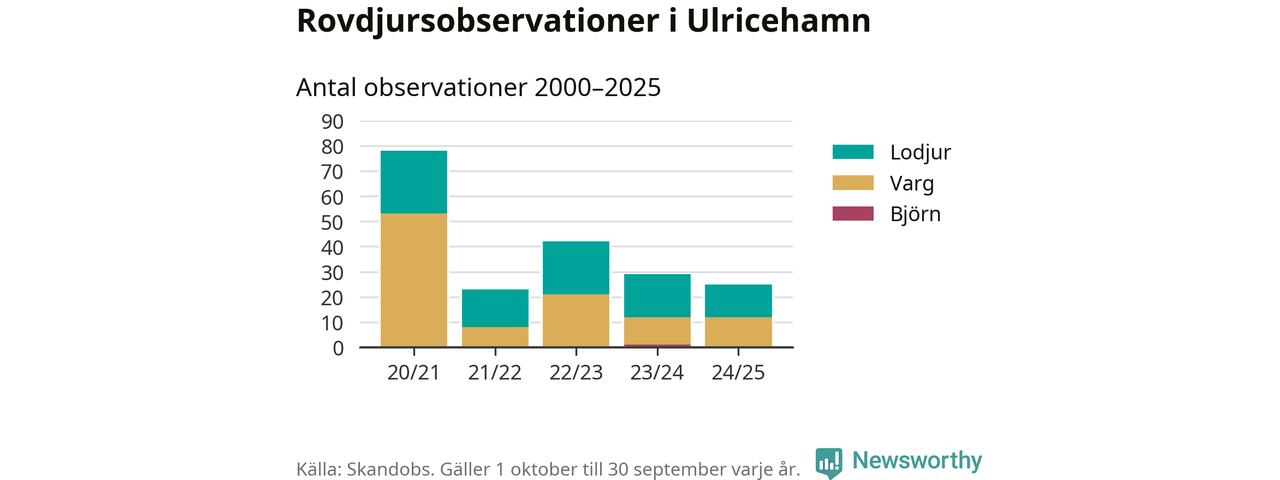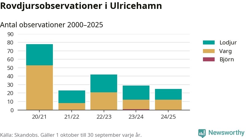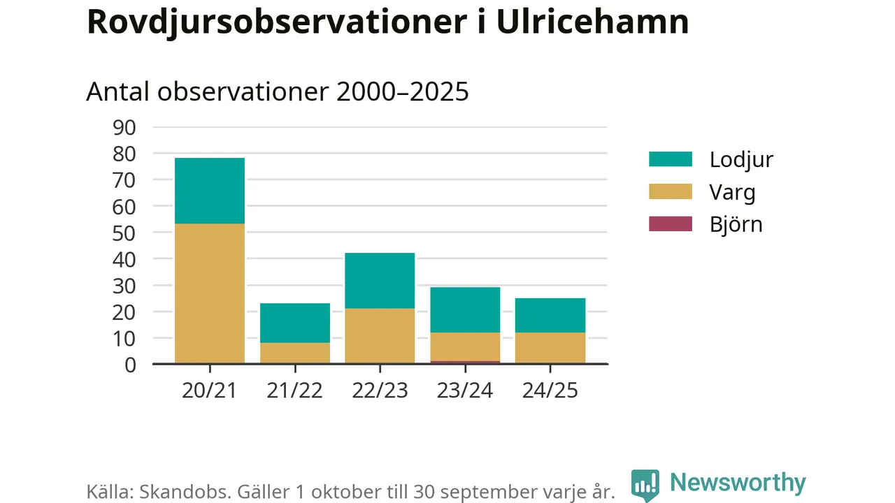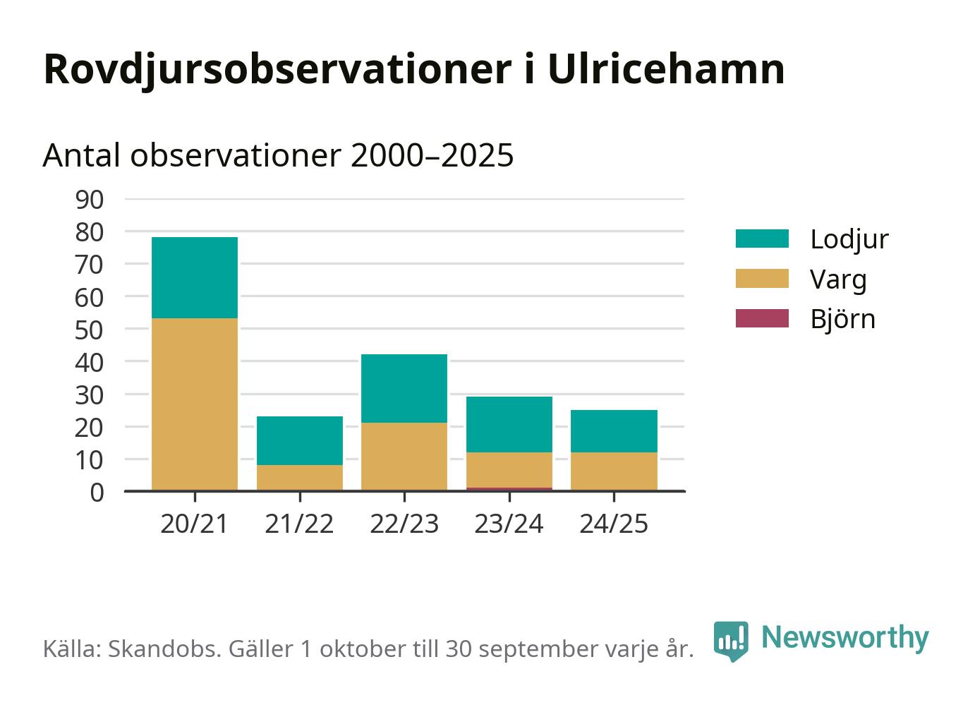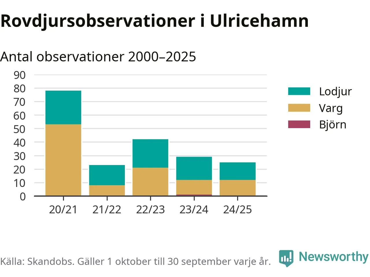 Där kan vem som helst rapportera sina observationer av de stora rovdjuren björn, varg, lodjur och järv. Mellan 1 oktober 2024 och 30 september i år har knappt 10 000 observationer registrerats i landet. Det kan vara synobservationer, foton, spår, spillning, döda bytesdjur eller andra tecken på rovdjursförekomst. I Ulricehamn handlar det om totalt 25 observationer av lodjur eller varg.