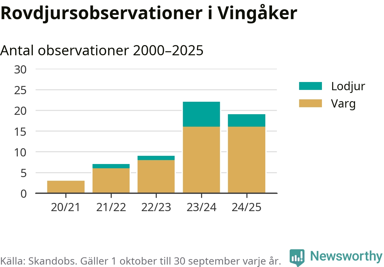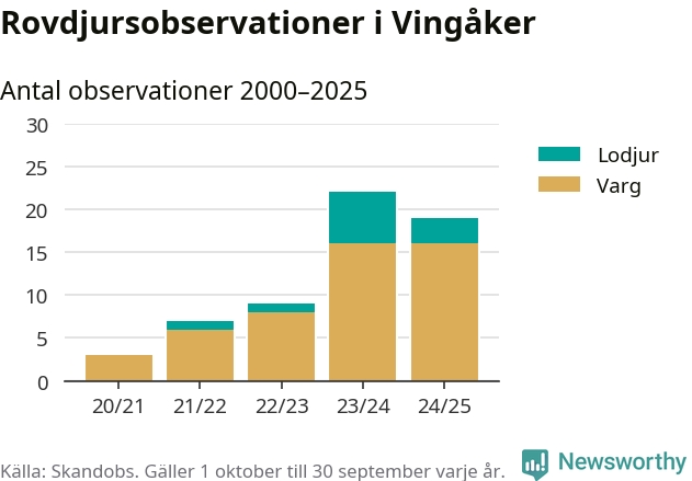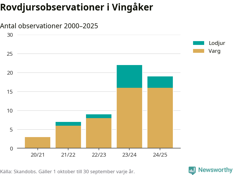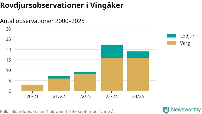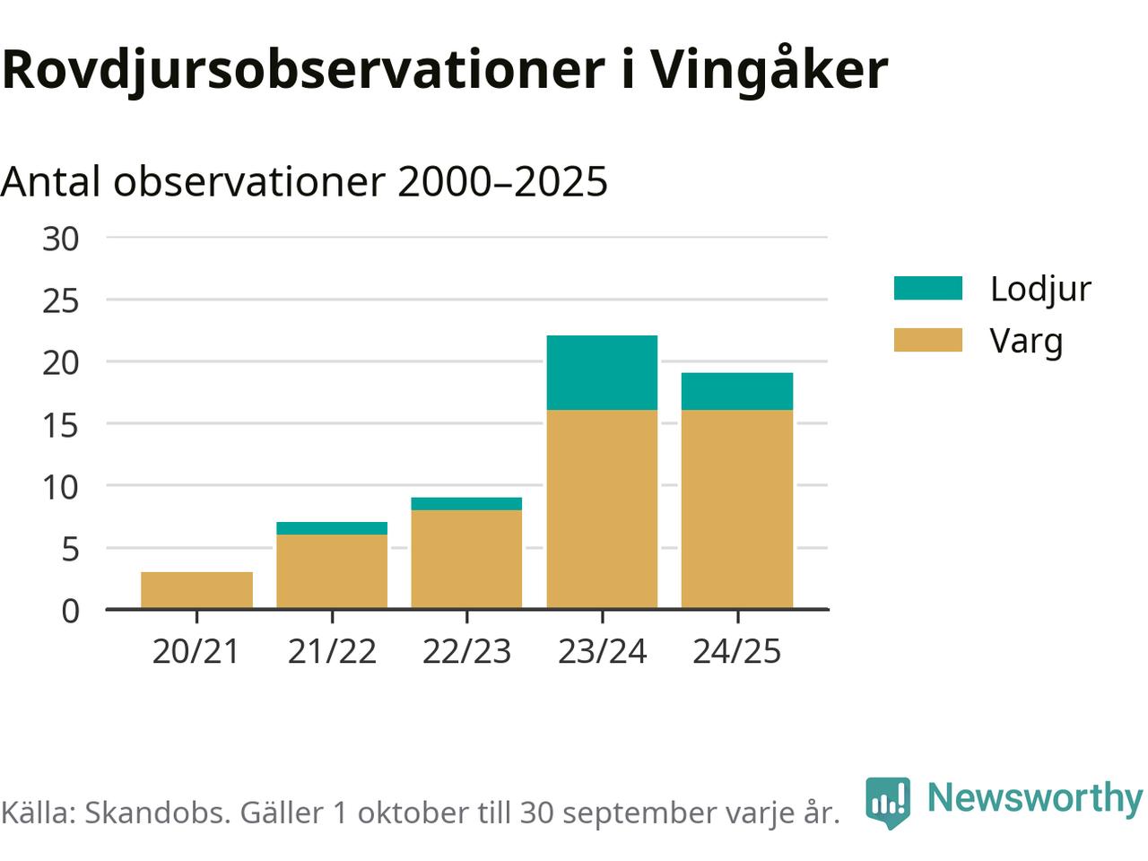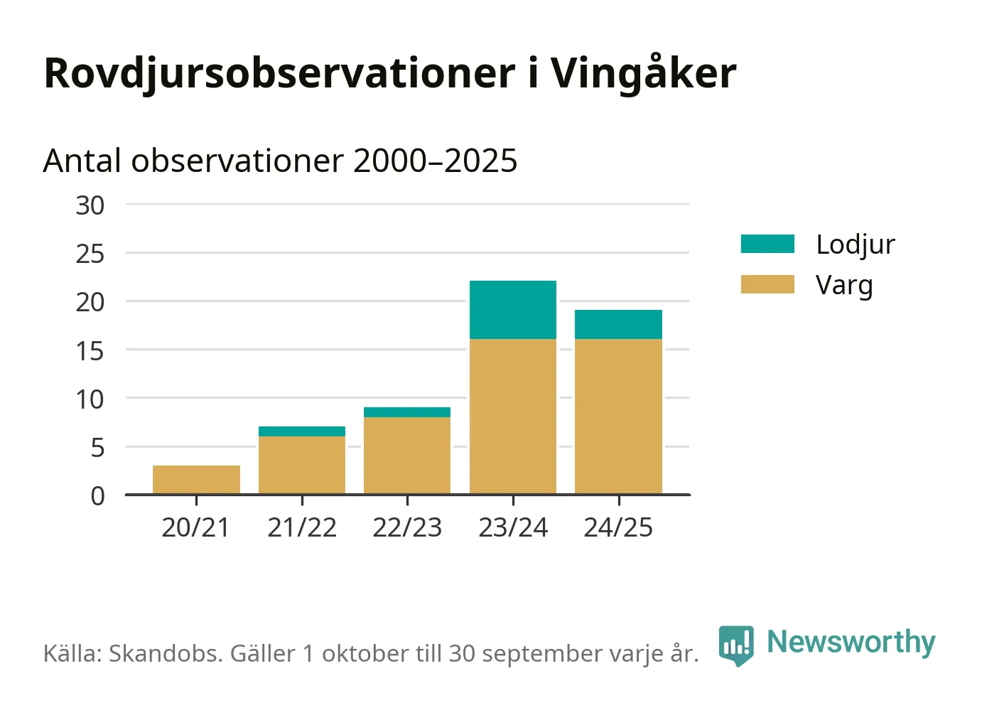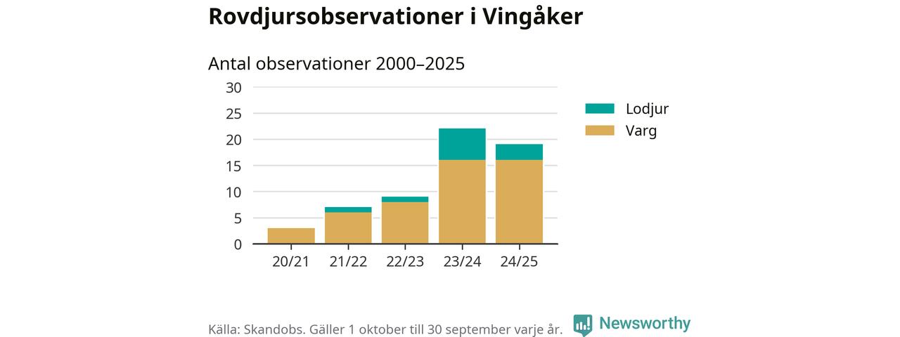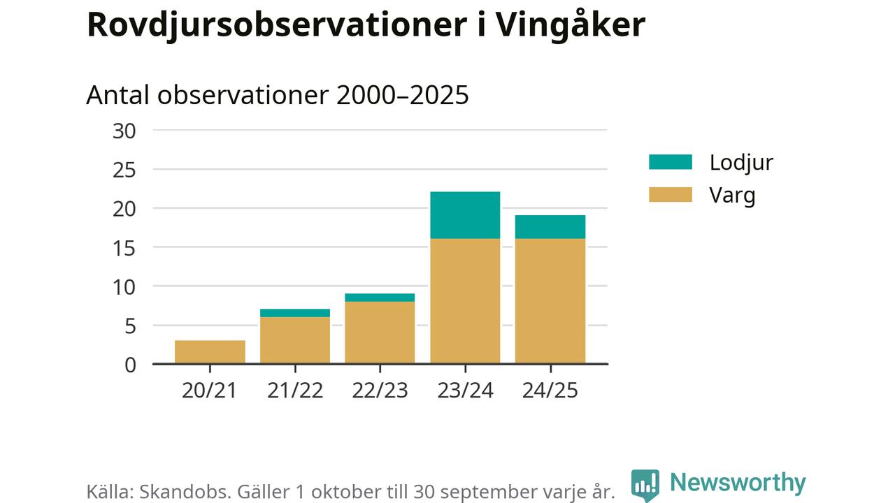 Där kan vem som helst rapportera sina observationer av de stora rovdjuren björn, varg, lodjur och järv. Mellan 1 oktober 2024 och 30 september i år har knappt 10 000 observationer registrerats i landet. Det kan vara synobservationer, foton, spår, spillning, döda bytesdjur eller andra tecken på rovdjursförekomst. I Vingåker handlar det om totalt 19 observationer av varg eller lodjur.