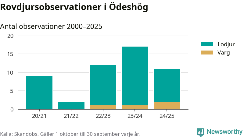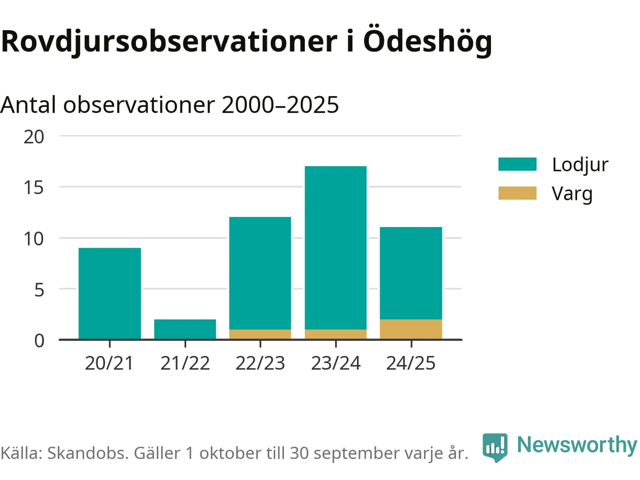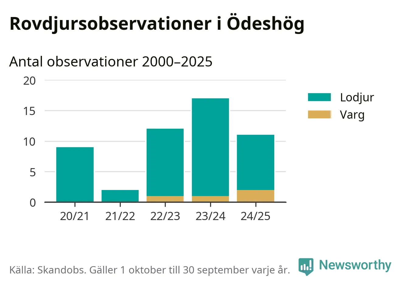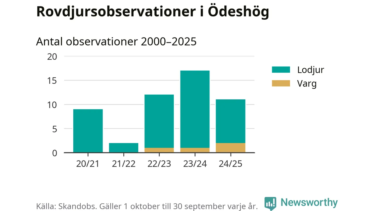Till Skandobs kan vem som helst rapportera sina observationer av de stora rovdjuren björn, varg, lodjur och järv. Mellan 1 oktober 2024 och 30 september i år har knappt 10 000 observationer registrerats i landet. Det kan vara synobservationer, foton, spår, spillning, döda bytesdjur eller andra tecken på rovdjursförekomst. I Ödeshög handlar det om totalt elva observationer av lodjur eller varg.