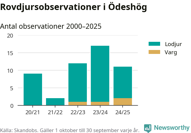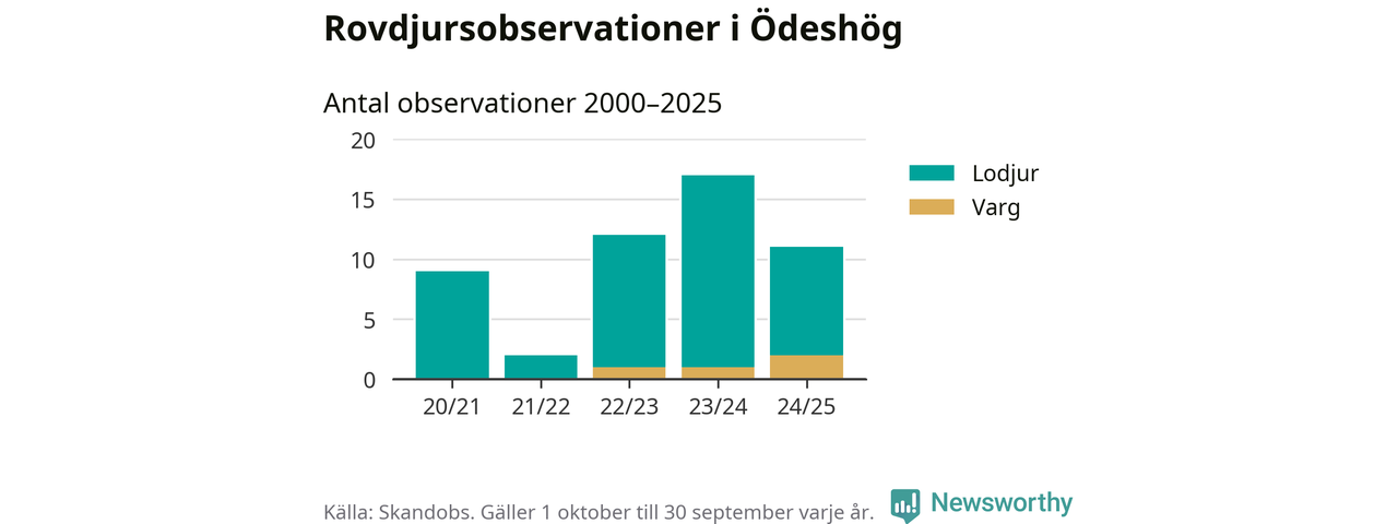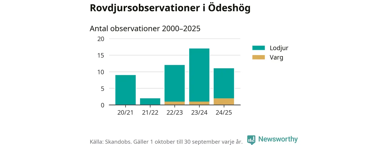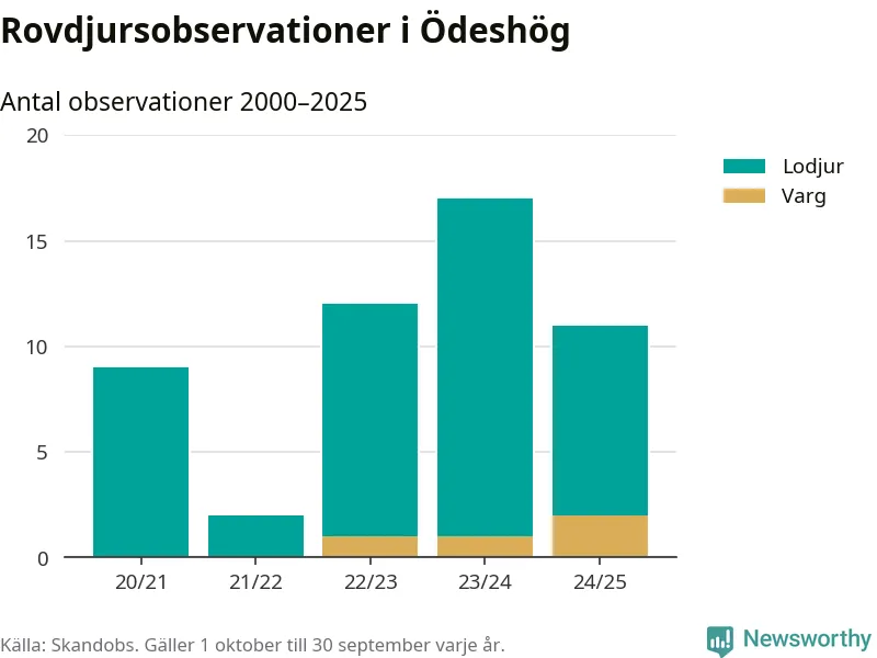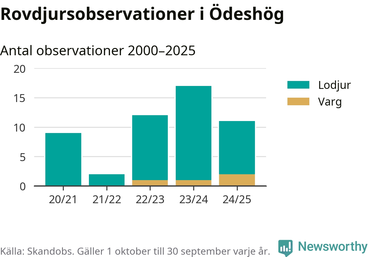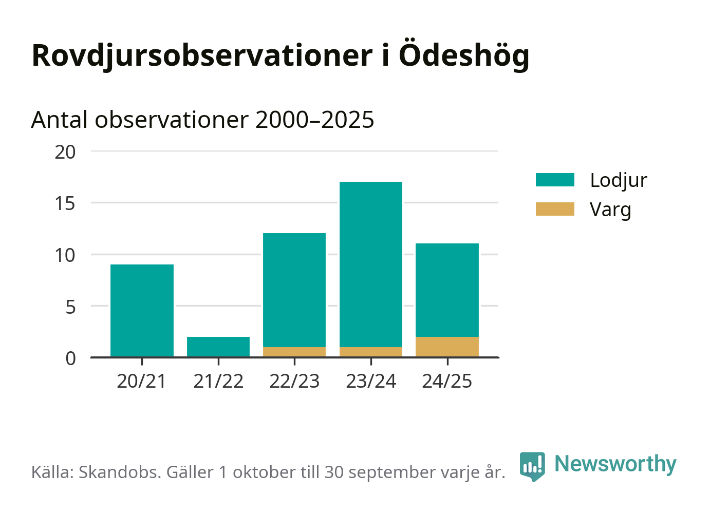Till Skandobs kan vem som helst rapportera sina observationer av de stora rovdjuren björn, varg, lodjur och järv. Mellan 1 oktober 2024 och 30 september i år har knappt 10 000 observationer registrerats i landet. Det kan vara synobservationer, foton, spår, spillning, döda bytesdjur eller andra tecken på rovdjursförekomst. I Ödeshög handlar det om totalt elva observationer av lodjur eller varg.
