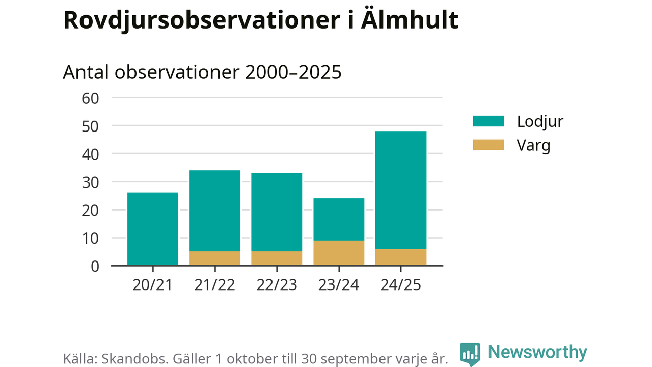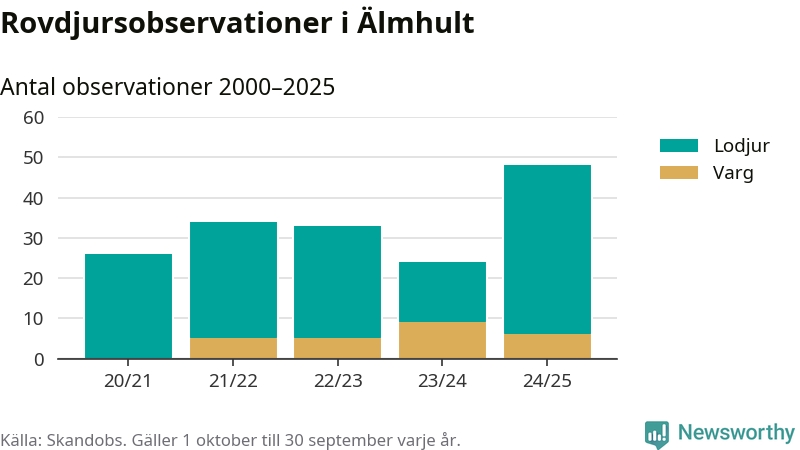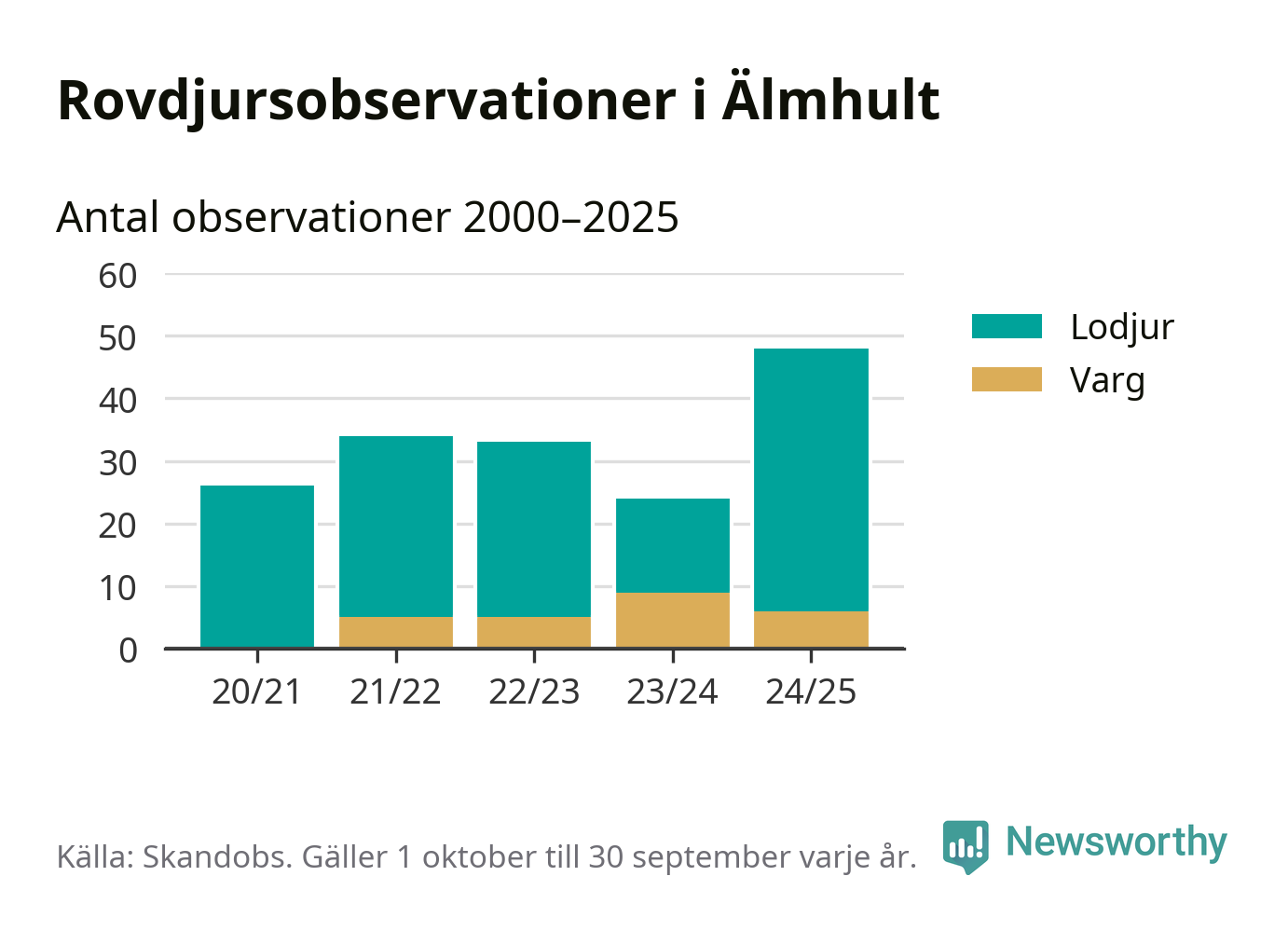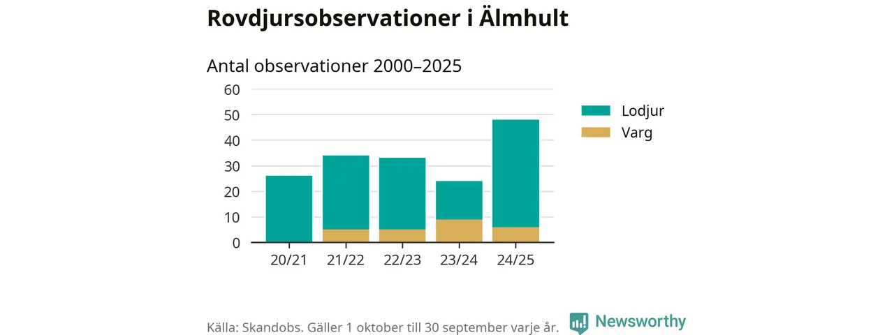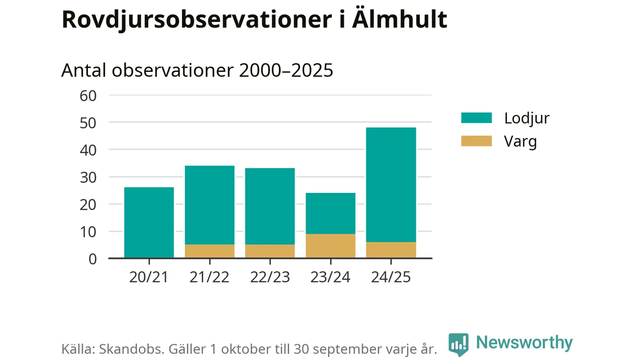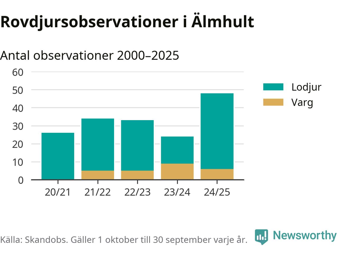 Till Skandobs kan vem som helst rapportera sina observationer av de stora rovdjuren björn, varg, lodjur och järv. Mellan 1 oktober 2024 och 30 september i år har knappt 10 000 observationer registrerats i landet. Det kan vara synobservationer, foton, spår, spillning, döda bytesdjur eller andra tecken på rovdjursförekomst. I Älmhult handlar det om totalt 48 observationer av lodjur eller varg.
