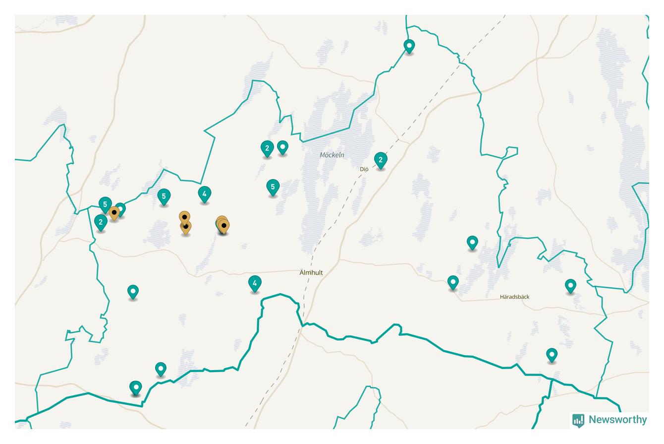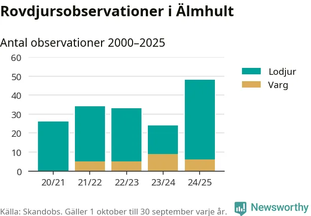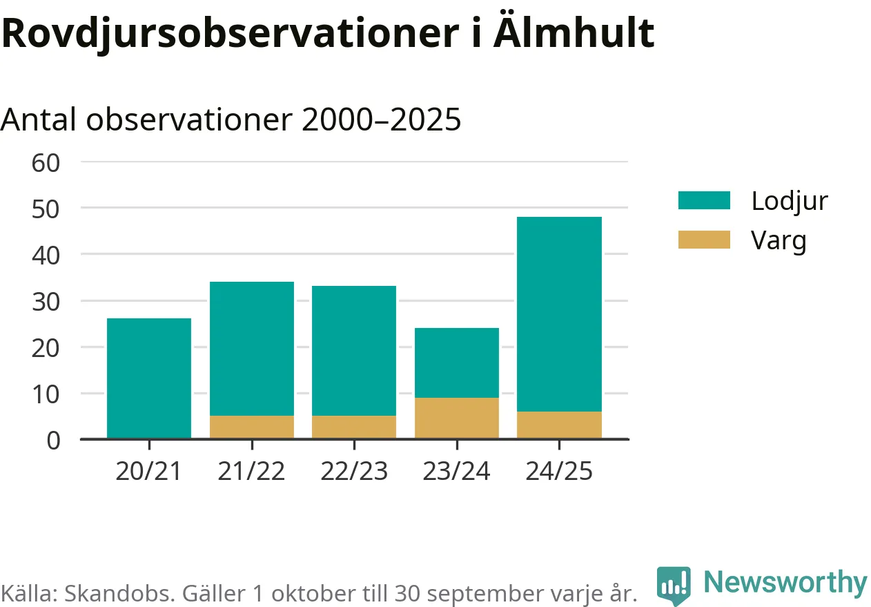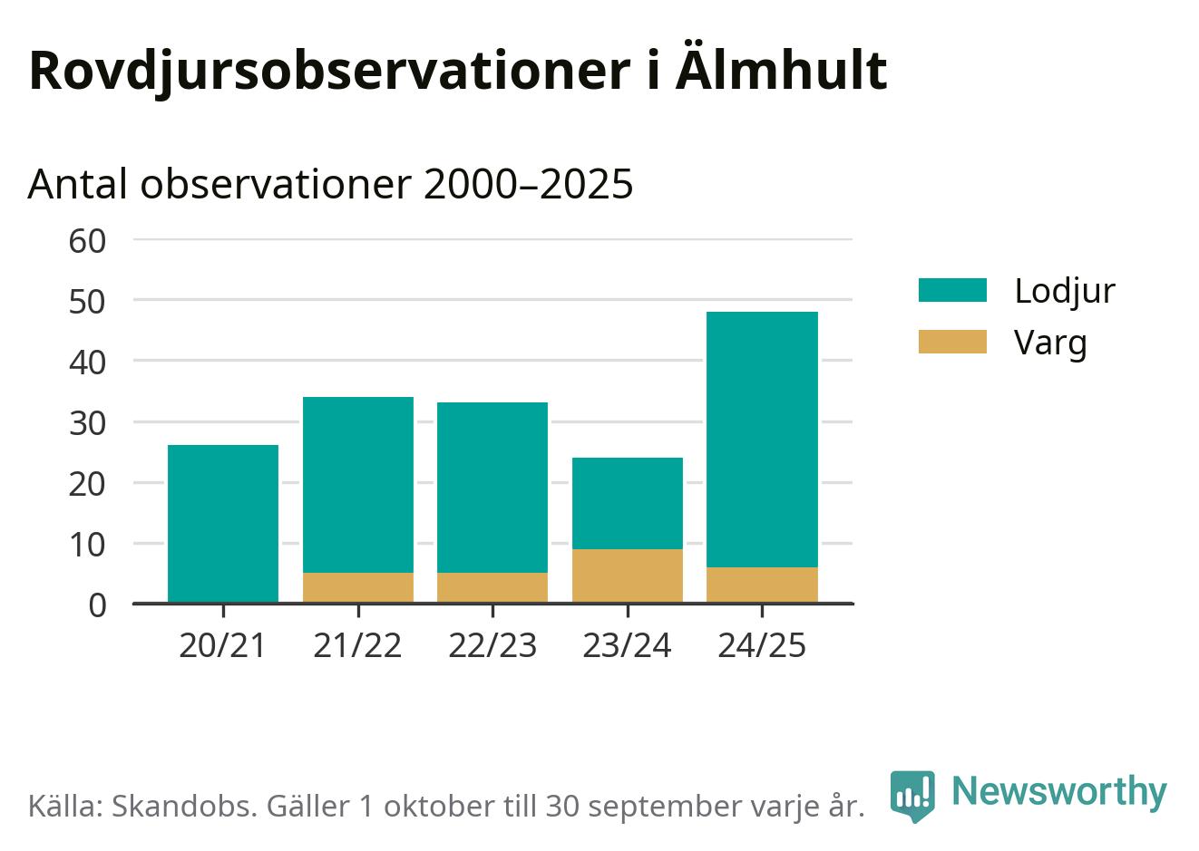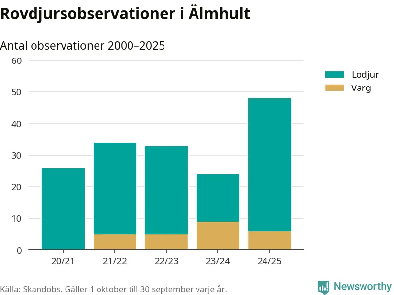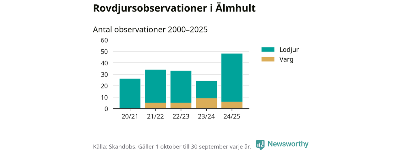 Till Skandobs kan vem som helst rapportera sina observationer av de stora rovdjuren björn, varg, lodjur och järv. Mellan 1 oktober 2024 och 30 september i år har knappt 10 000 observationer registrerats i landet. Det kan vara synobservationer, foton, spår, spillning, döda bytesdjur eller andra tecken på rovdjursförekomst. I Älmhult handlar det om totalt 48 observationer av lodjur eller varg.