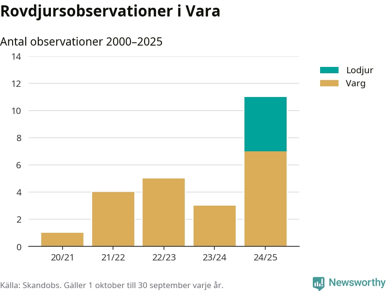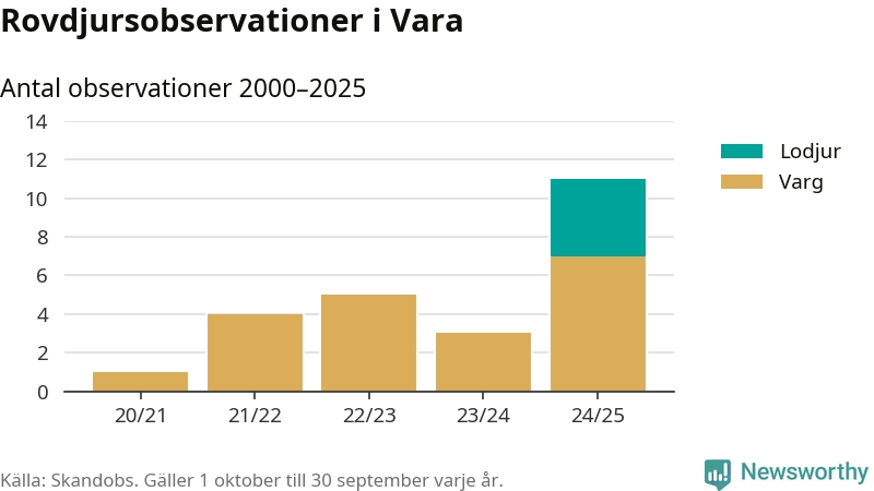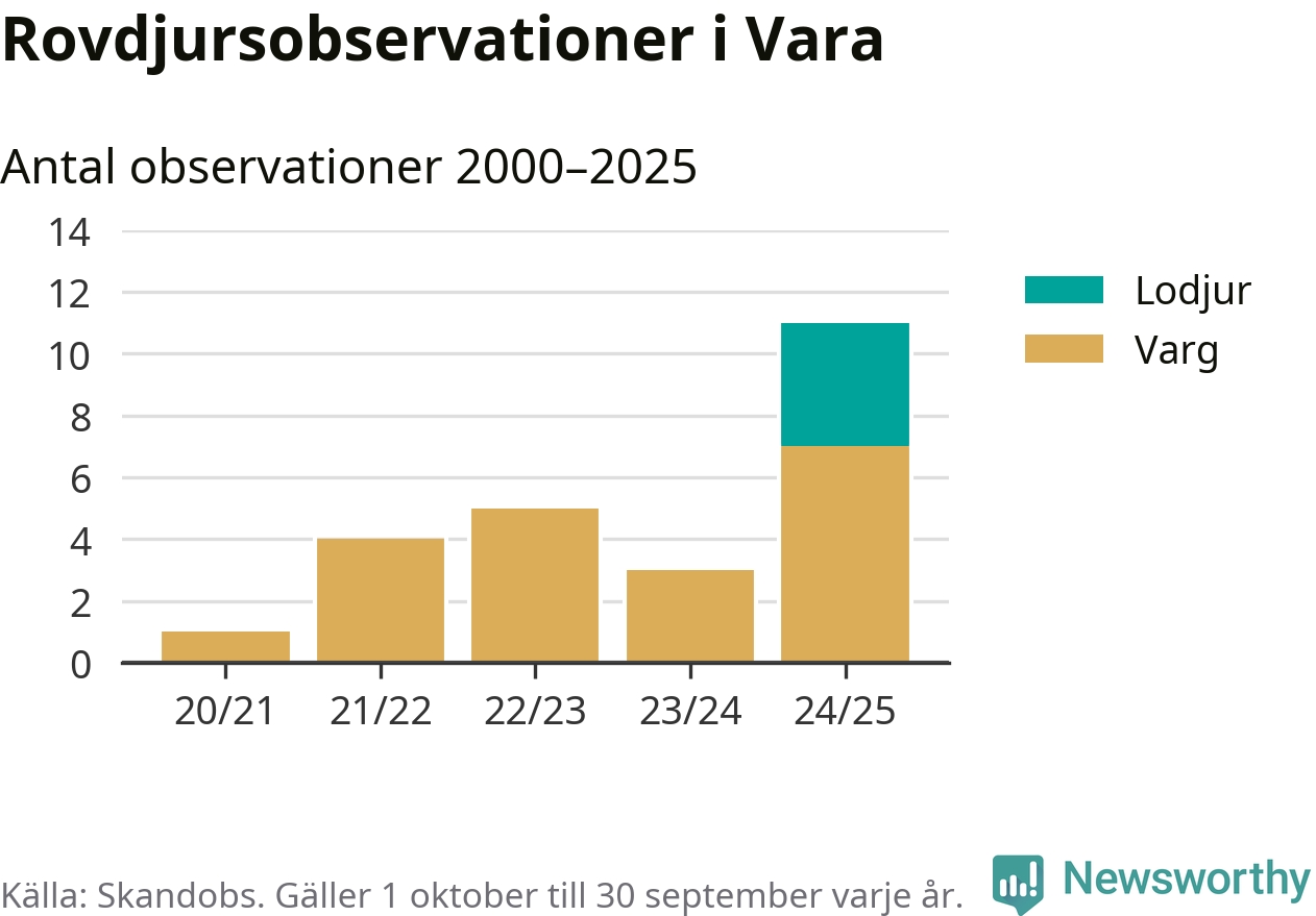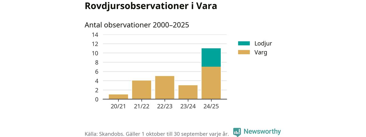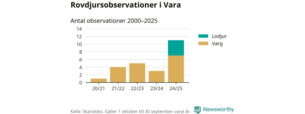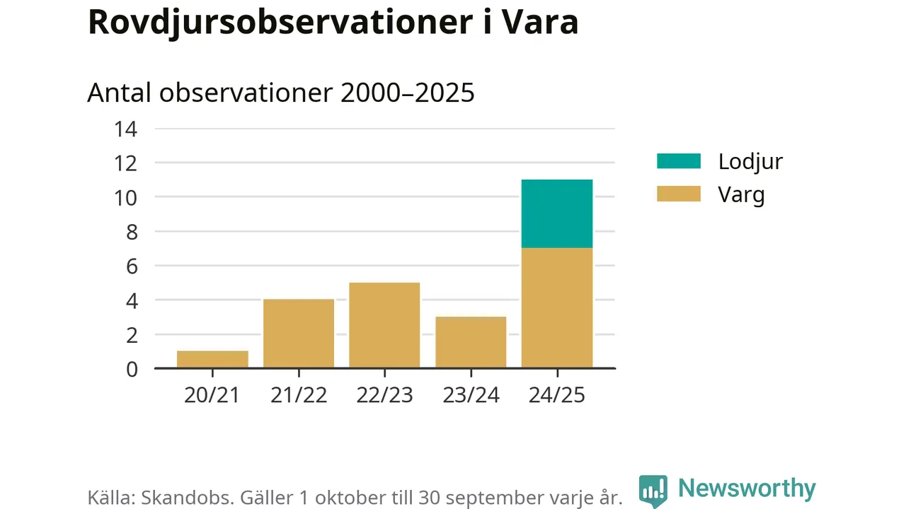 Där kan vem som helst rapportera sina observationer av de stora rovdjuren björn, varg, lodjur och järv. Mellan 1 oktober 2024 och 30 september i år har knappt 10 000 observationer registrerats i landet. Det kan vara synobservationer, foton, spår, spillning, döda bytesdjur eller andra tecken på rovdjursförekomst. I Vara handlar det om totalt elva observationer av varg eller lodjur.