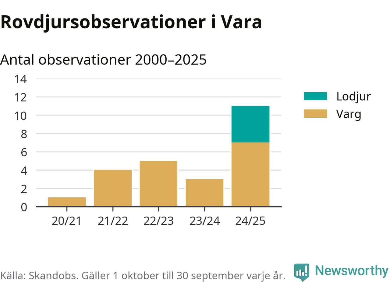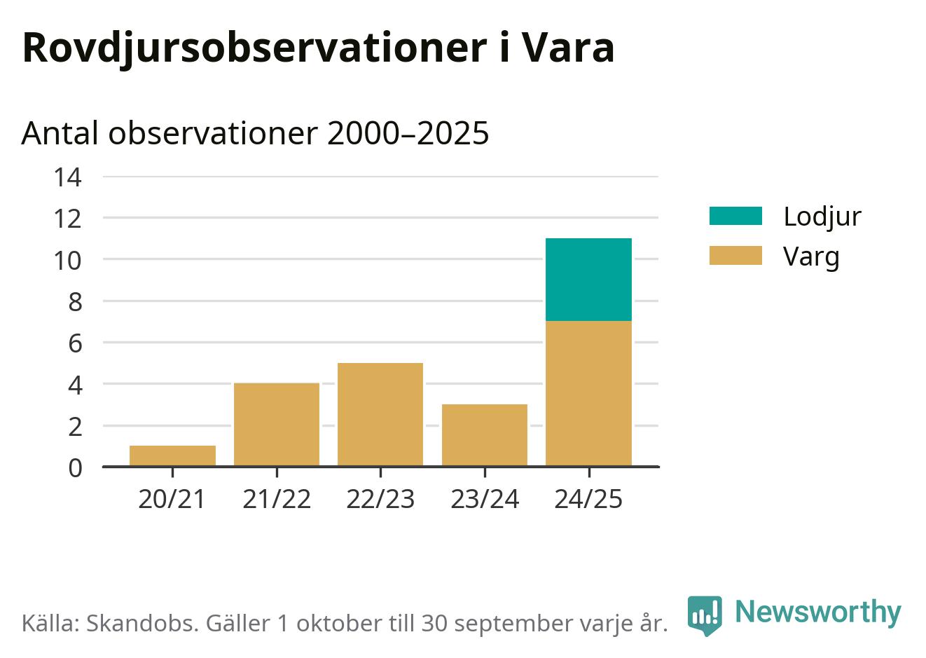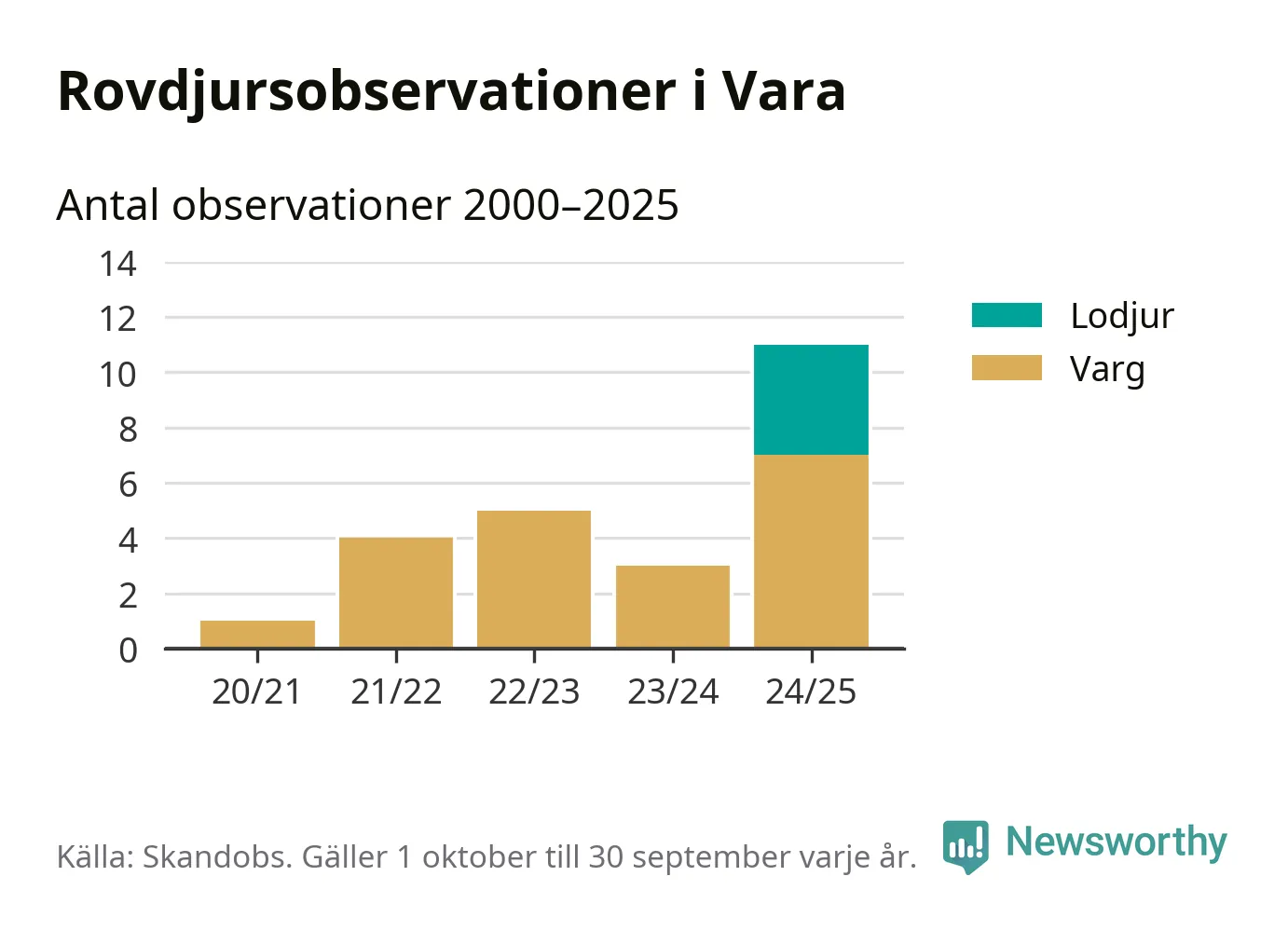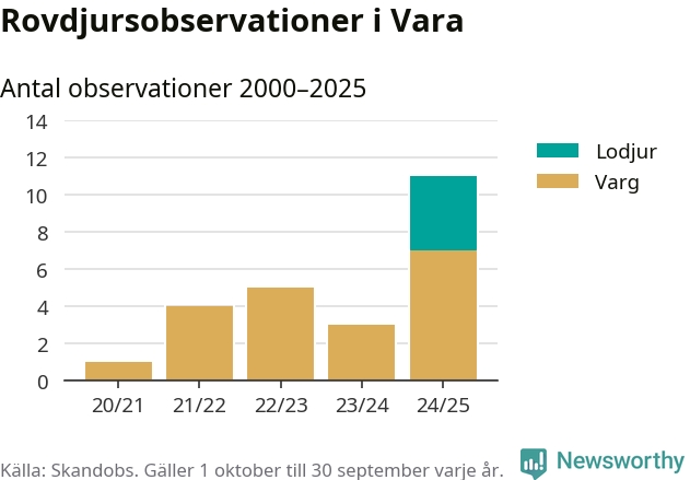 Där kan vem som helst rapportera sina observationer av de stora rovdjuren björn, varg, lodjur och järv. Mellan 1 oktober 2024 och 30 september i år har knappt 10 000 observationer registrerats i landet. Det kan vara synobservationer, foton, spår, spillning, döda bytesdjur eller andra tecken på rovdjursförekomst. I Vara handlar det om totalt elva observationer av varg eller lodjur.