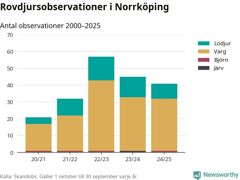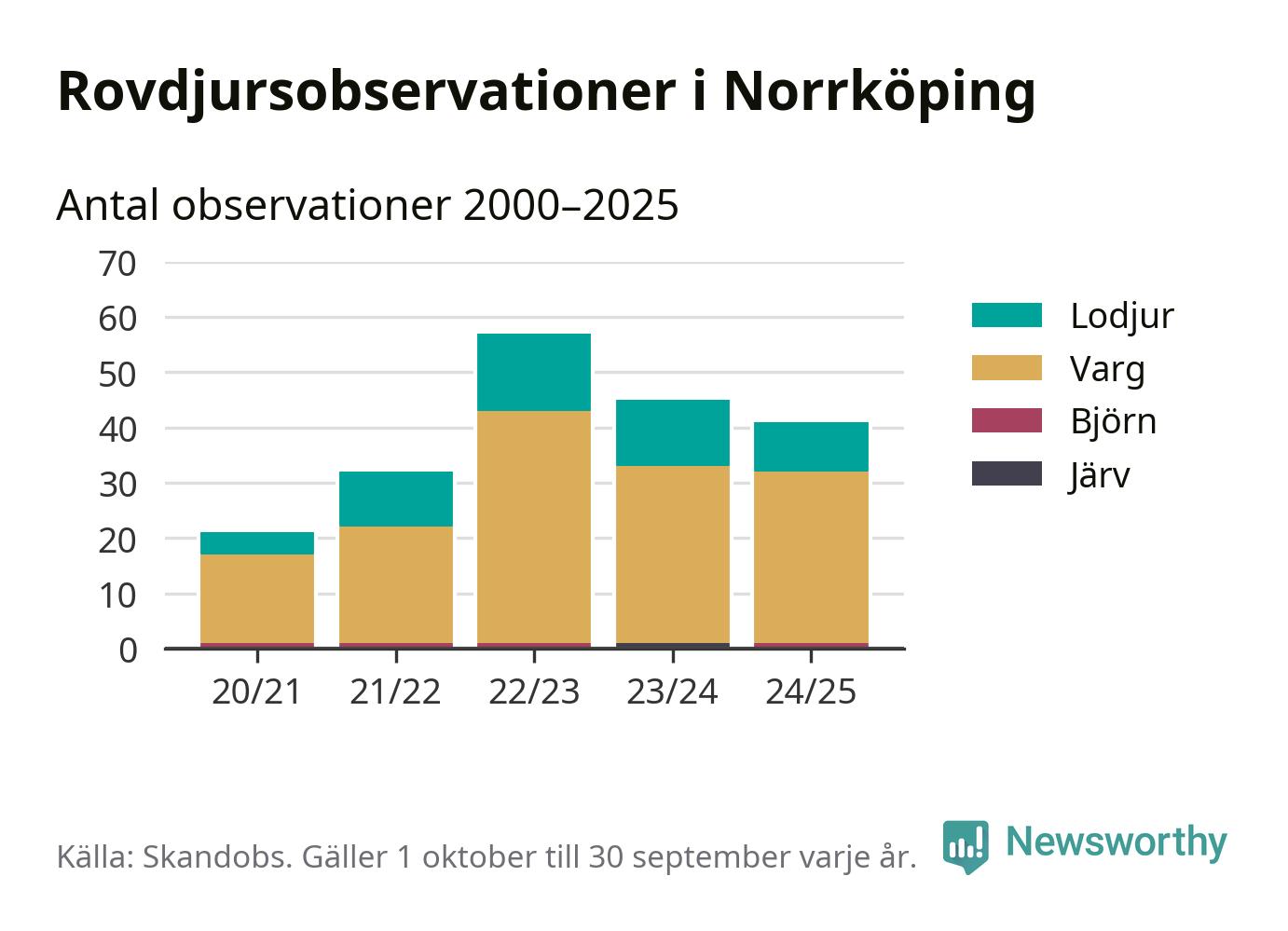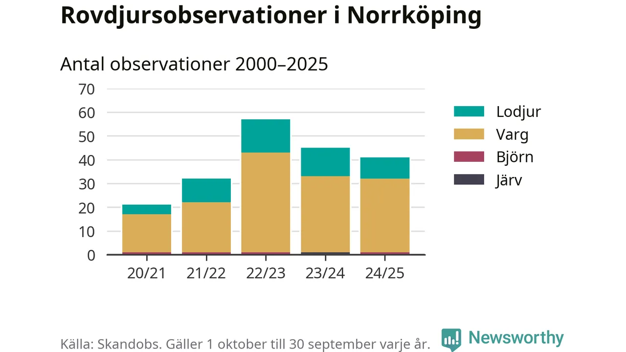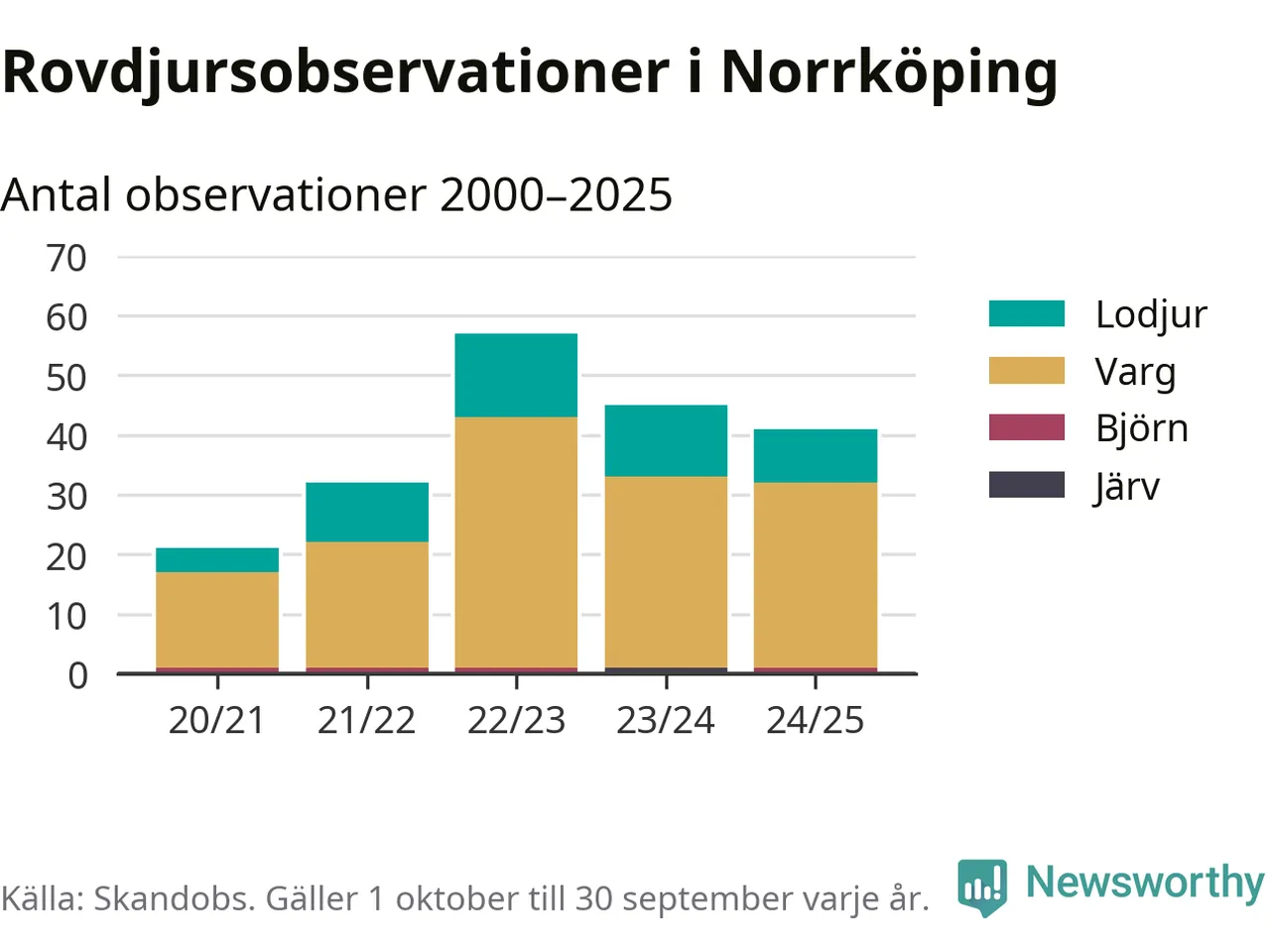 Där kan vem som helst rapportera sina observationer av de stora rovdjuren björn, varg, lodjur och järv. Mellan 1 oktober 2024 och 30 september i år har knappt 10 000 observationer registrerats i landet. Det kan vara synobservationer, foton, spår, spillning, döda bytesdjur eller andra tecken på rovdjursförekomst. I Norrköping handlar det om totalt 41 observationer av varg, lodjur eller björn.
