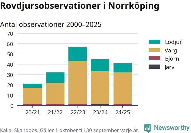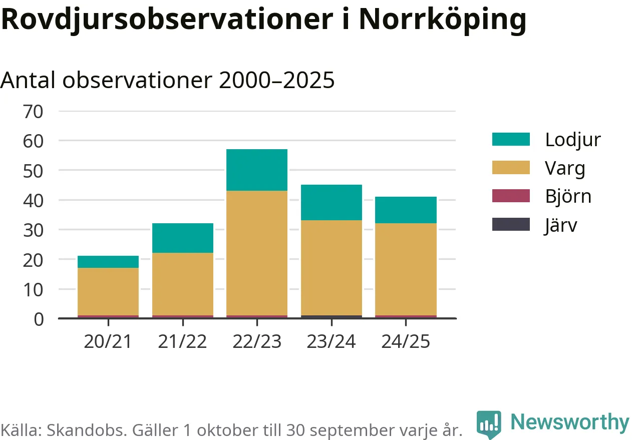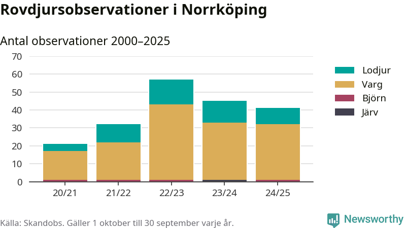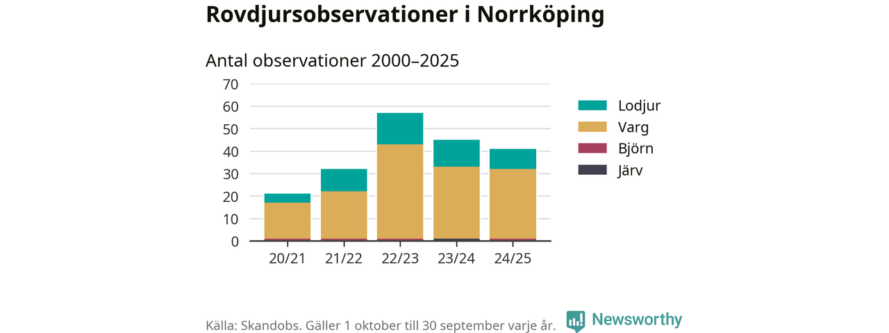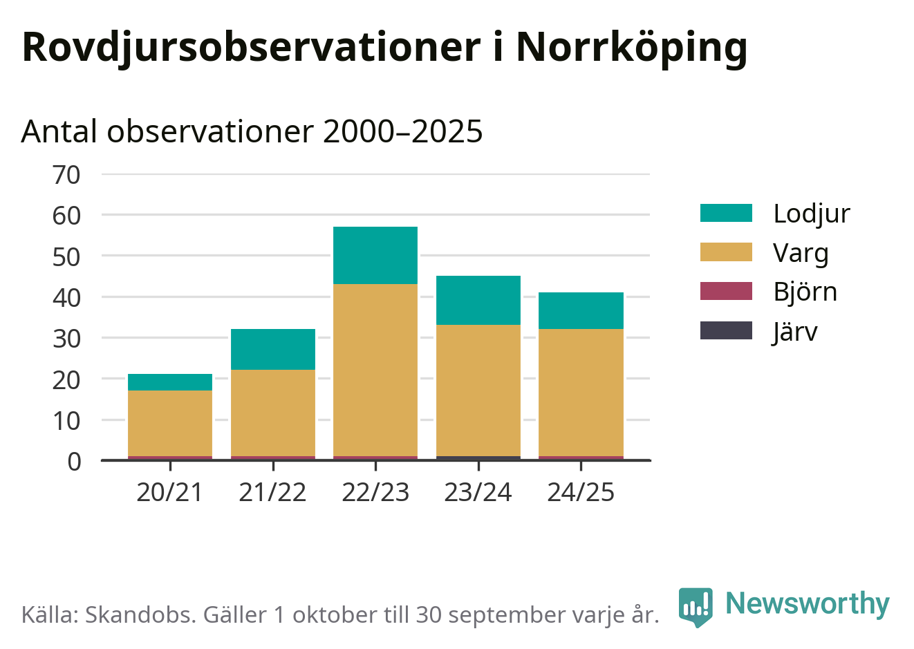 Där kan vem som helst rapportera sina observationer av de stora rovdjuren björn, varg, lodjur och järv. Mellan 1 oktober 2024 och 30 september i år har knappt 10 000 observationer registrerats i landet. Det kan vara synobservationer, foton, spår, spillning, döda bytesdjur eller andra tecken på rovdjursförekomst. I Norrköping handlar det om totalt 41 observationer av varg, lodjur eller björn.