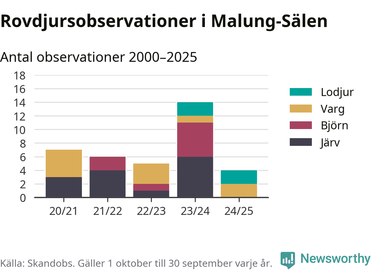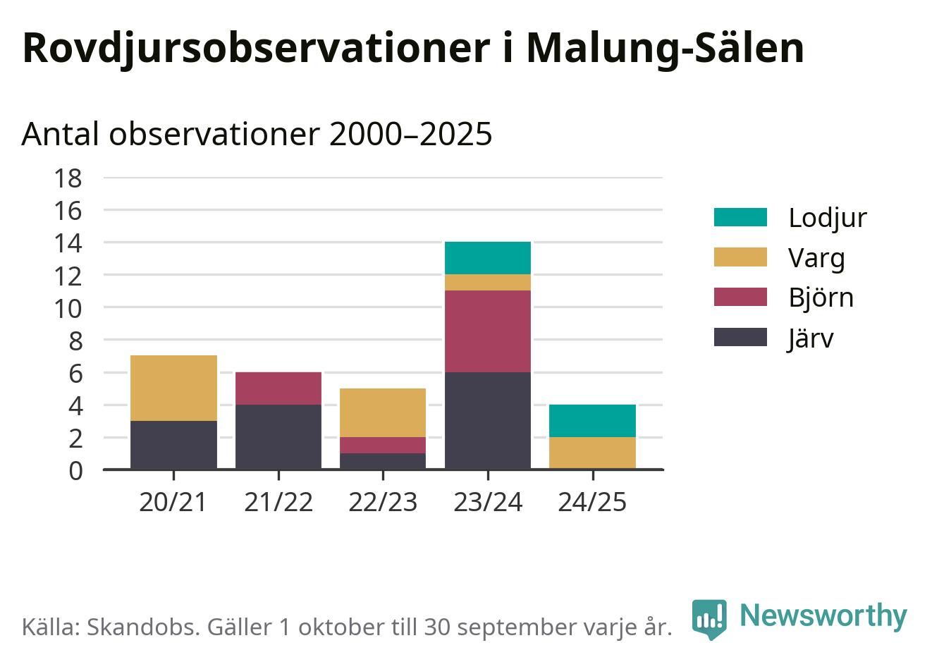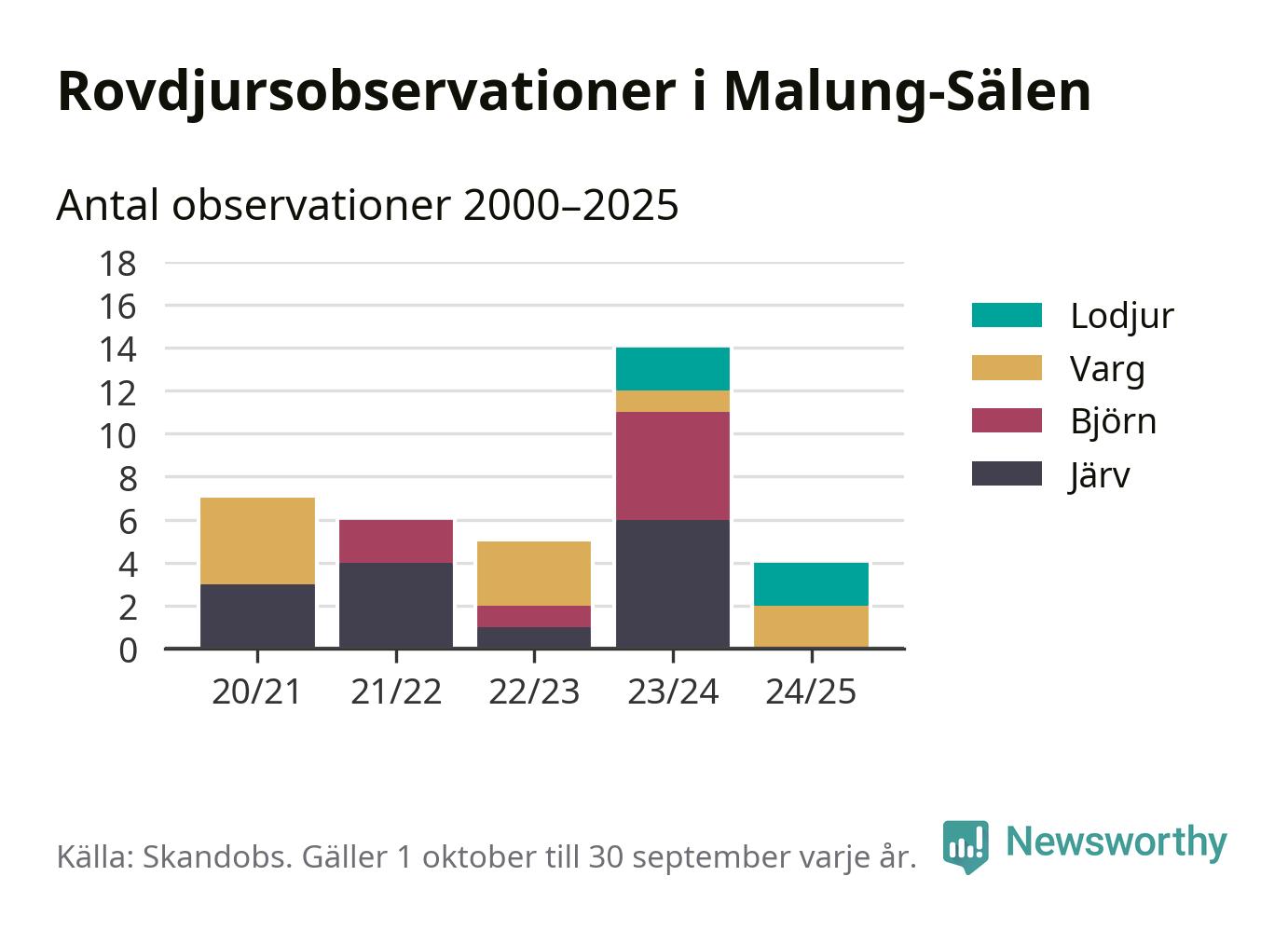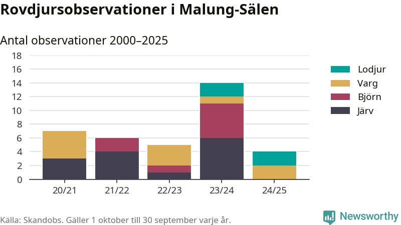 Där kan vem som helst rapportera sina observationer av de stora rovdjuren björn, varg, lodjur och järv. Mellan 1 oktober 2024 och 30 september i år har knappt 10 000 observationer registrerats i landet. Det kan vara synobservationer, foton, spår, spillning, döda bytesdjur eller andra tecken på rovdjursförekomst. I Malung-Sälen handlar det om totalt fyra observationer av lodjur eller varg.